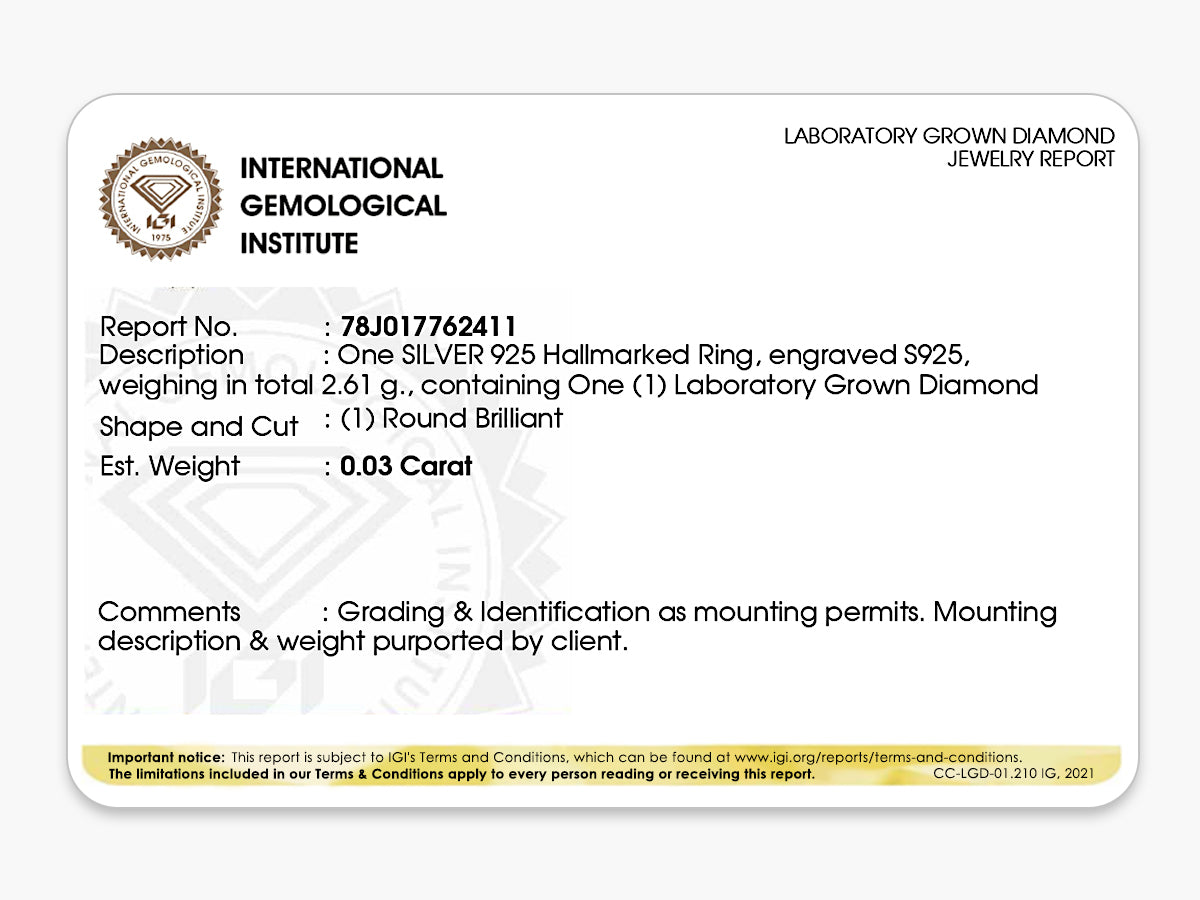 PASCAL certification is not an add-on—it is the foundation of every diamond we offer. Each lab-grown diamond used in our jewelry is independently examined and certified by the International Gemological Institute (IGI), confirming that it meets established international grading standards for cut, color, clarity, and carat weight.
