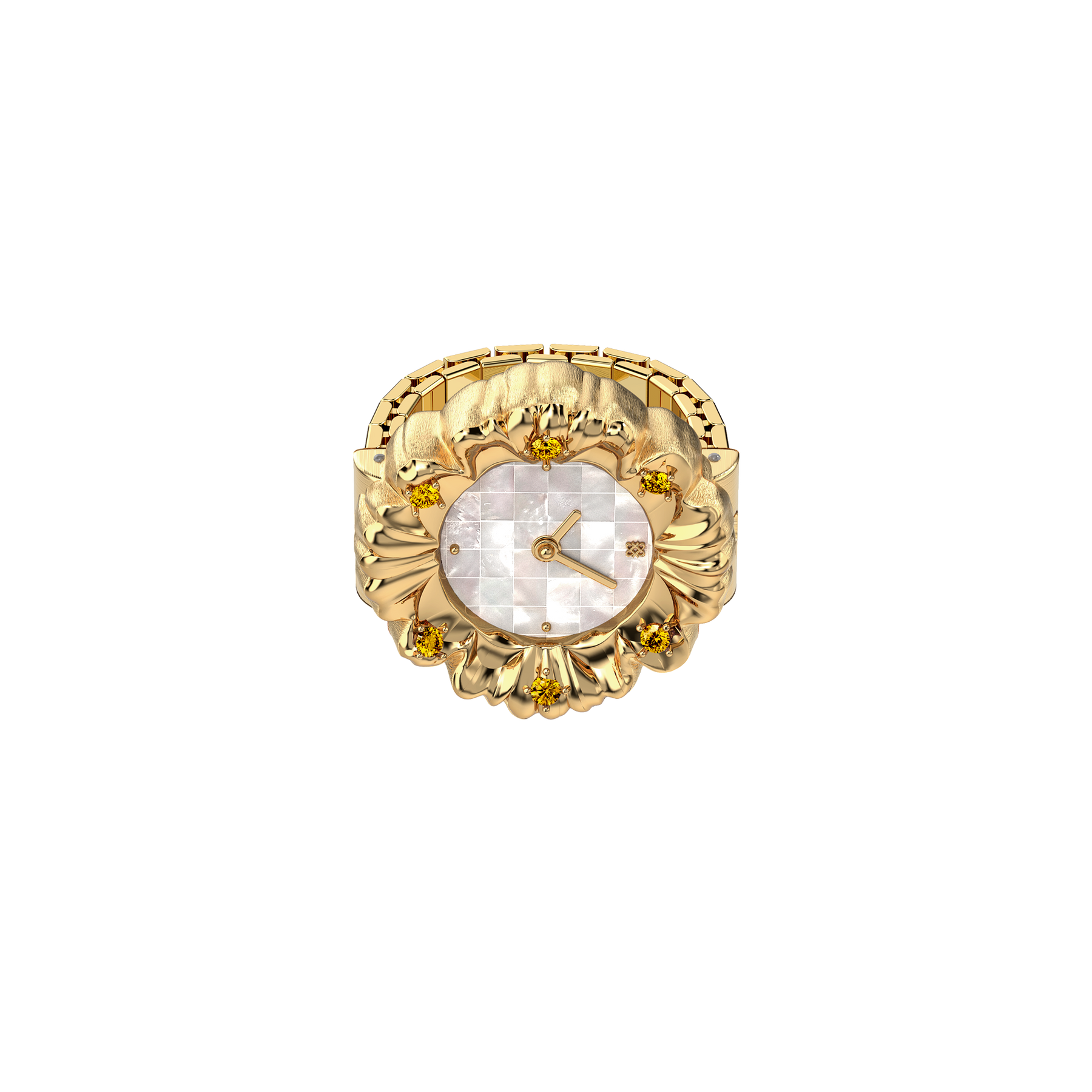 Inspiriert von der Architektur der Barockzeit verbindet diese Uhr Vintage-Glanz mit romantischer Symbolik. Das Zifferblatt ist ein Flickenteppich aus Perlmutt, der die Zeit leise in Luxus und Romantik fließen lässt. Funkelnde, im Labor gezüchtete Edelsteine verleihen dieser Miniaturuhr Glanz und Glamour und verstärken das luxuriöse Gefühl des Rings. Mehr als nur ein Accessoire, setzt diese Ringuhr die Bühne dafür, dass die Zeit mit klassischem Gewicht im Luxus tanzt.