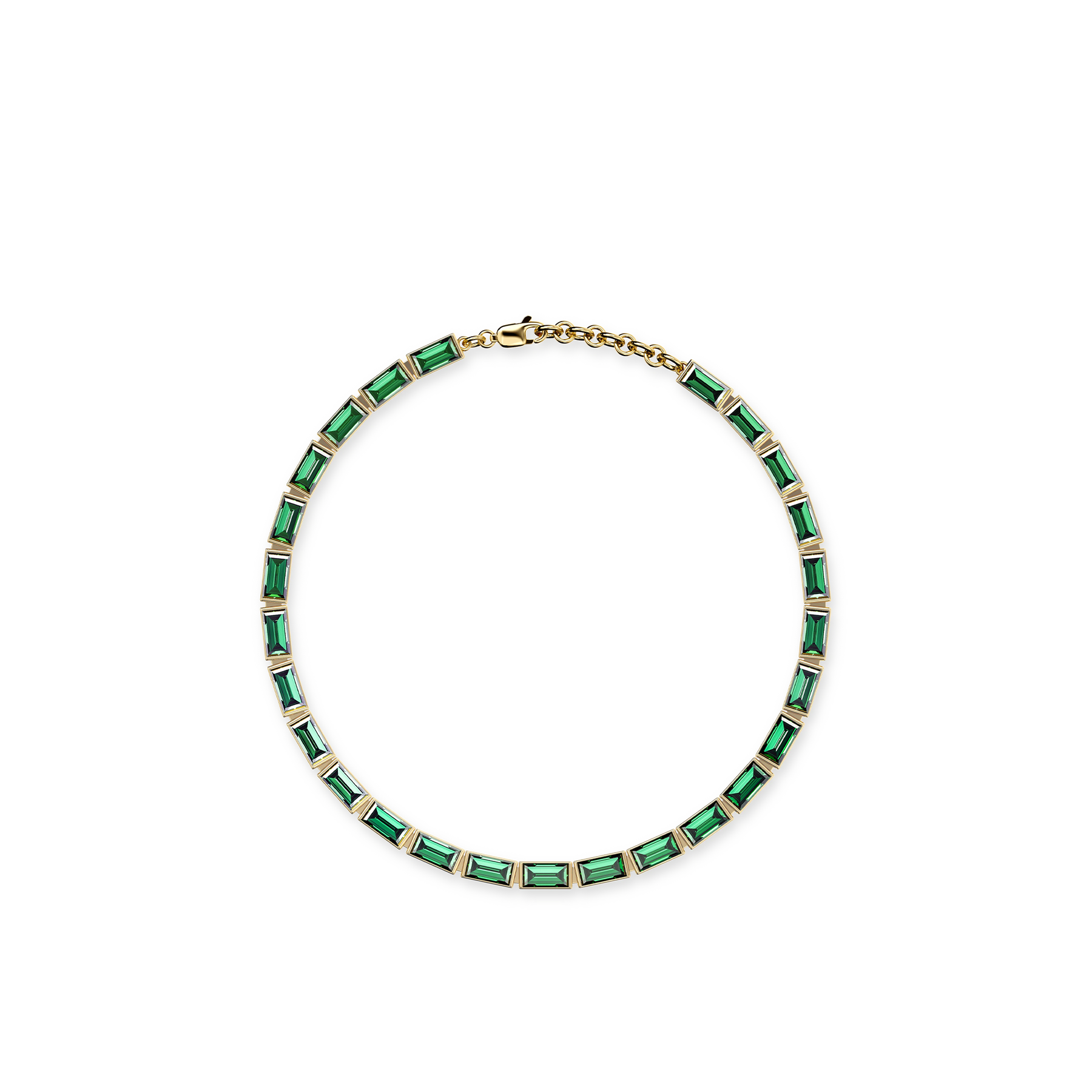 Ein klassisches Tennisarmband mit im Labor gezüchteten Edelsteinen im Baguetteschliff, erhältlich in Hellblau und Grün. Es spiegelt Schlichtheit und Luxus wider und fängt die Essenz eines erstklassigen Strandresorts ein, das elegant vor der ruhigen Meereskulisse schimmert.
