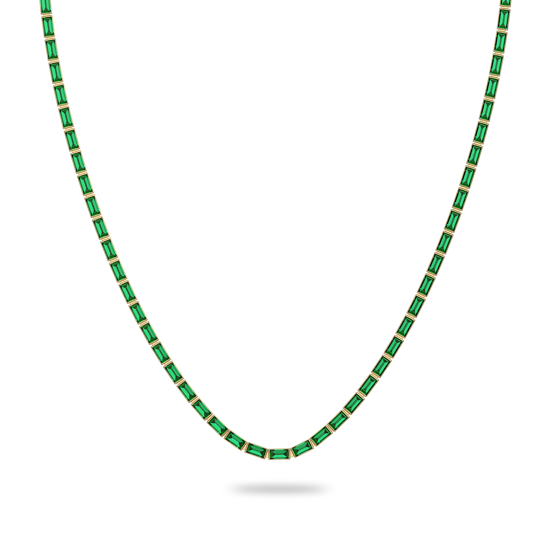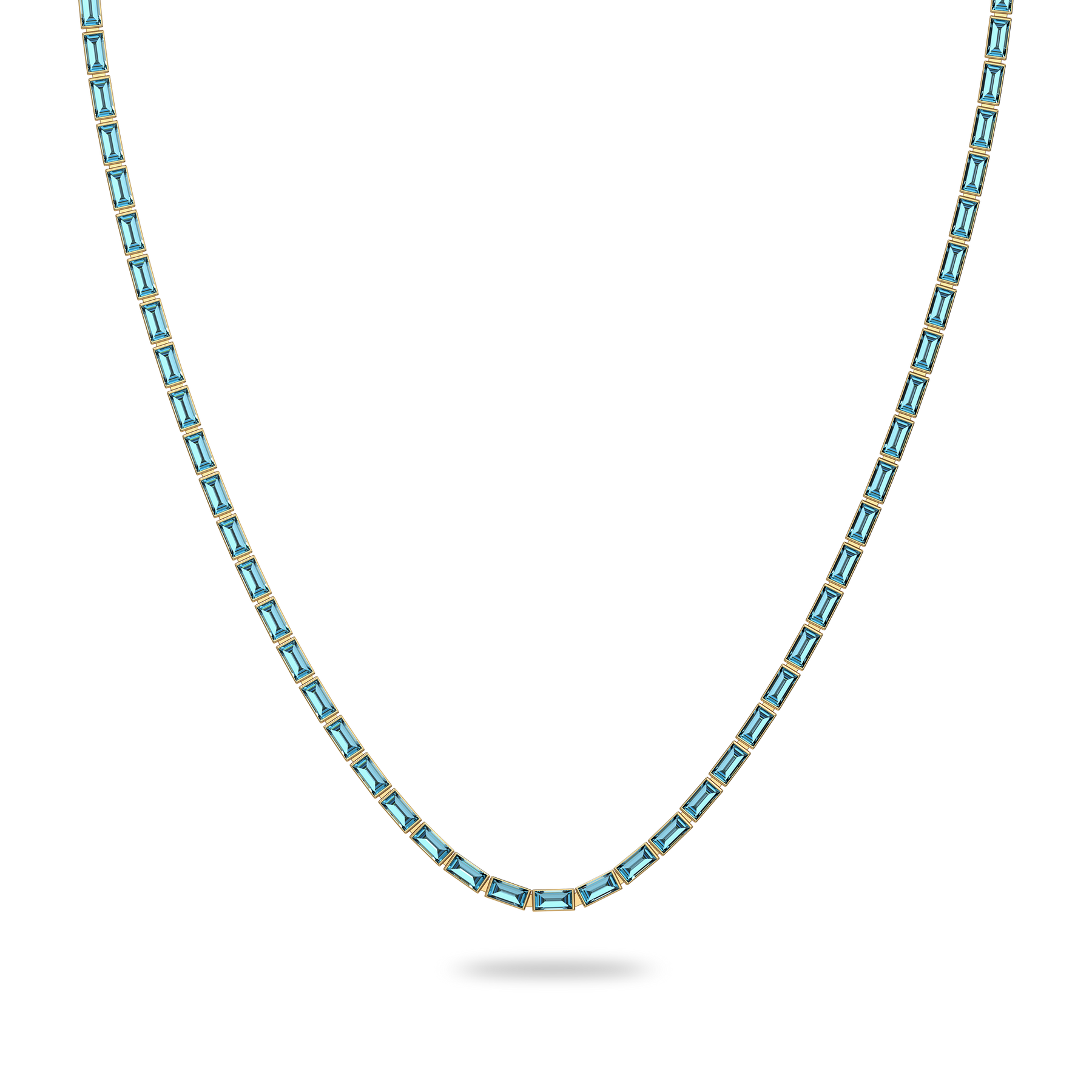 Eine klassische Tennis-Halskette mit im Labor gezüchteten Edelsteinen im Baguette-Schliff, erhältlich in Hellblau und Grün. Sie spiegelt Einfachheit und Luxus wider und fängt das Wesen eines exklusiven Strandurlaubs ein, der elegant im ruhigen Meereswind schimmert.