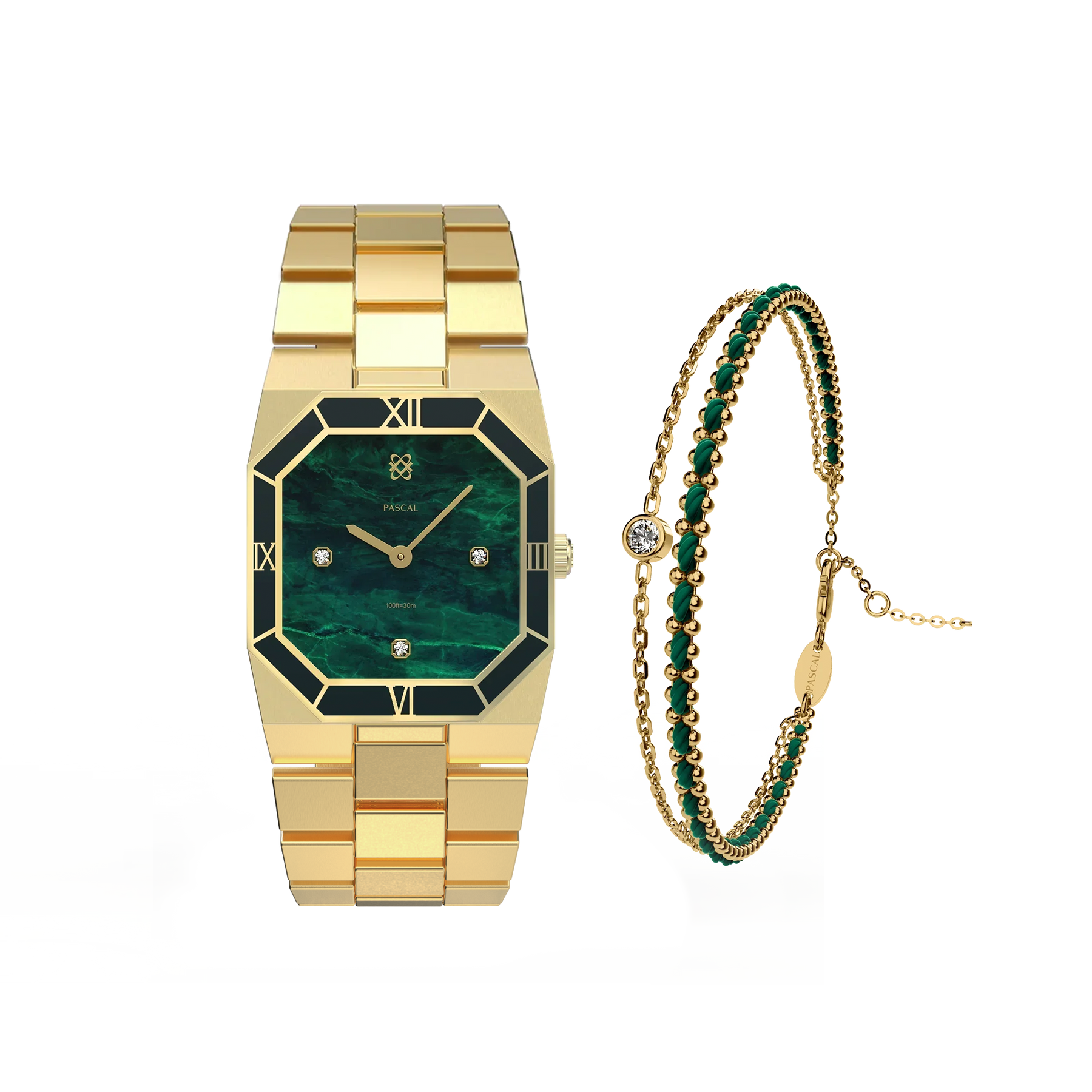Diese distinguierte Uhr verfügt über ein sorgfältig gestaltetes Zifferblatt mit grünem Marmor-Muster und eine Emaille-Lünette mit römischen Ziffern. Das gesamte Gehäuse ist goldfarben, mit einem achteckigen Gehäuse, das von Vintage-Elementen inspiriert ist. Veredelt mit im Labor gezüchteten Diamanten, verbindet diese Uhr Vergangenheit und Gegenwart und feiert zeitloses Design mit einem modernen Twist.