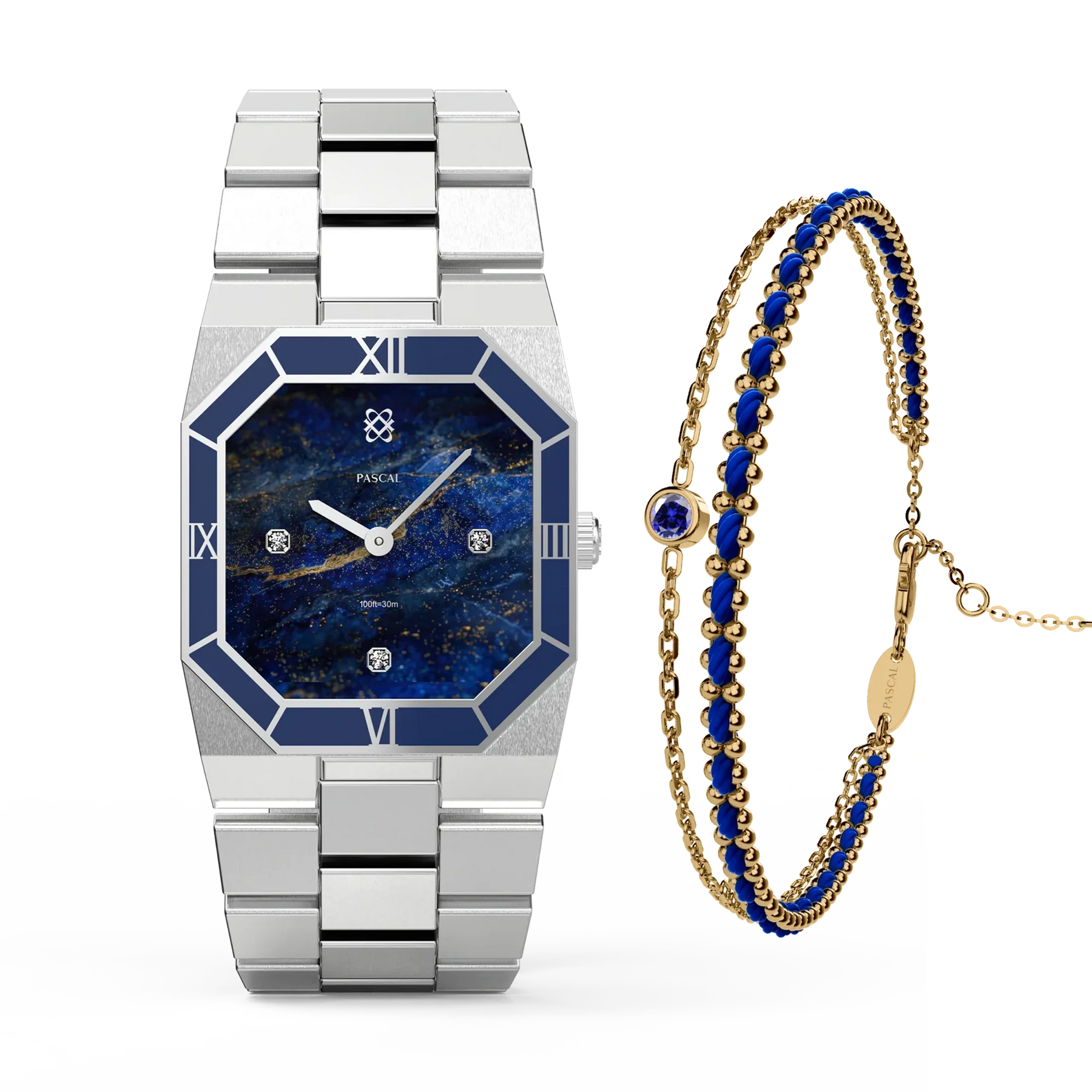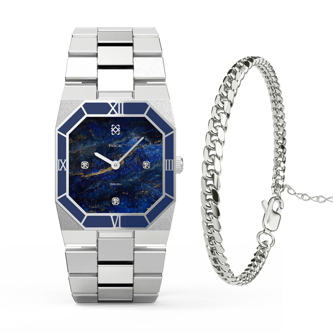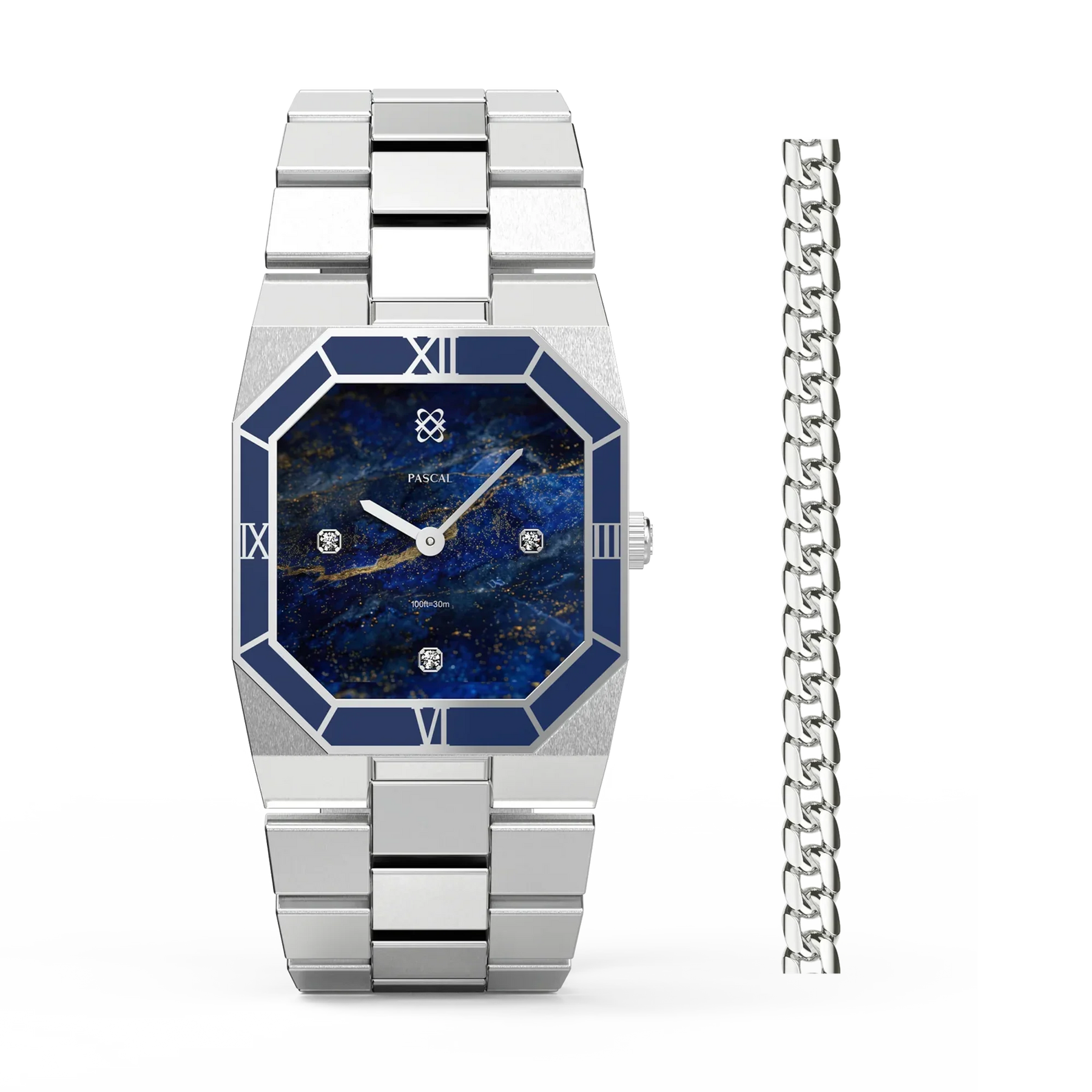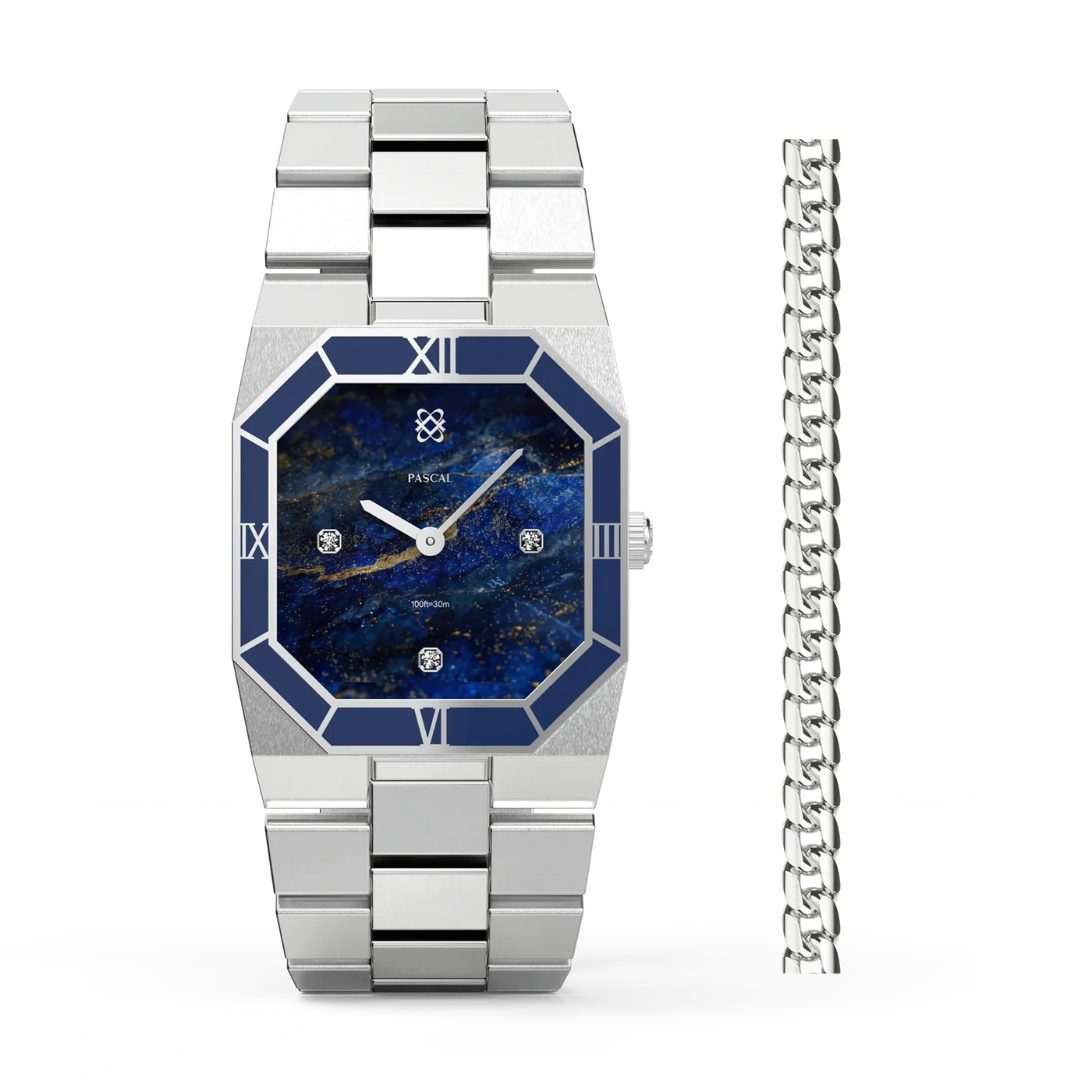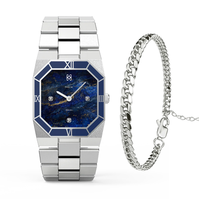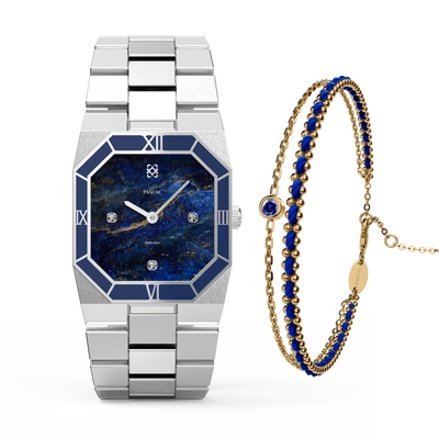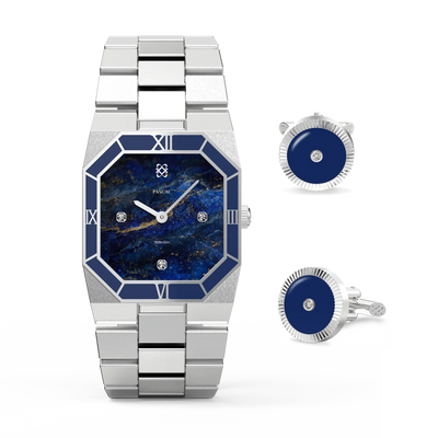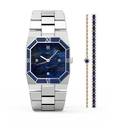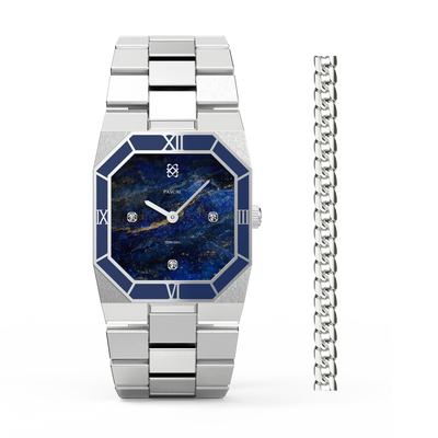 Diese atemberaubende Uhr präsentiert ein sorgfältig ausgewähltes Zifferblatt mit Lazurit-Muster, das an einen strahlenden Nachthimmel erinnert. Ergänzt durch eine tiefblaue Emaille-Lünette strahlt sie eine Aura von Raffinesse aus. Untergebracht in einem achteckigen Edelstahlgehäuse mit im Labor gezüchteten Diamantakzenten, verbindet dieses Zeitmesser nahtlos klassische Inspiration mit zeitgenössischer Eleganz und verkörpert eine zeitlose Vereinigung von Alt und Neu.
