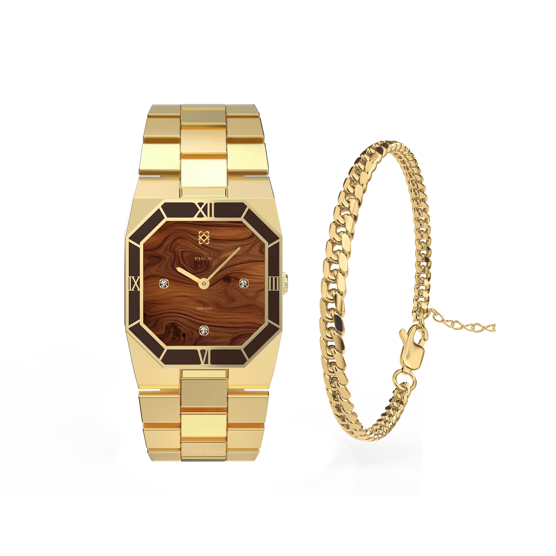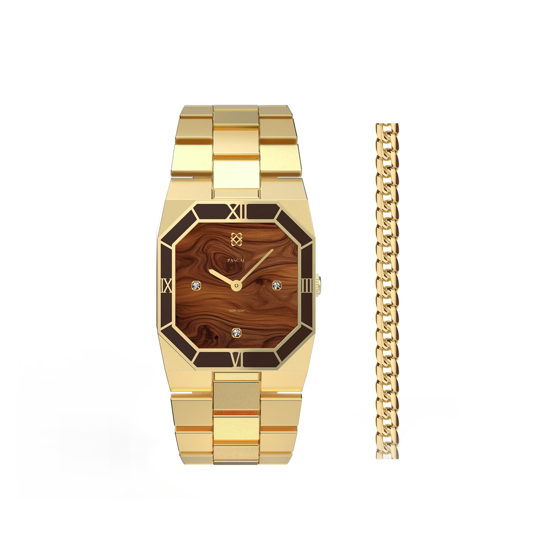 Ein sattes mokkabraunes Zifferblatt mit einer Lünette aus Roségold und einem Metallgliederarmband in abwechselnden Roségold- und Silbertönen charakterisiert diese Uhr. Das achteckige Gehäusedesign strahlt Vintage-Ästhetik aus, wird durch im Labor gezüchtete Diamanten noch verstärkt und symbolisiert eine harmonische Verbindung zwischen Vergangenheit und Gegenwart.