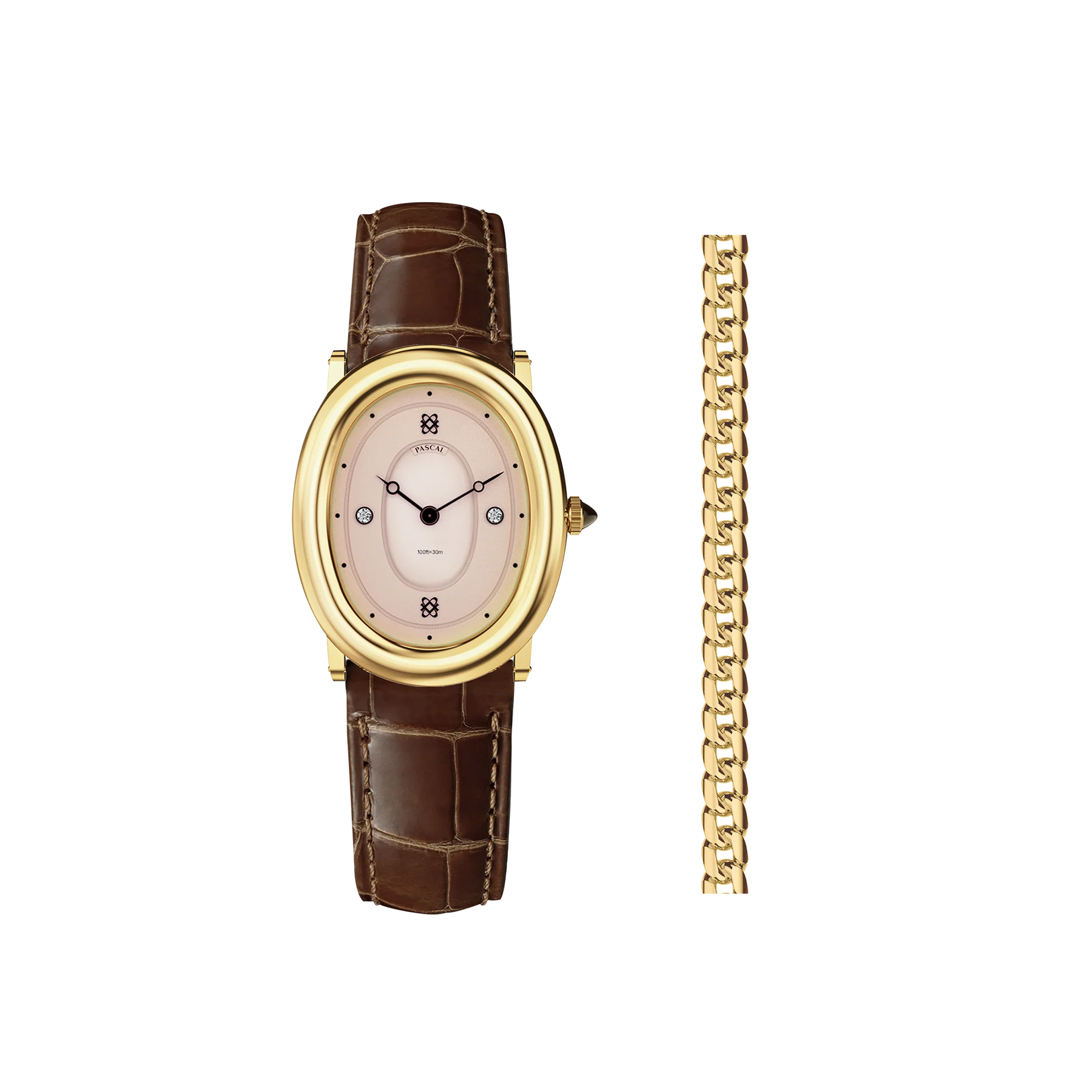 Mit einem ovalen Zifferblatt und einer sich ausdehnenden Lünette, die an einen verlockenden Donut erinnert, ist diese Uhr wirklich faszinierend. Das doppellagige Zifferblatt ist einzigartig in einem klassischen Lachsfarbton getönt und verkörpert die Spuren der Zeit, während sie anmutig fließt. Schimmernde Diamanten ersetzen die Markierungen bei 3 und 9 Uhr. Kombiniert mit einem eleganten braunen Armband mit Krokodilstruktur strahlt das Gesamtdesign zurückhaltende Noblesse aus.