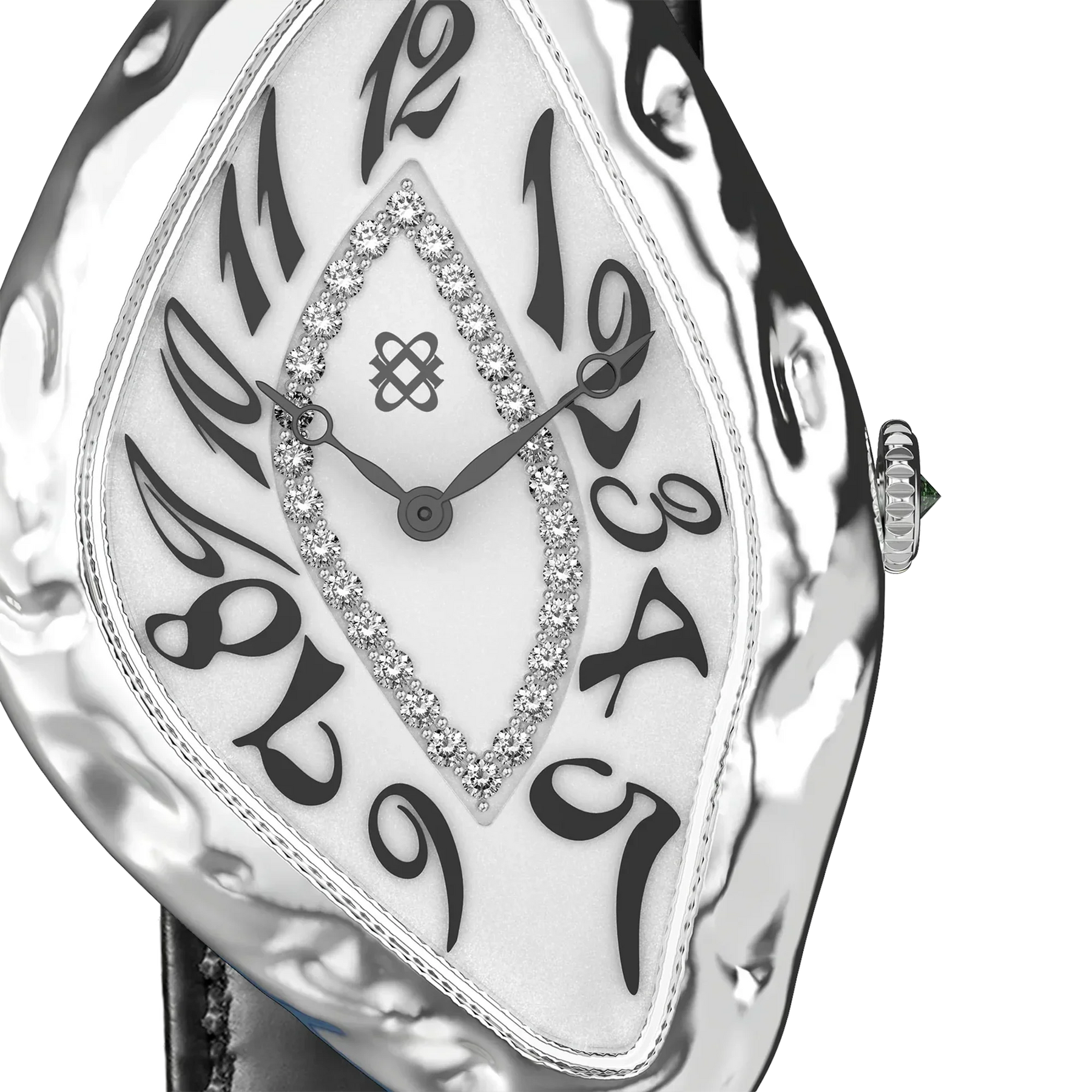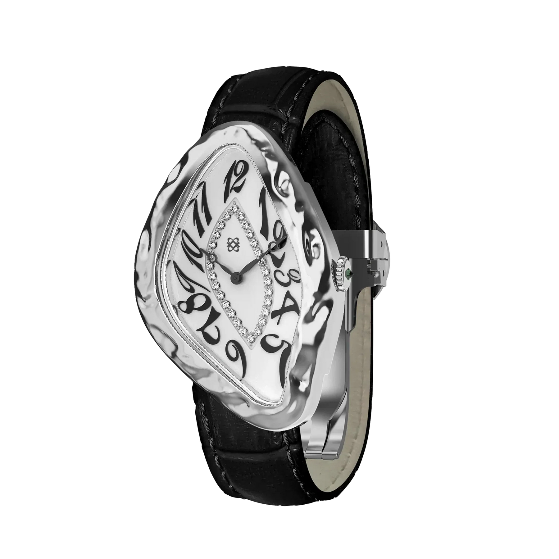 Die markante Form der Uhr wird durch einen Kreis aus Diamanten in der Mitte betont, der insgesamt 0,28 Karat umfasst. An der Seite ist die Krone mit einem 0,02 Karat großen, invertiert gefassten Diamanten verziert, der das Thema der Uhr symbolisiert, dass die Zeit rückwärts fließt. Mehr als nur ein Zeitmessgerät ist diese Uhr ein Zeugnis für die Fluidität der Zeit selbst. Die Paradoxe Diamond Watch zeigt nicht nur die Zeit an – sie stellt unsere Wahrnehmung davon in Frage. Sie erinnert uns daran, dass, während wir voranschreiten, unsere geschätzten Erinnerungen immer bei uns sind, so beständig wie die Diamanten, die dieses bemerkenswerte Zeitmessgerät schmücken.