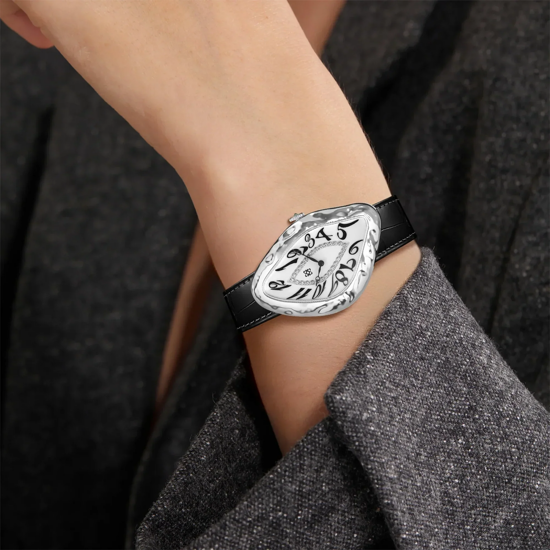 Wir stellen unsere Paradoxe Diamond Watch vor – eine Uhr, die Konventionen herausfordert und das Wesen der fließenden Zeit einfängt. Diese außergewöhnliche Uhr verfügt über ein Gehäuse, das von der fließenden Bewegung von Flüssigkeiten inspiriert ist und an einen Zeitriss erinnert. So wie eine Uhr die Zeit misst, bewahrt sie auch die kostbaren Momente des Lebens.