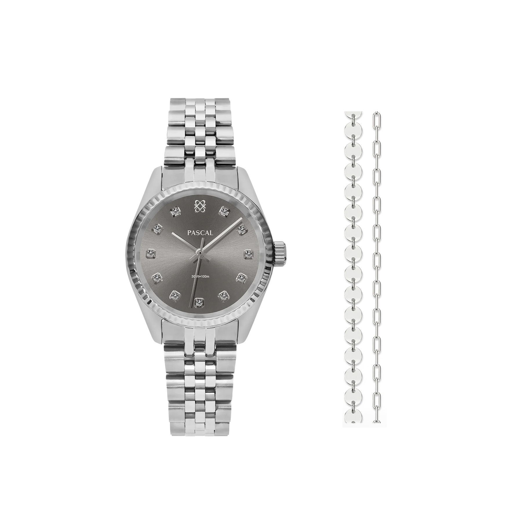 Eine Uhr, die zeitlose Eleganz verkörpert. Mit exquisiter Präzision gefertigt, zeigt ihr silbergrauer metallischer Reiz eine nahtlose Verbindung von Kunstfertigkeit und Technik. Nicht nur eine gewöhnliche Uhr, sondern ein Meisterwerk der Handwerkskunst, das als Leuchtturm für Stil und Raffinesse steht.