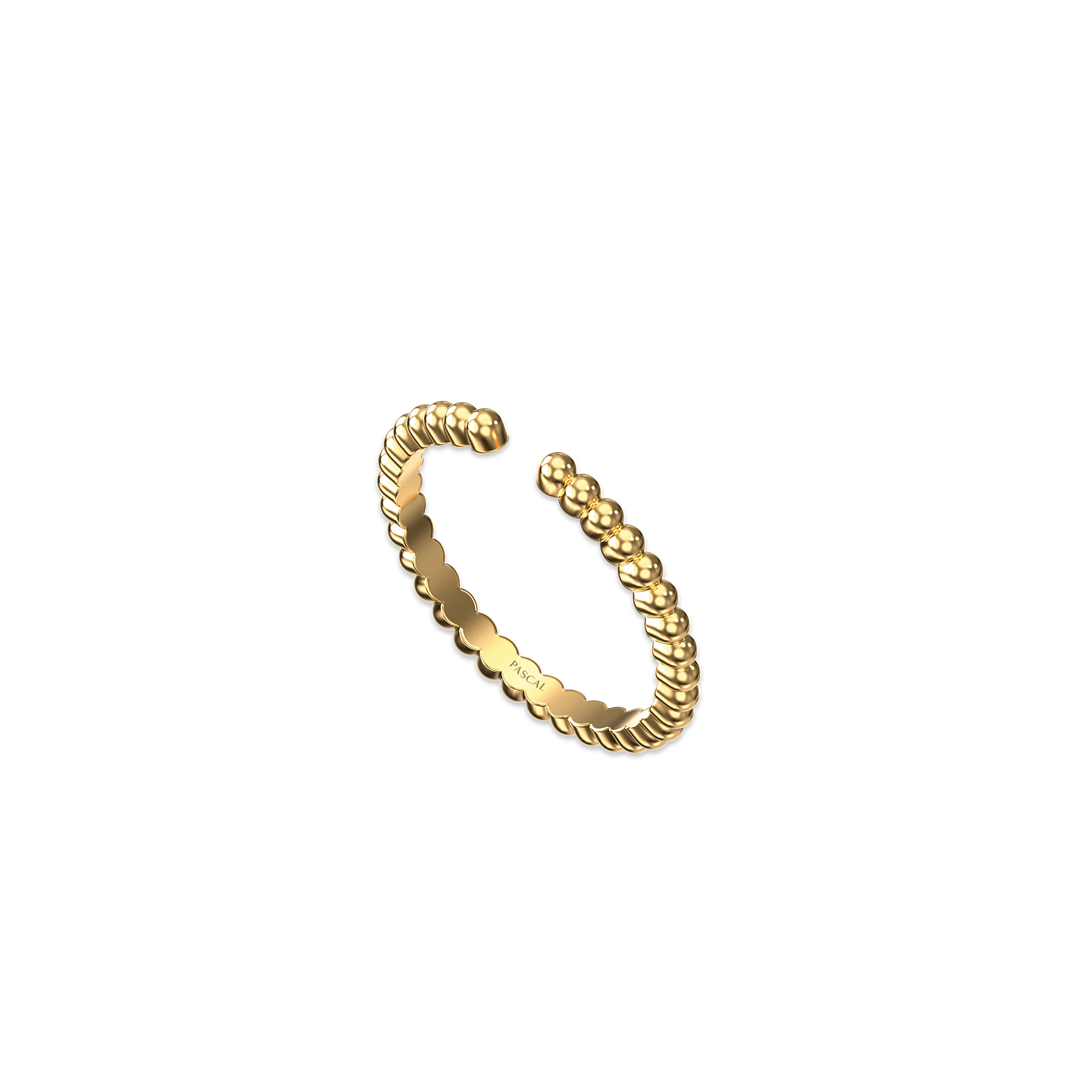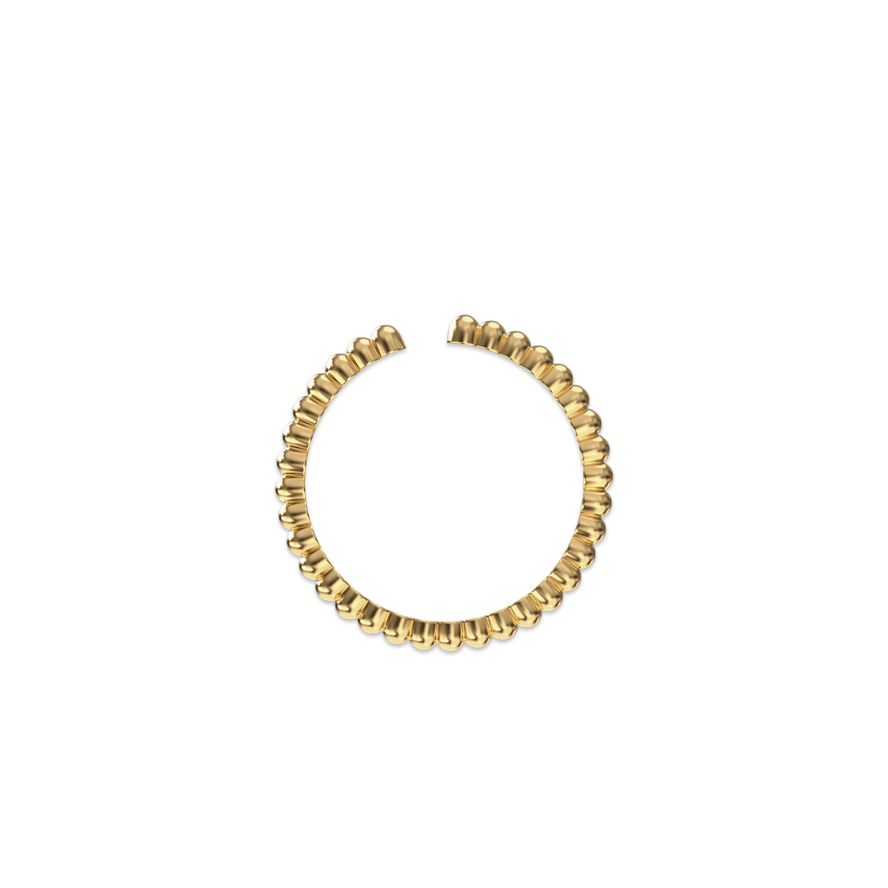 Una exploración de la continuidad circular y la belleza del espacio. Este anillo está compuesto por cuentas cilíndricas alineadas con precisión, donde la luz se desliza suavemente por cada superficie curva, y cada esfera hace eco de la siguiente en una proporción armoniosa: un ritmo tanto suave como deliberado.