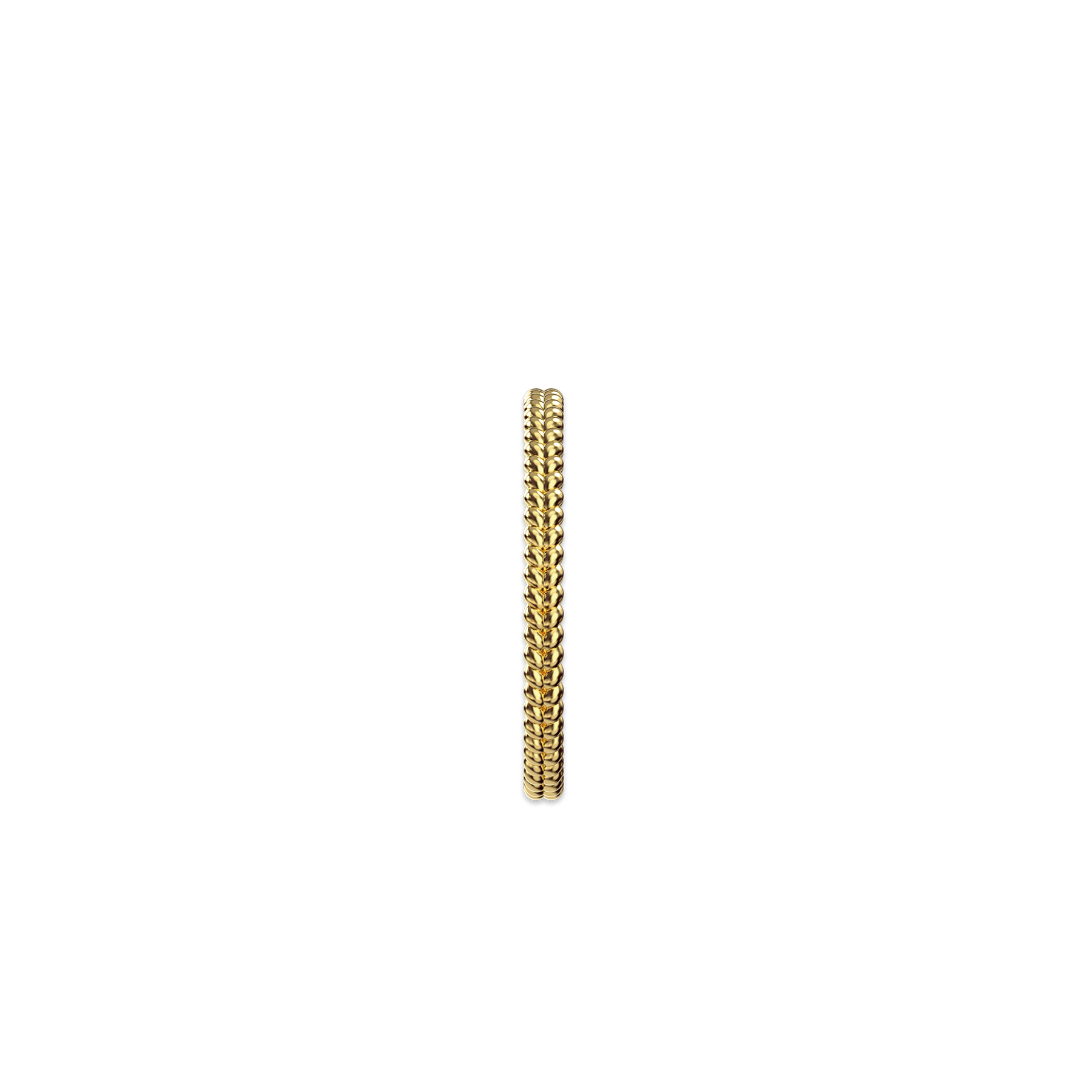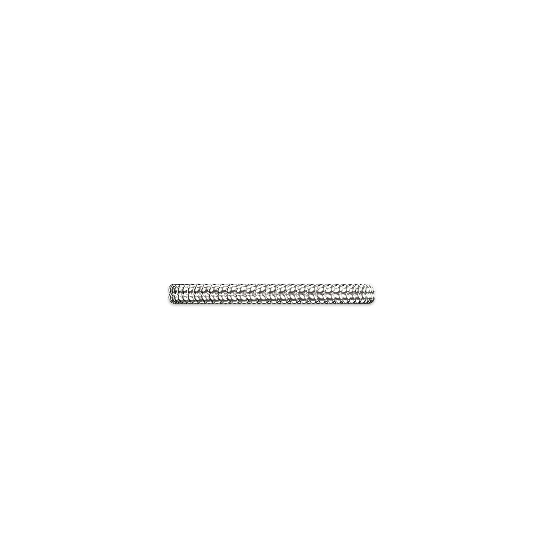 Con líneas minimalistas que capturan la tensión del detalle, este anillo está elaborado con texturas de doble cuerda, donde las curvas suaves y el brillo metálico crean un equilibrio refinado sobre la mano.