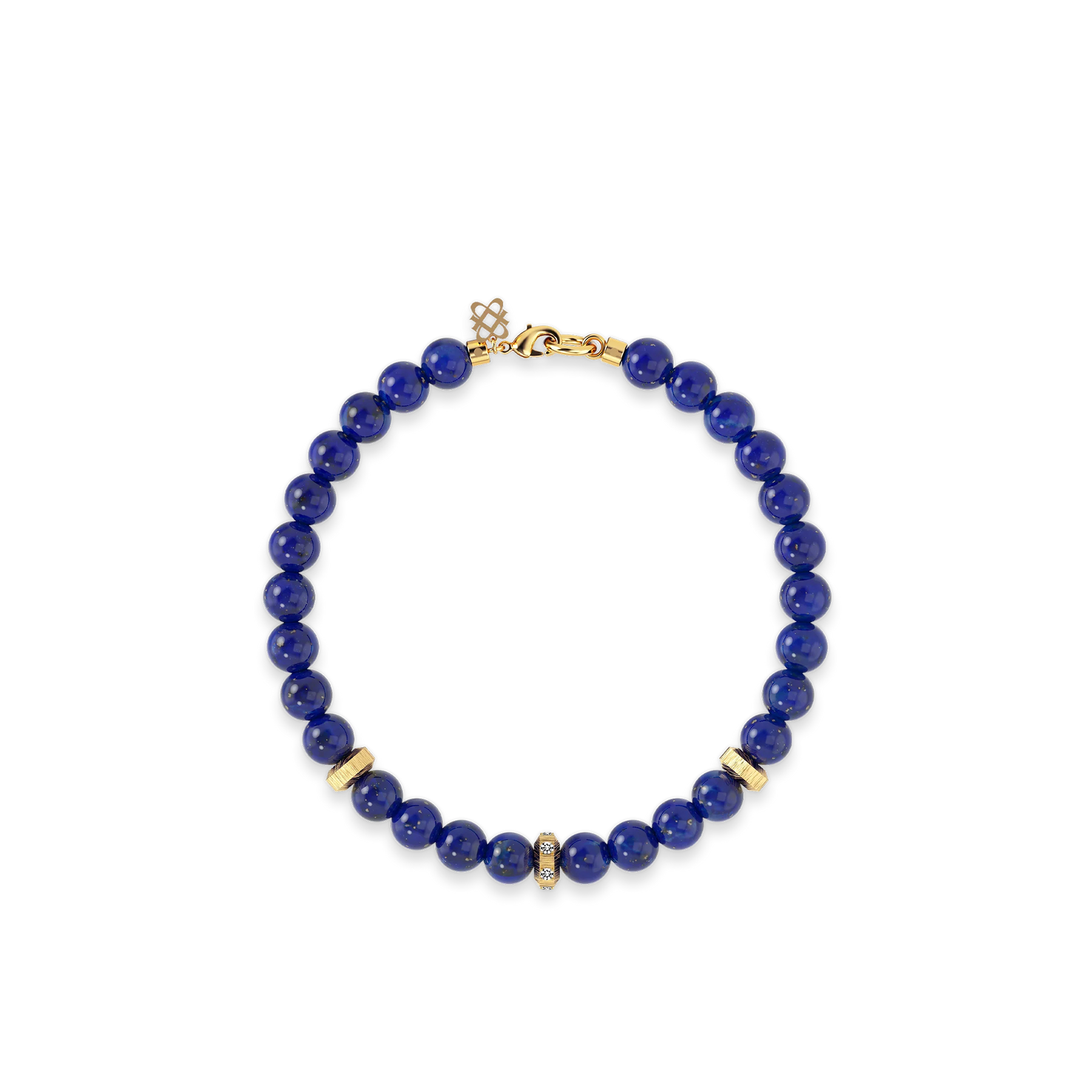 Esta pulsera presenta cuentas redondas de lapislázuli natural de 6 mm con un color rico y vívido, acentuadas por elementos metálicos hexagonales y seis diamantes blancos cultivados en laboratorio que añaden un brillo sutil a su elegante calma. El diseño de un solo lazo se ajusta cómodamente alrededor de la muñeca y se combina hermosamente con otras piezas. Ideal para el uso diario o momentos de meditación, ayuda a despertar la claridad y la fuerza desde el interior.