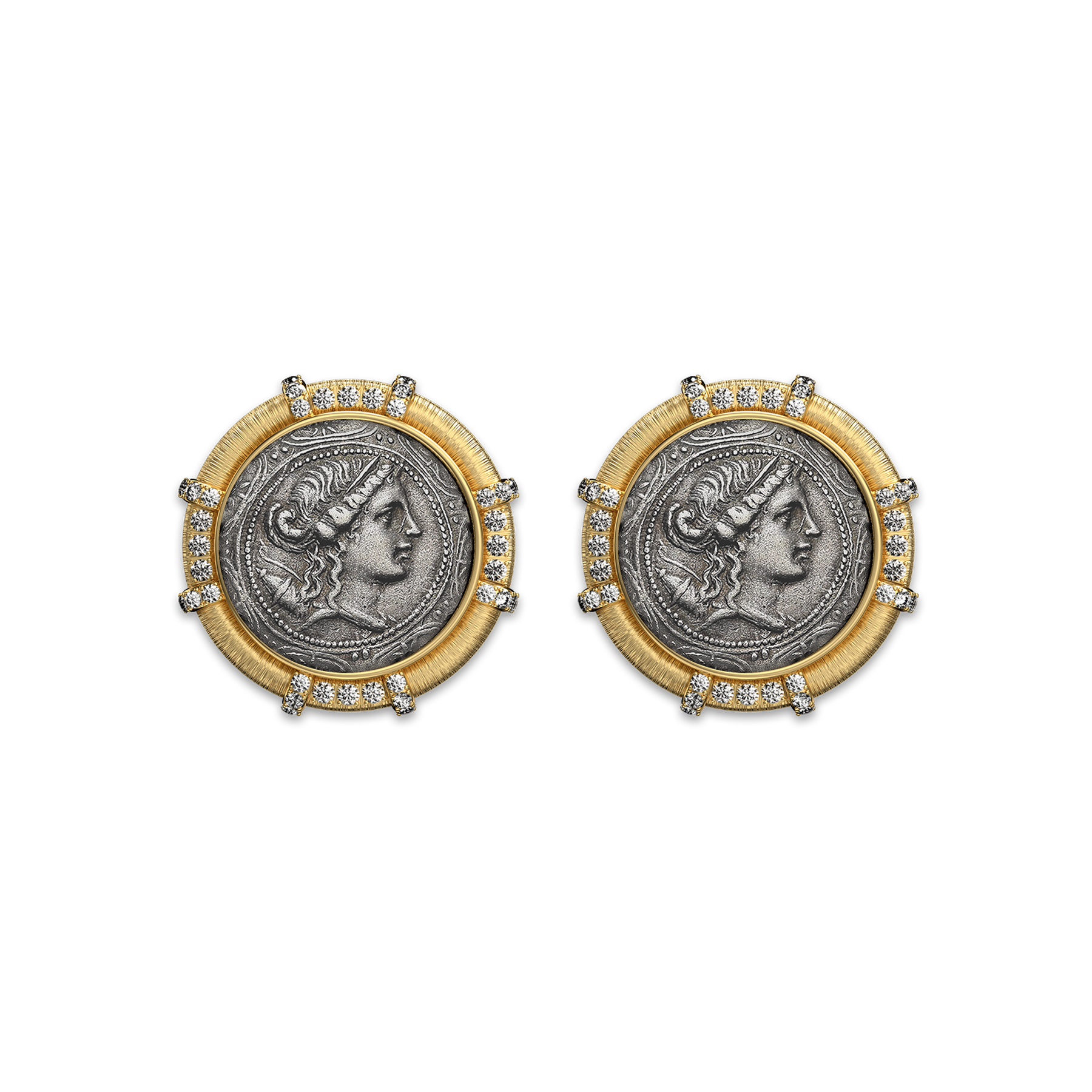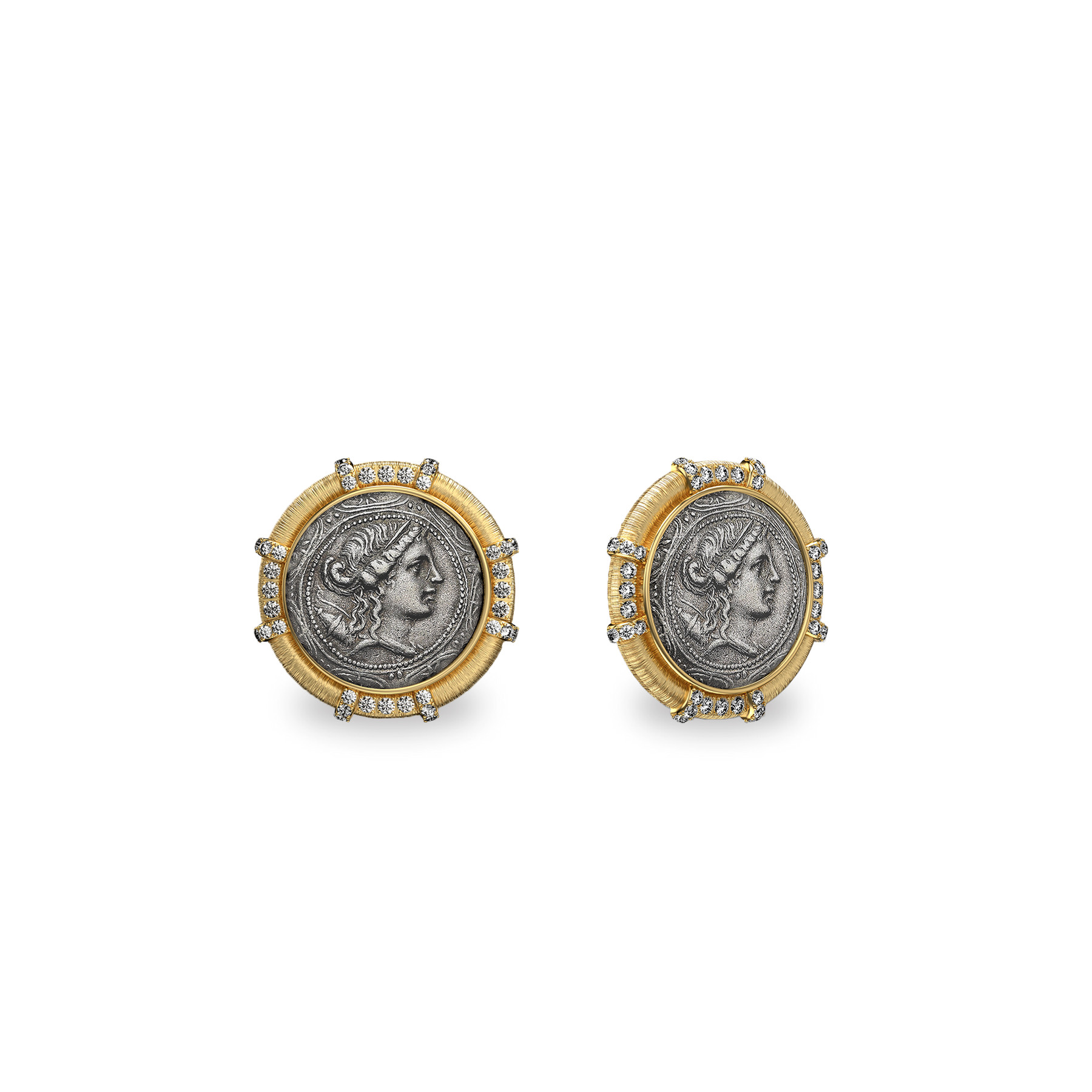 Los pendientes están enmarcados en un diseño redondo cepillado, acentuado con múltiples diamantes cultivados en laboratorio. Su brillo resplandeciente contrasta con la textura antigua de la moneda, creando un equilibrio perfecto entre la herencia clásica y la elegancia moderna.
