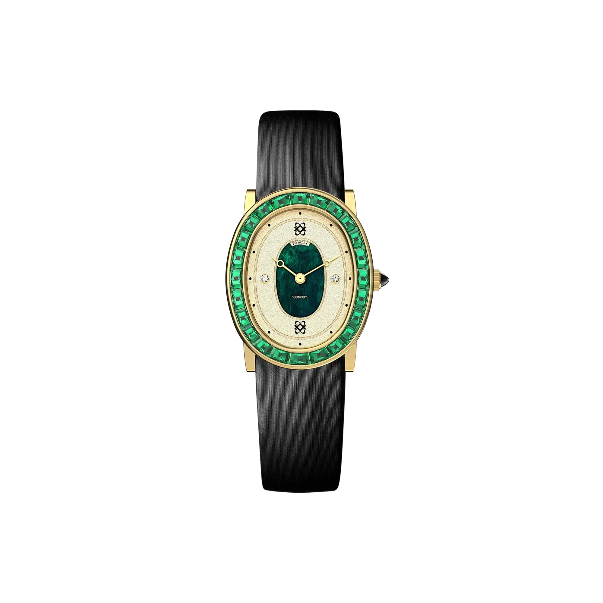 Irradiando sofisticación, este reloj presenta una silueta elíptica adornada con un círculo de encantadoras gemas verdes de laboratorio con corte trapezoidal, enmarcadas por una lujosa caja de acero inoxidable chapado en oro. Combinado con una correa de cuero negra con rayas verticales, su esfera capta la atención con dos brillantes diamantes de laboratorio en medio de un cautivador juego de luces sobre una intrincada textura de oro claro y un hipnotizante patrón de mármol verde.