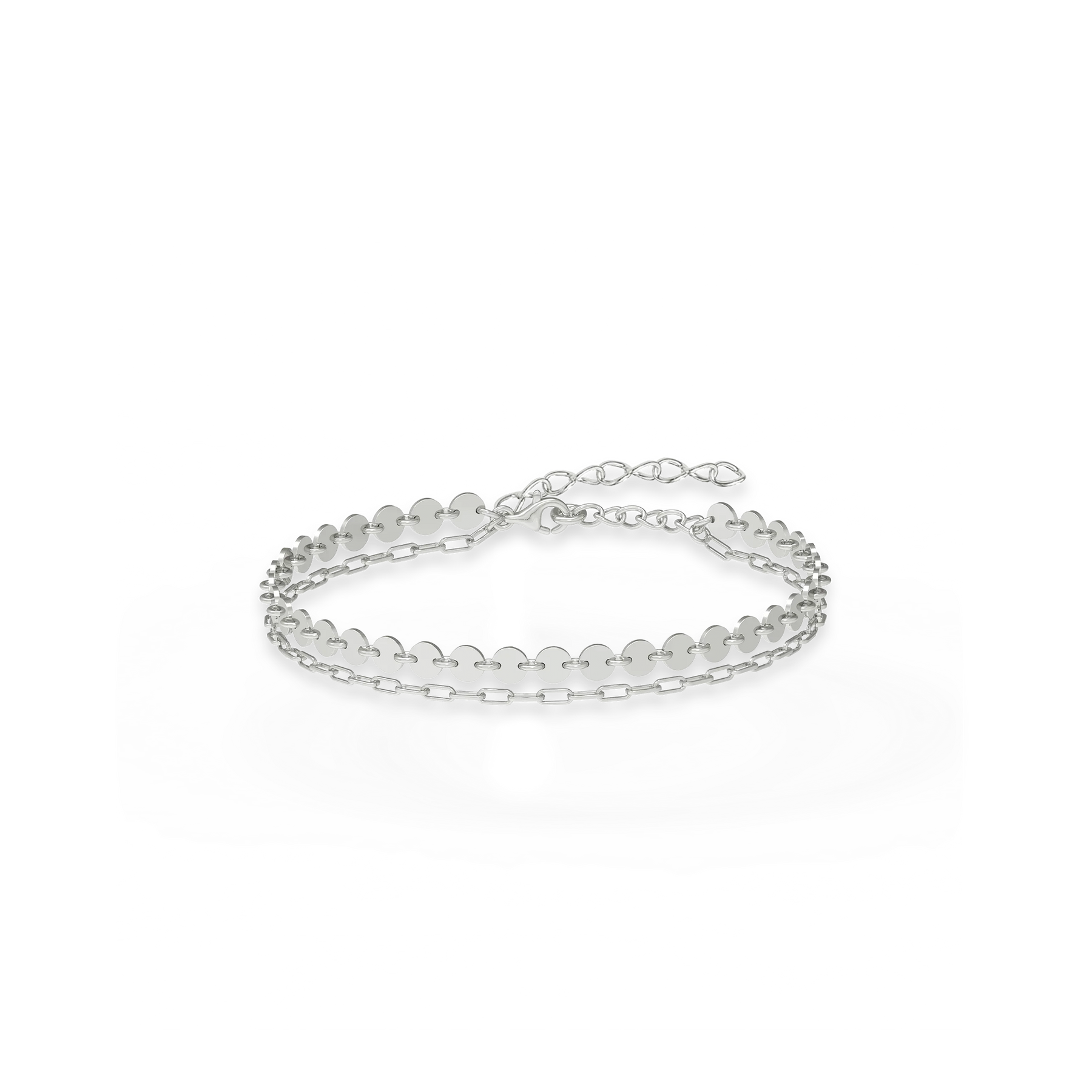 La capa superior presenta una cadena redonda con acabado espejo que capta la luz con cada movimiento, mientras que la cadena rectangular añade estructura y un contraste elegante y minimalista.