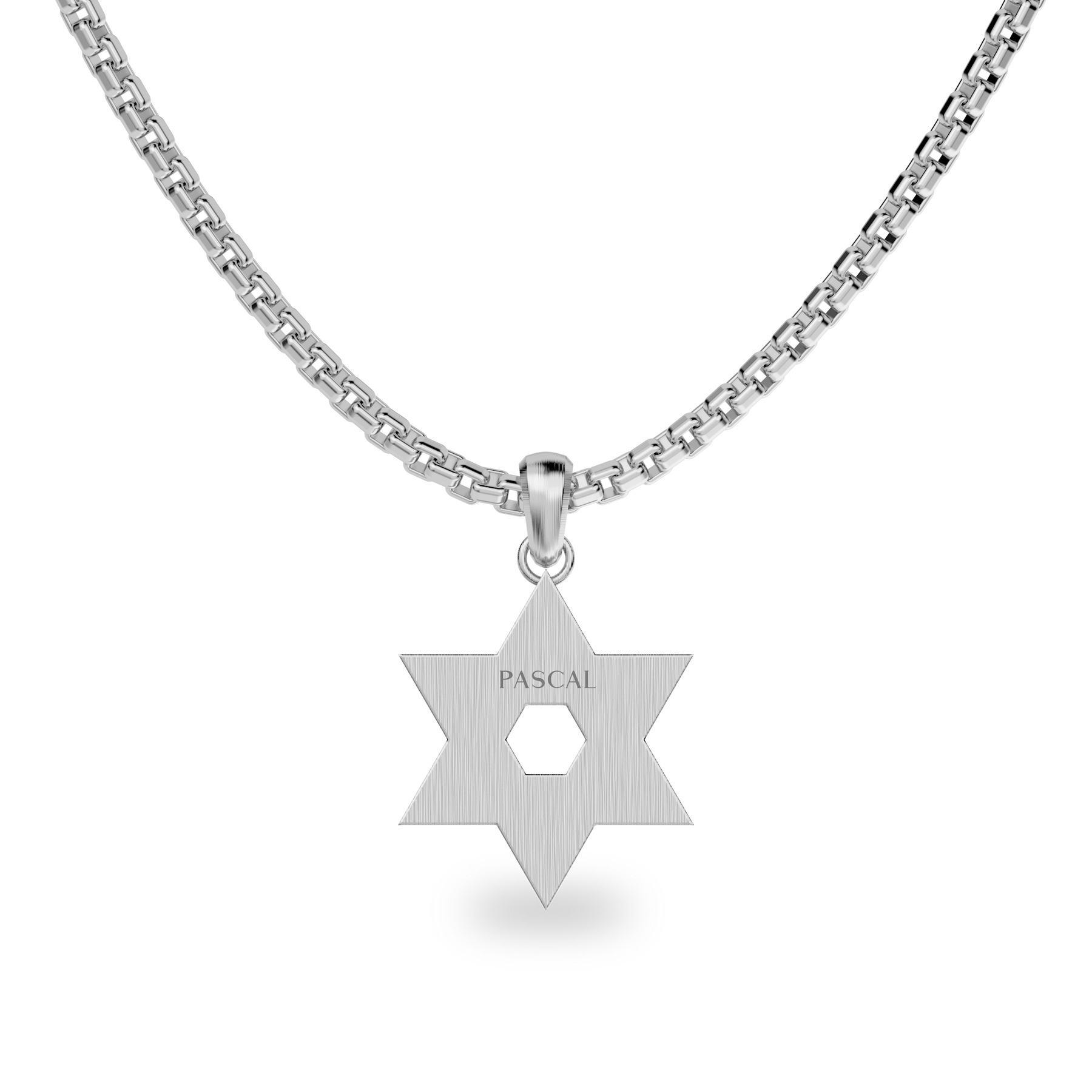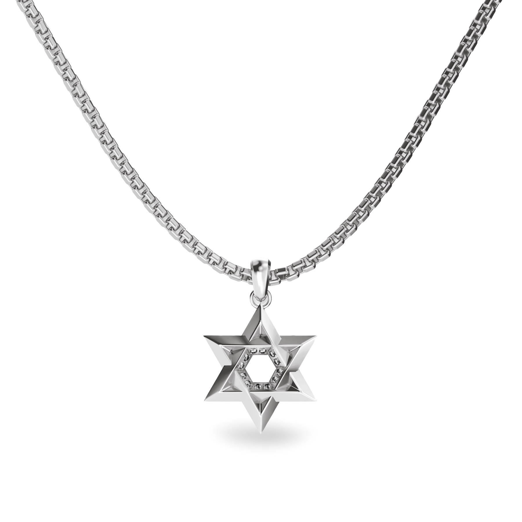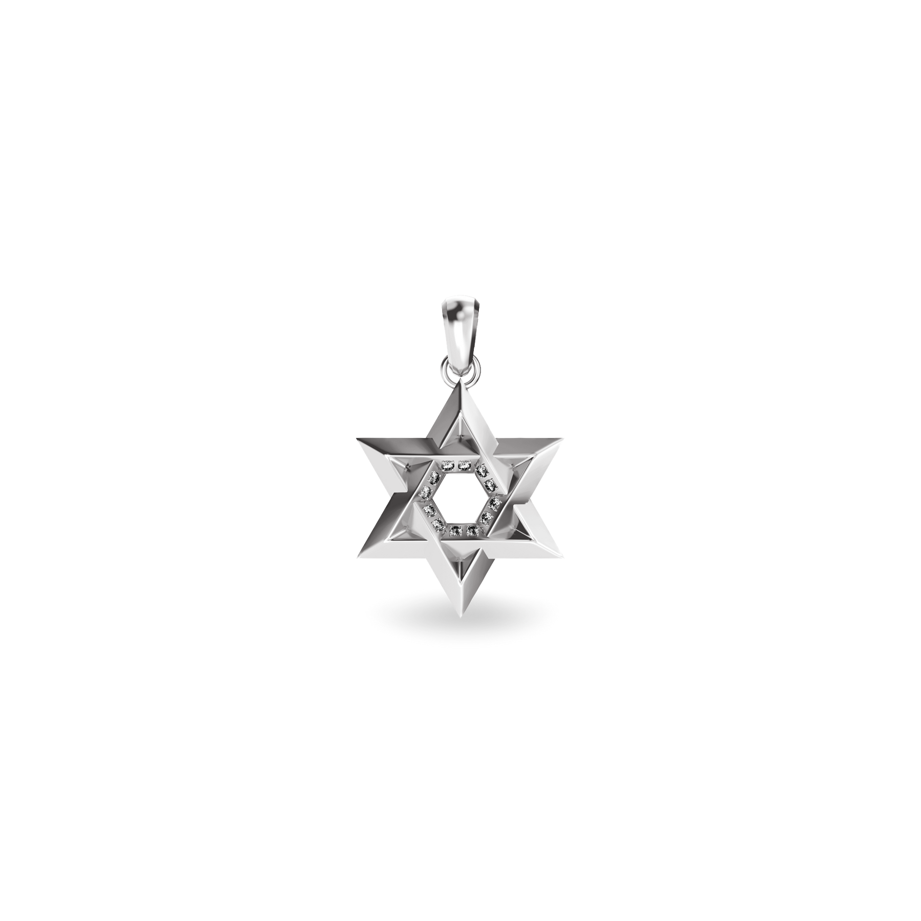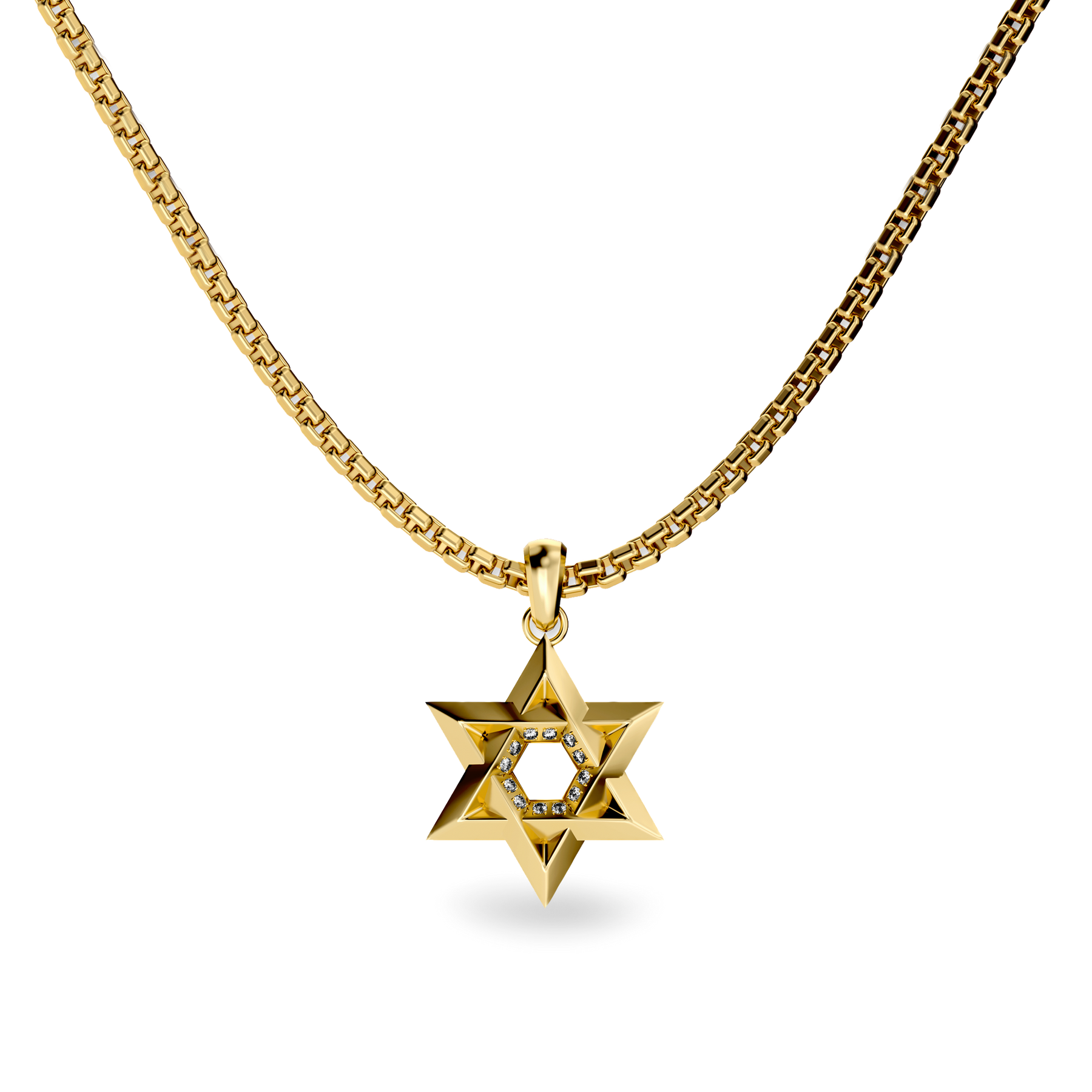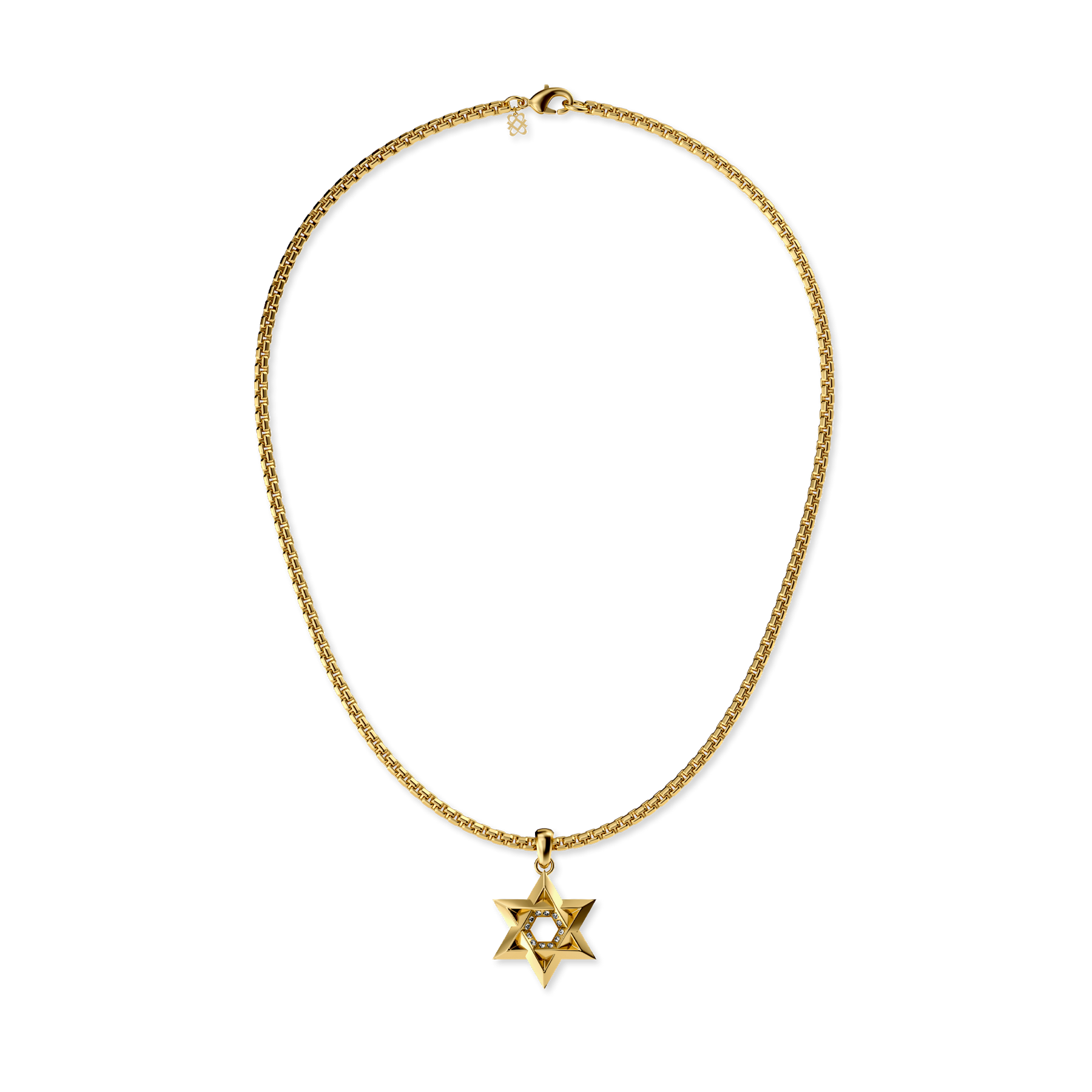 Este colgante de Estrella de David está delineado con líneas geométricas refinadas, su diseño tridimensional añade una sensación de profundidad y estructura. En el centro, un hexágono está engastado con múltiples diamantes cultivados en laboratorio, brillando como estrellas que lo rodean y irradiando un resplandor luminoso y profundo.