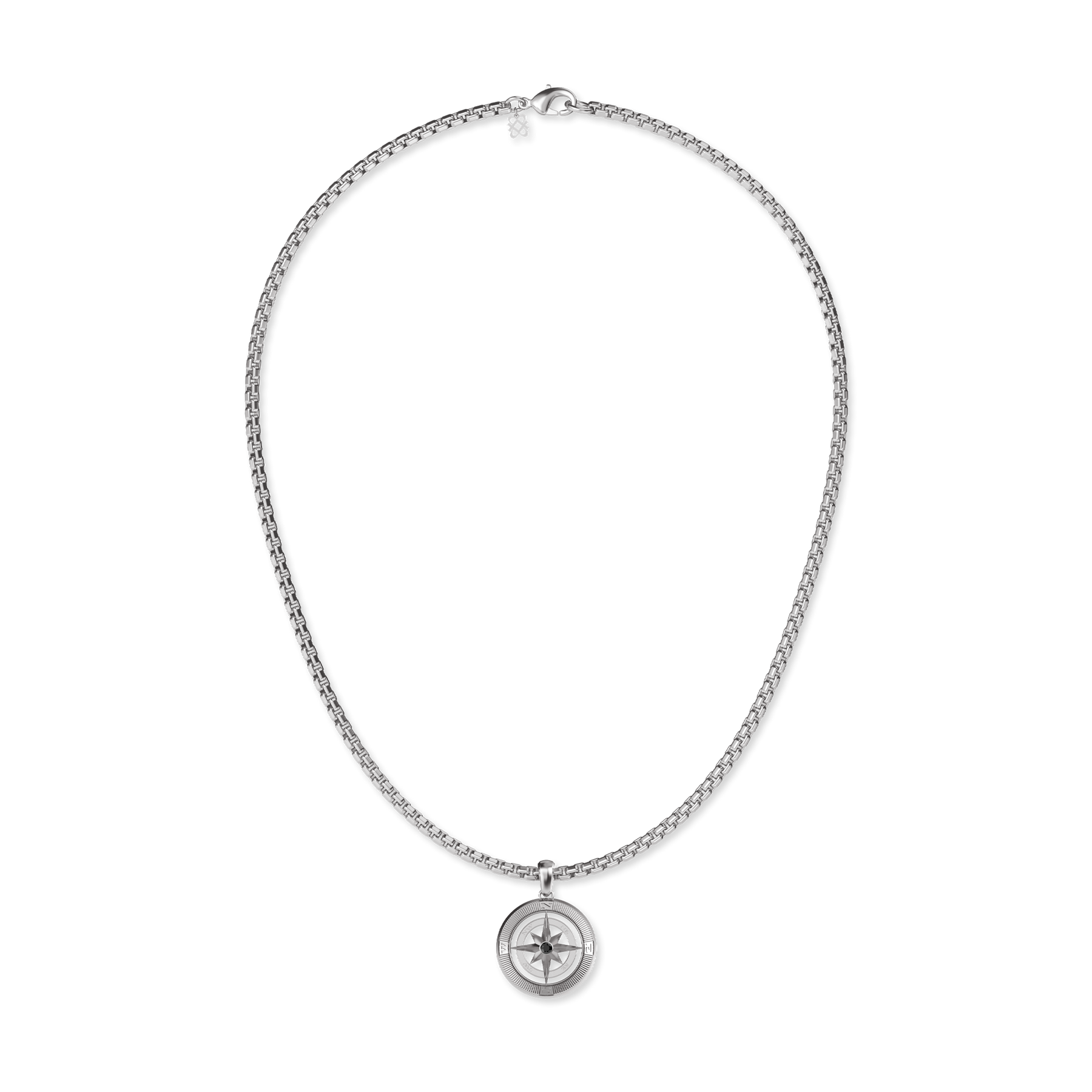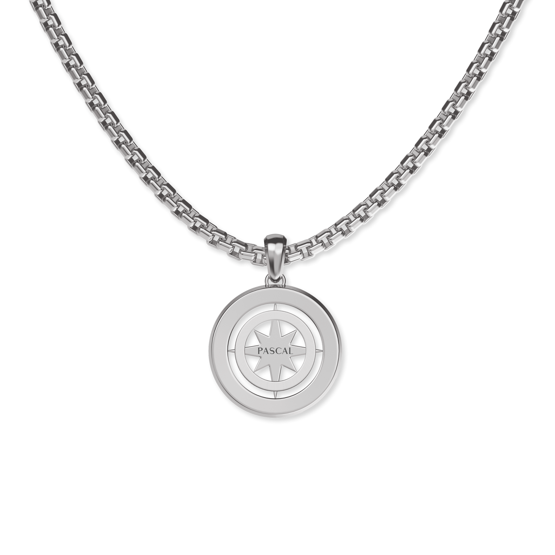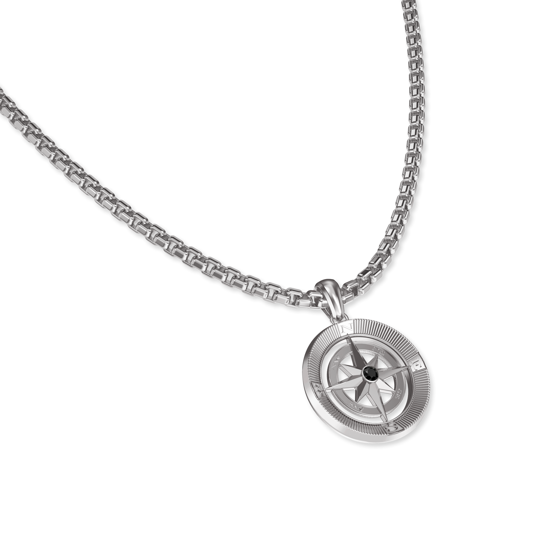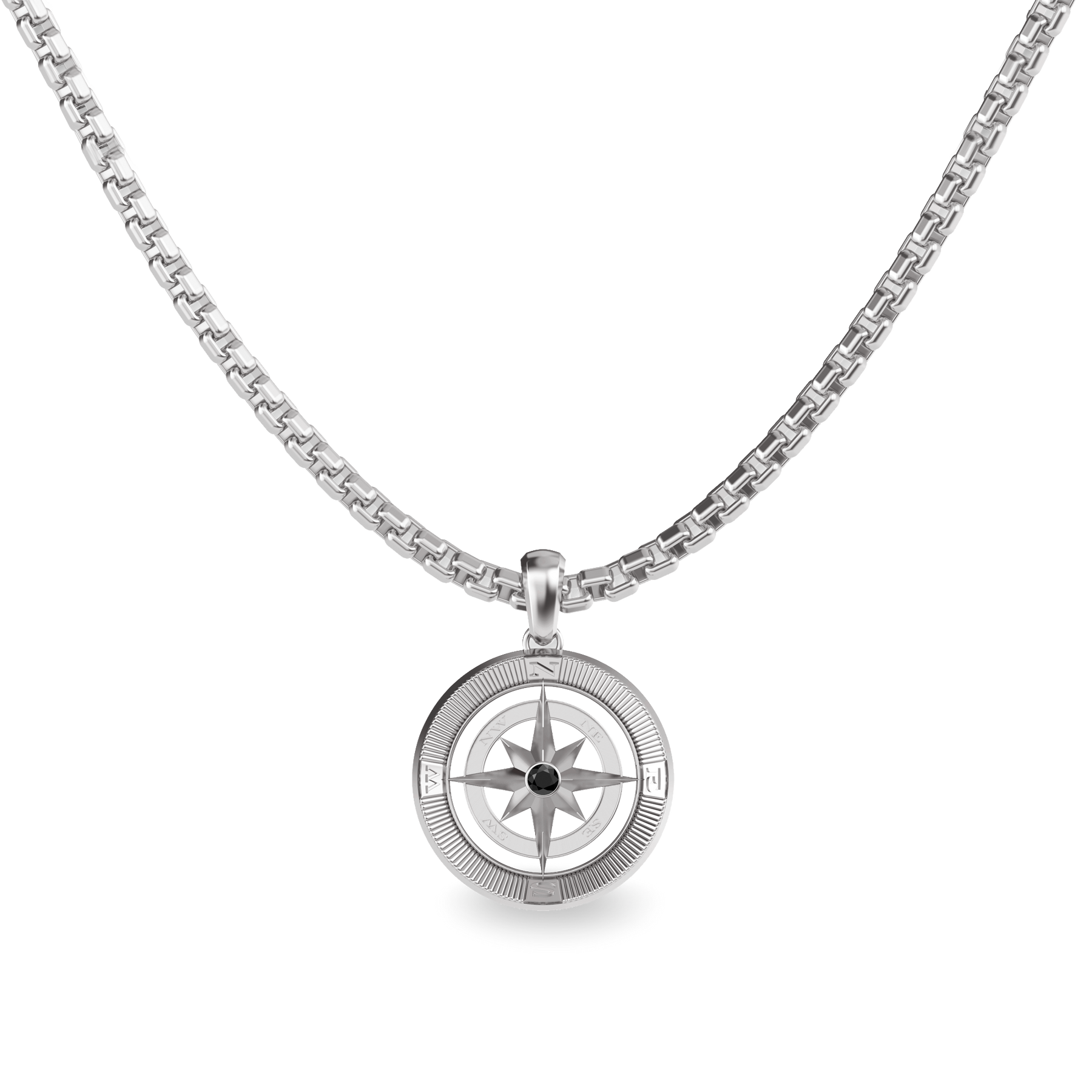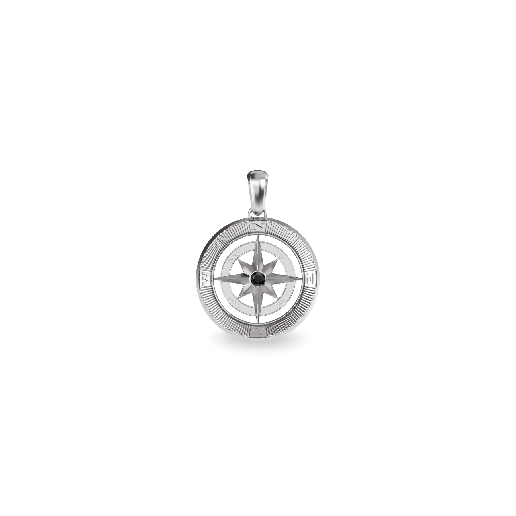 Este colgante de brújula está elaborado con un arte refinado, presentando un diseño de estrella de ocho puntas con un brillante diamante cultivado en laboratorio en su centro, que brilla como una luz guía. El anillo exterior está rodeado de delicadas texturas, añadiendo profundidad y sofisticación.