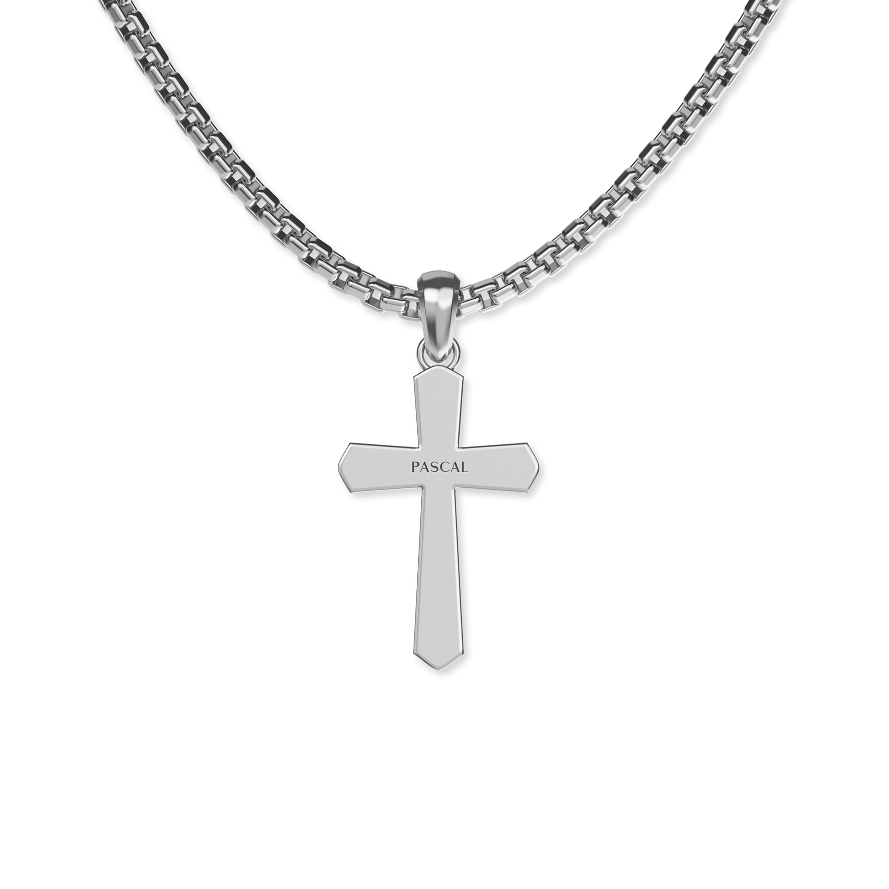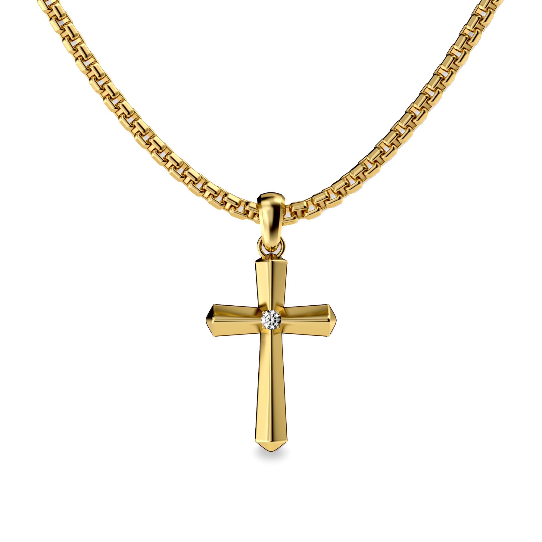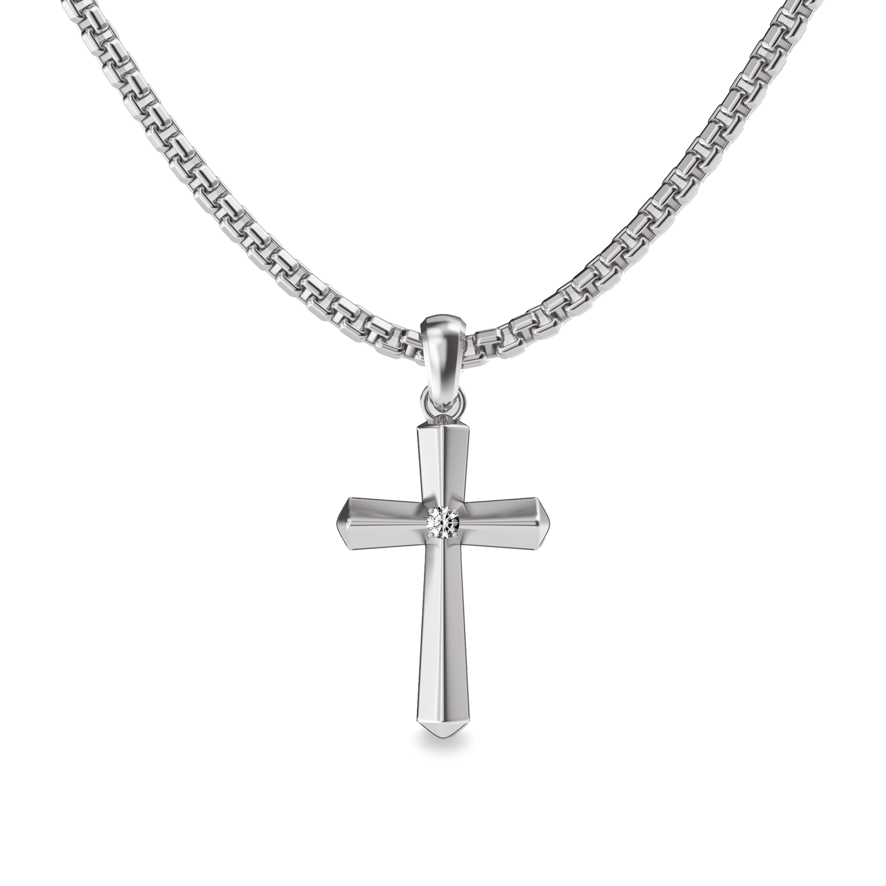 Este colgante está elaborado con detalles facetados en una silueta clásica de cruz, definida por líneas audaces y refinadas que encarnan fuerza y resistencia. En su centro descansa un brillante diamante cultivado en laboratorio, que brilla como la luz de un alma—sutil pero radiante.