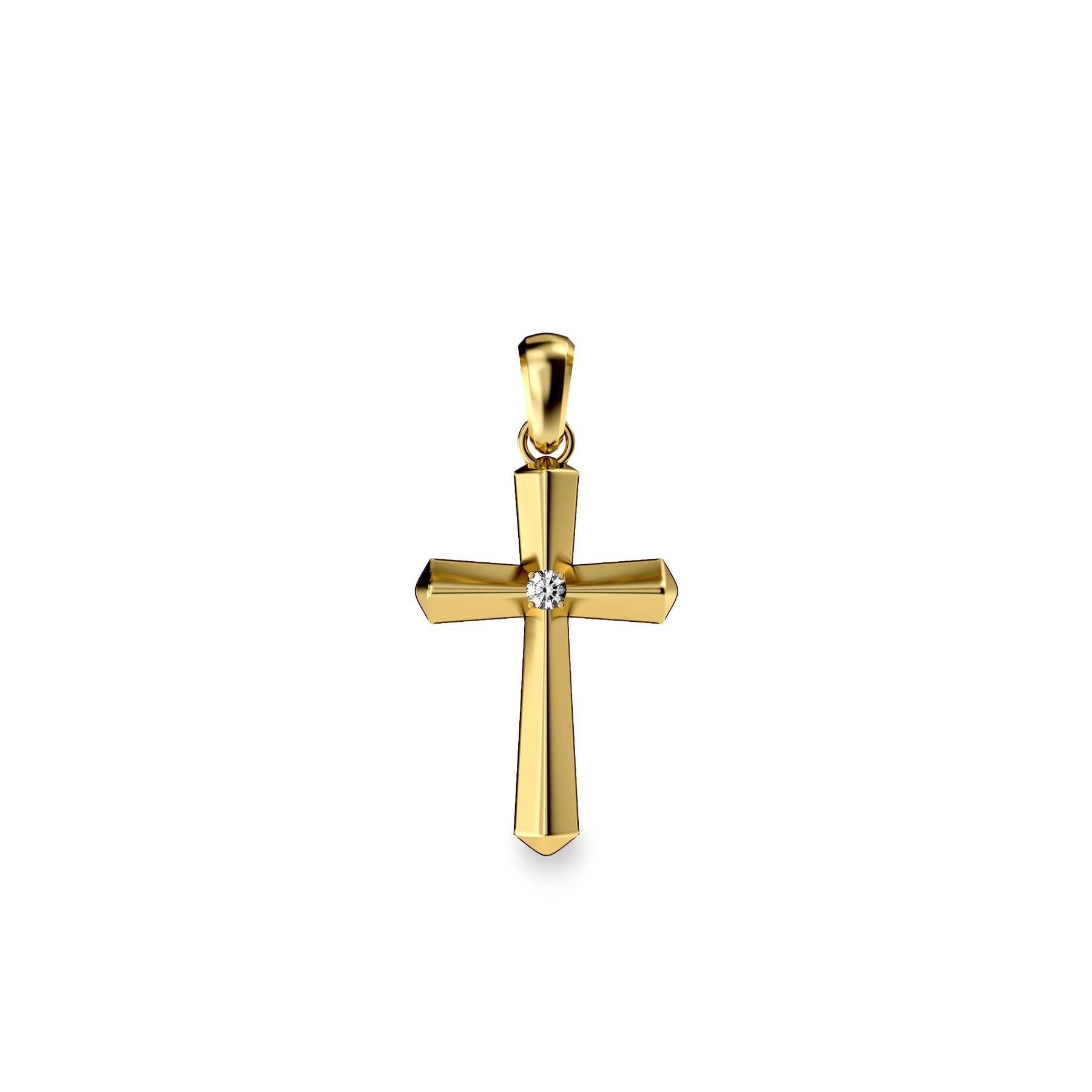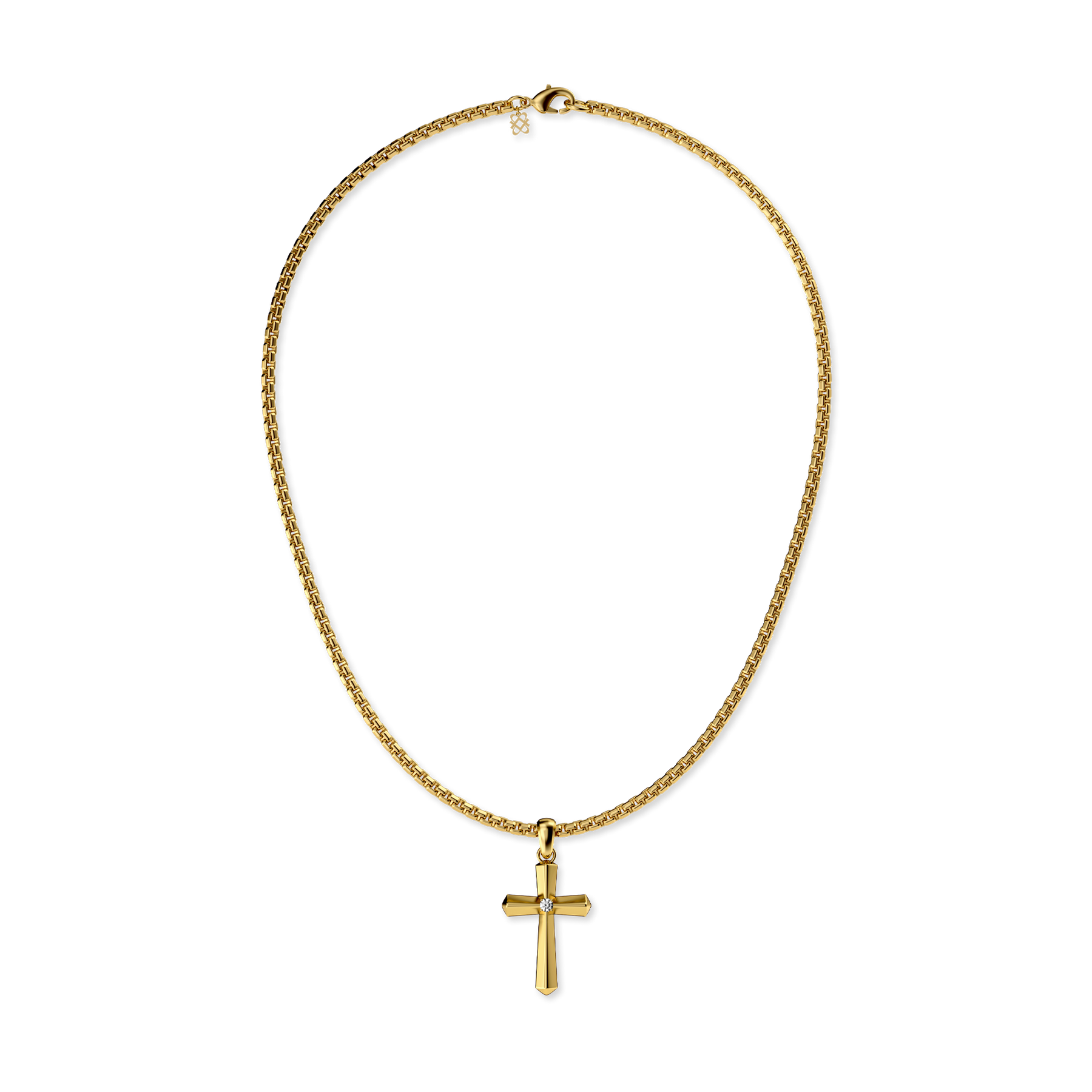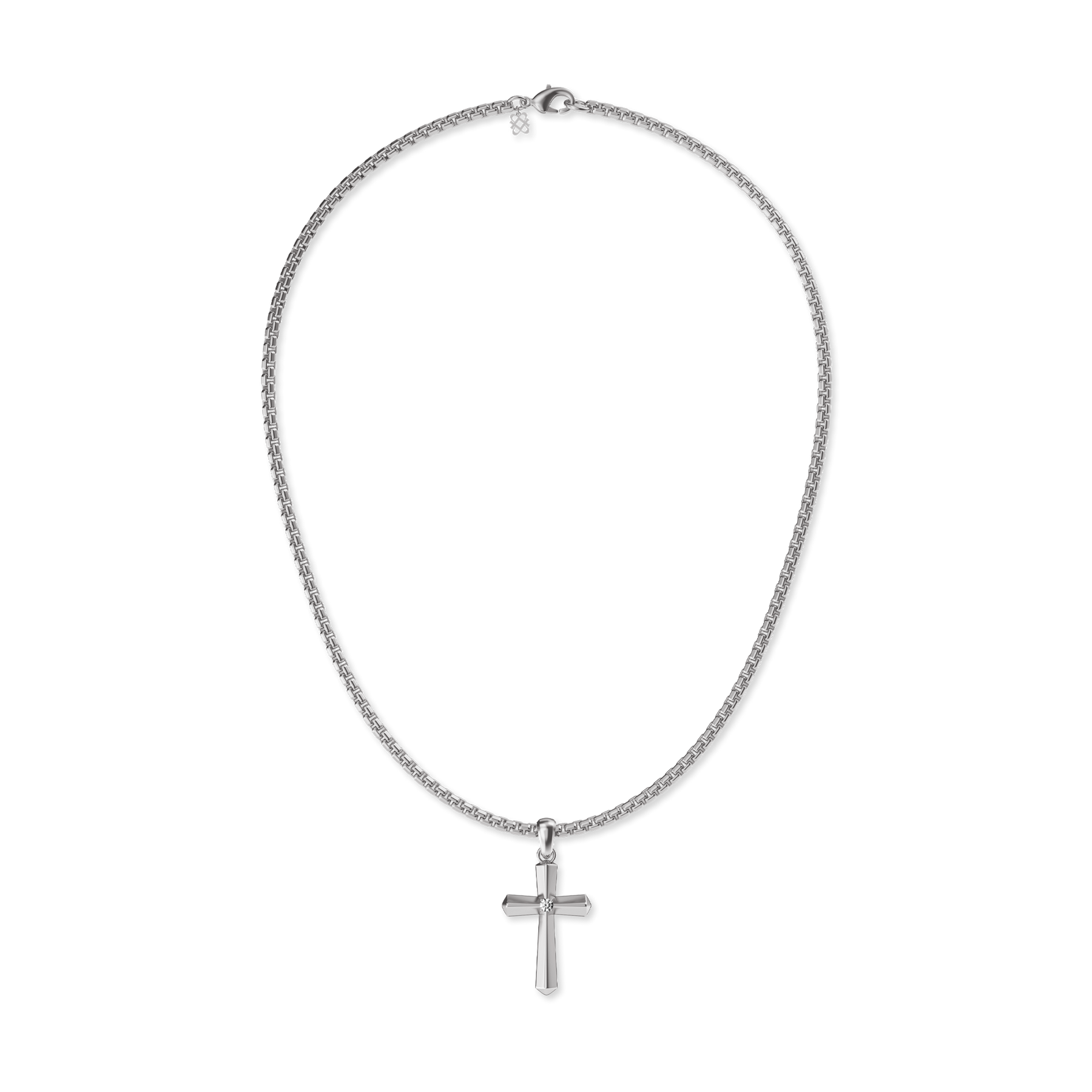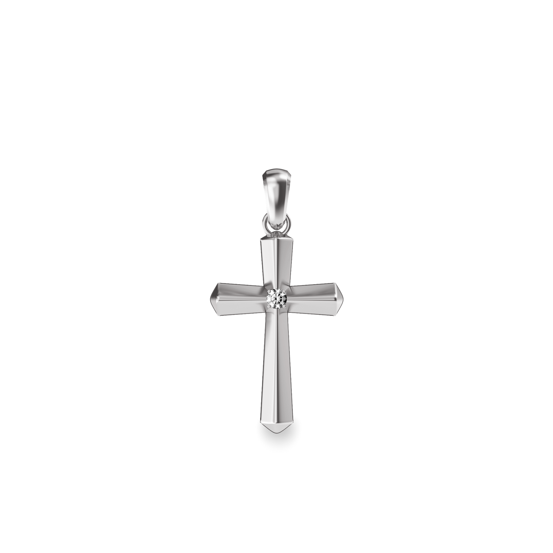 Este colgante está elaborado con detalles facetados en una silueta clásica de cruz, definida por líneas audaces y refinadas que encarnan fuerza y resistencia. En su centro descansa un brillante diamante cultivado en laboratorio, que brilla como la luz de un alma—sutil pero radiante.