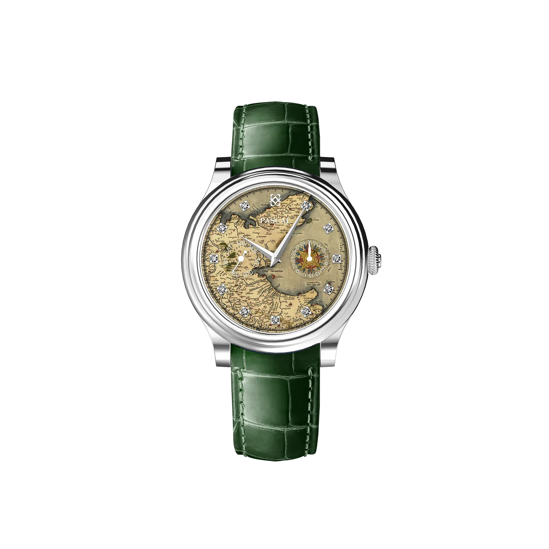 Ce cadran unique s'inspire de l'Âge des découvertes, présentant quatre cartes nautiques dessinées à la main qui illustrent le courage et la sagesse de l'humanité dans l'exploration de l'inconnu. Les cartes sur le cadran se concentrent principalement sur l'Europe, y compris la péninsule scandinave, la région de Naples, ainsi que la compréhension contemporaine de l'Europe et du monde. Chaque carte recrée méticuleusement le précieux patrimoine cartographique laissé par les navigateurs pionniers, non seulement en enregistrant les découvertes géographiques mais aussi en incarnant les rêves et l'esprit d'aventure de cette époque.