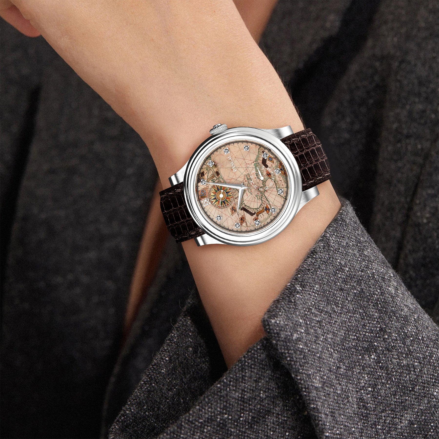 Ce cadran unique s'inspire de l'Âge des Découvertes, présentant quatre cartes nautiques dessinées à la main qui illustrent le courage et la sagesse de l'humanité dans l'exploration de l'inconnu. La carte affichée sur le cadran est l'une des premières cartes du monde, dessinée par Guillaume Brouscon. La zone mise en évidence sur le cadran représente l'une des premières représentations du continent américain, montrant comment les cartographes de cette époque percevaient et documentaient le Nouveau Monde lors de leurs premières explorations. Chaque carte recrée méticuleusement le précieux patrimoine cartographique laissé par les navigateurs pionniers, non seulement en enregistrant les découvertes géographiques mais aussi en incarnant les rêves et l'esprit d'aventure de cette époque.
