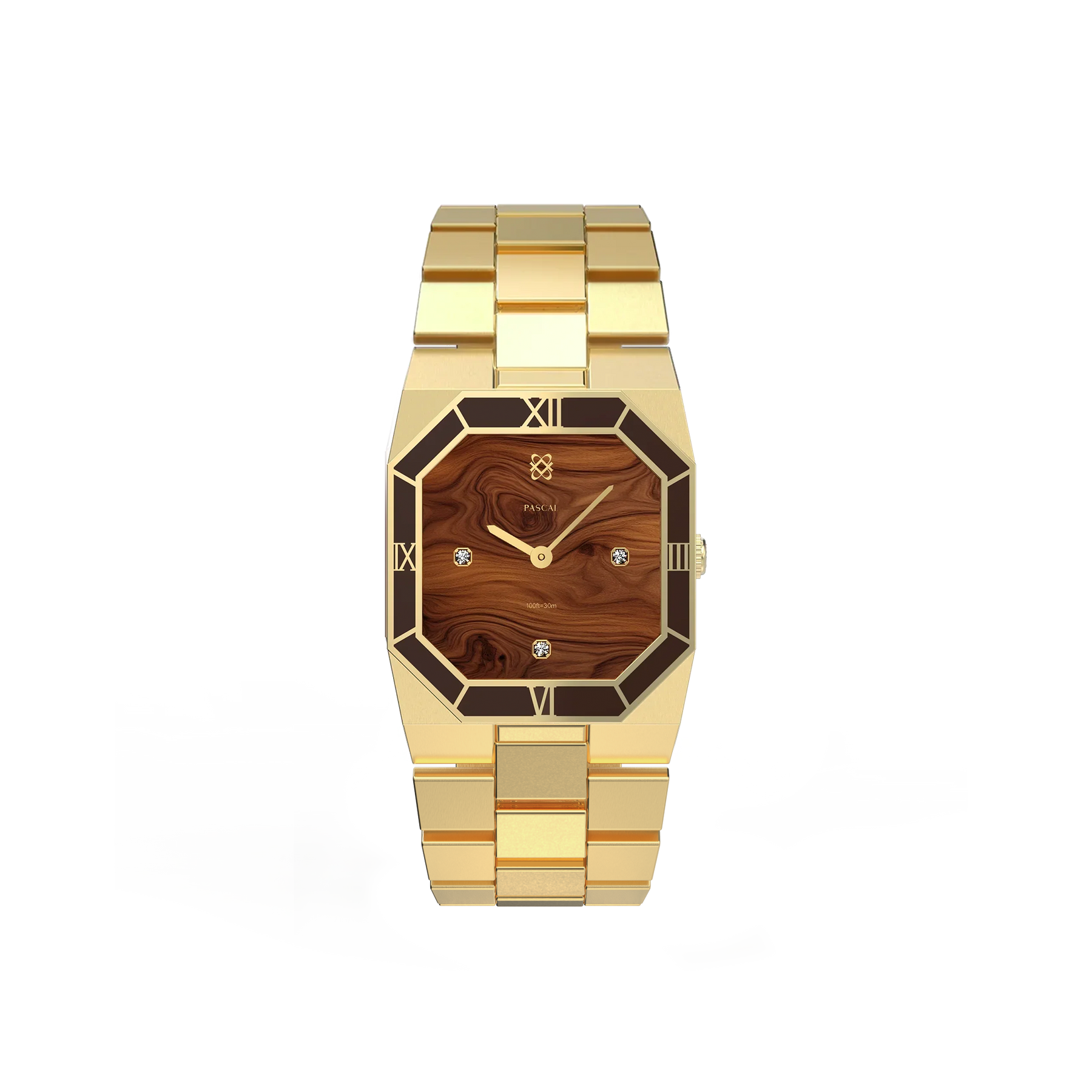 Cette montre distinguée présente un cadran à grain de bois méticuleusement conçu et une lunette en émail avec des marqueurs en chiffres romains. Le corps entier est de couleur or, avec un boîtier octogonal qui s'inspire d'éléments vintage. Améliorée avec des diamants cultivés en laboratoire, cette montre crée un pont entre le passé et le présent, célébrant un design intemporel avec une touche moderne.
