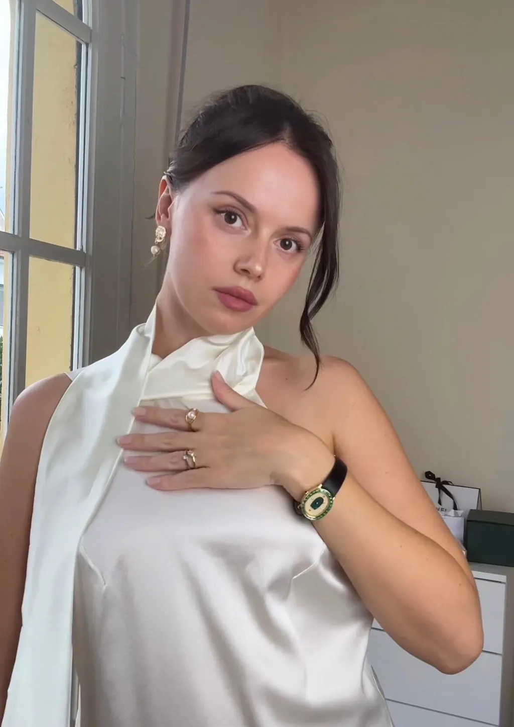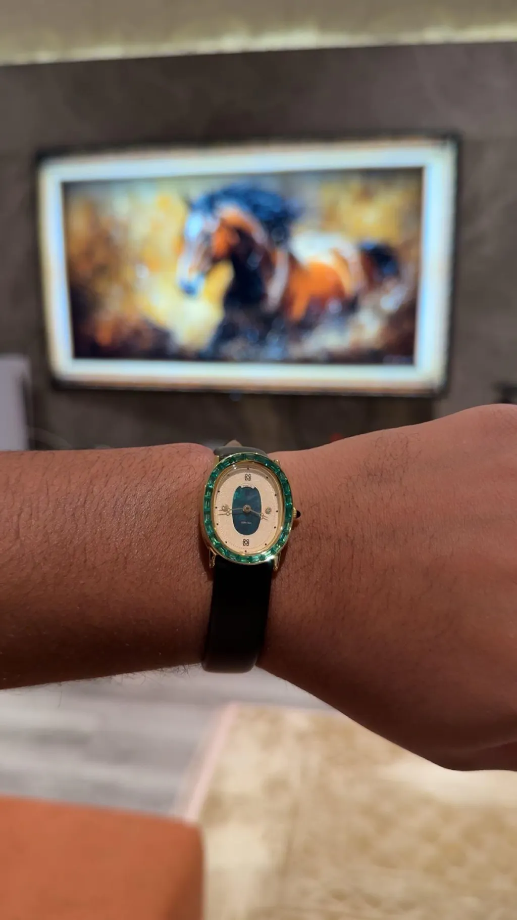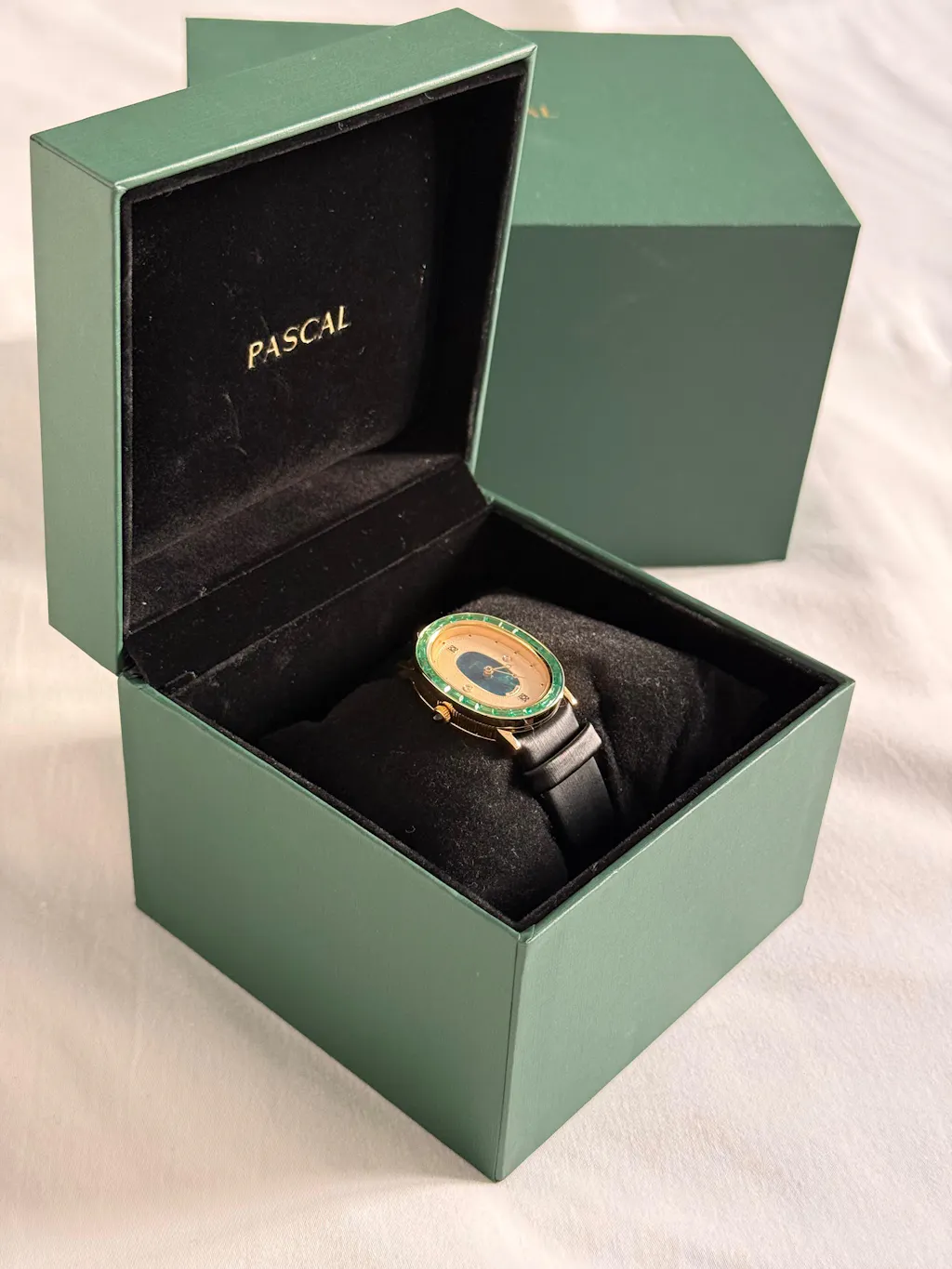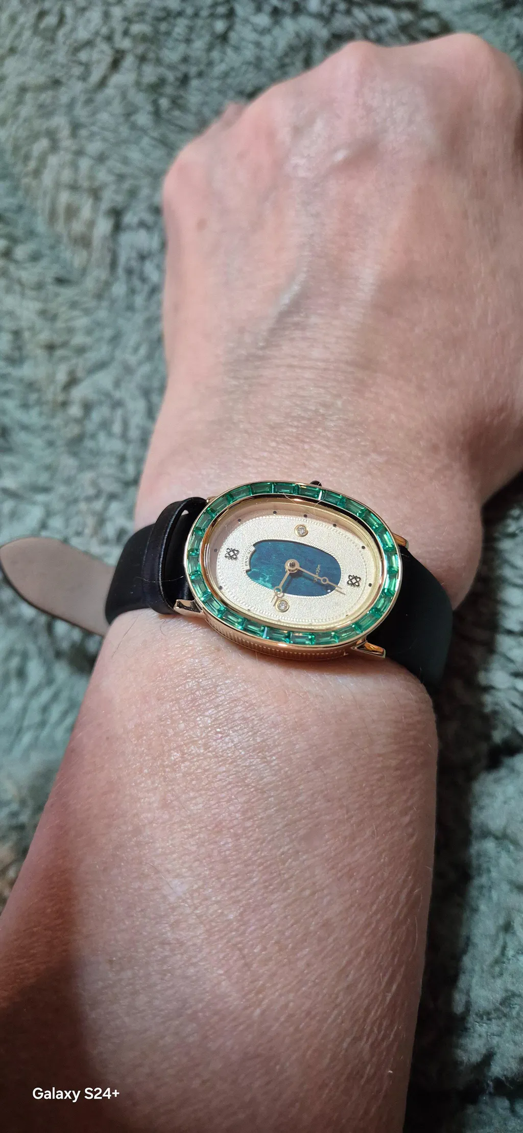 Rayonnant de sophistication, cette montre arbore une silhouette elliptique ornée d'un cercle de charmantes pierres précieuses vertes taillées en trapèze cultivées en laboratoire, encadrées par un luxueux boîtier en acier inoxydable plaqué or. Associé à un bracelet en cuir noir à rayures verticales, son cadran attire l'attention avec deux diamants étincelants cultivés en laboratoire au milieu d'un jeu de lumière captivant sur une texture complexe en or clair et un motif de marbre vert fascinant.