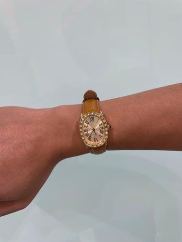 Rayonnant de sophistication, cette montre arbore une silhouette elliptique ornée d'un cercle de charmantes pierres précieuses vertes taillées en trapèze cultivées en laboratoire, encadrées par un luxueux boîtier en acier inoxydable plaqué or. Associé à un bracelet en cuir noir à rayures verticales, son cadran attire l'attention avec deux diamants étincelants cultivés en laboratoire au milieu d'un jeu de lumière captivant sur une texture complexe en or clair et un motif de marbre vert fascinant.