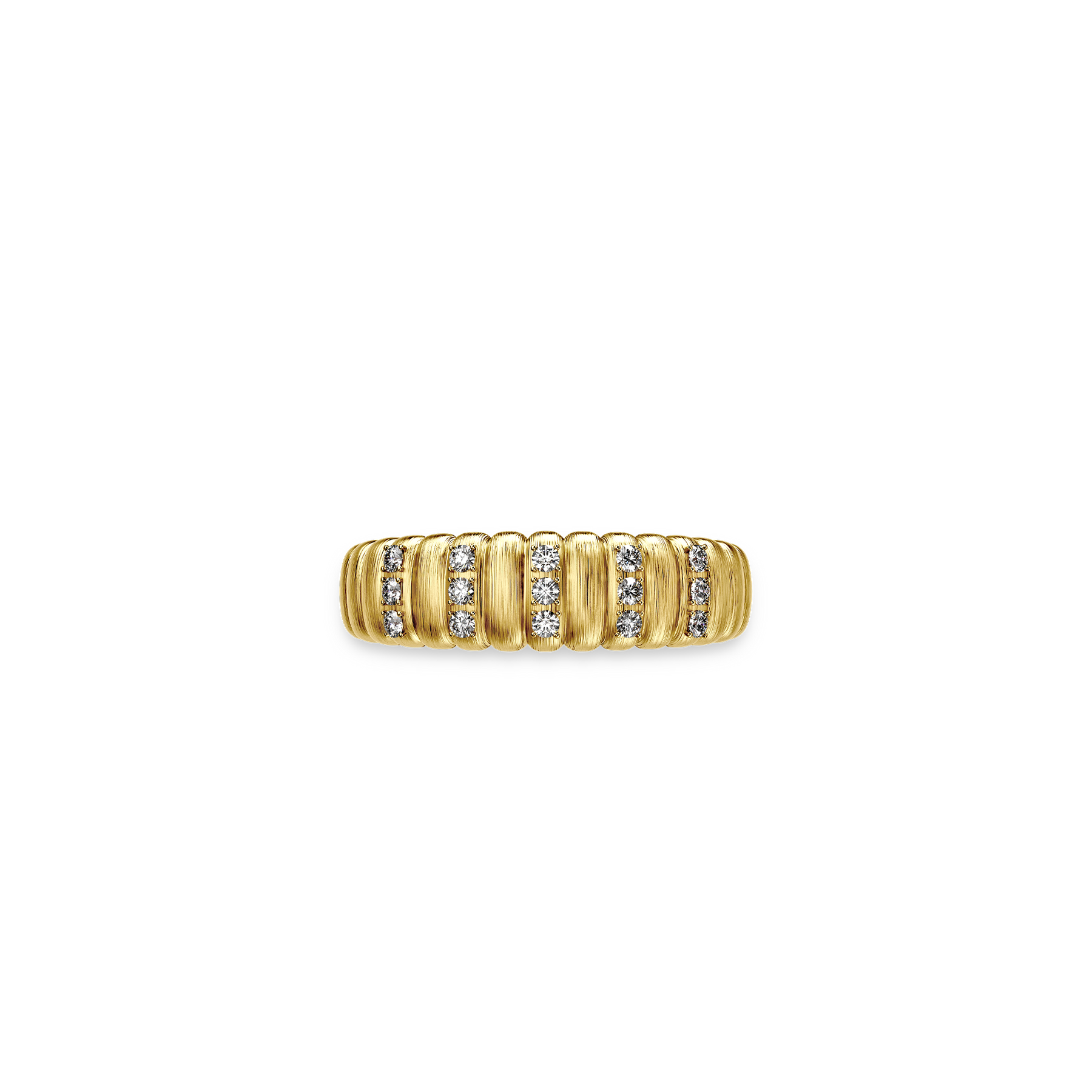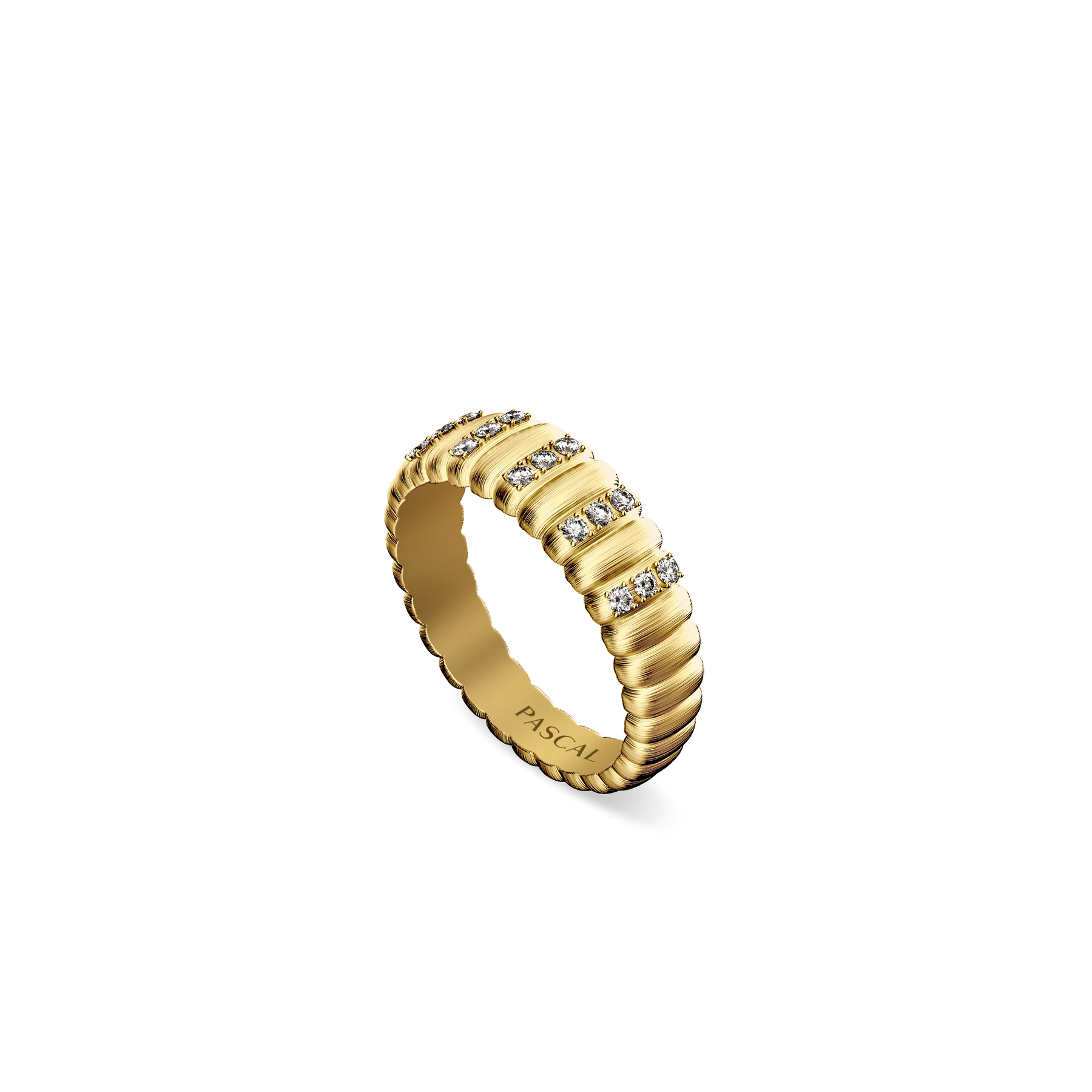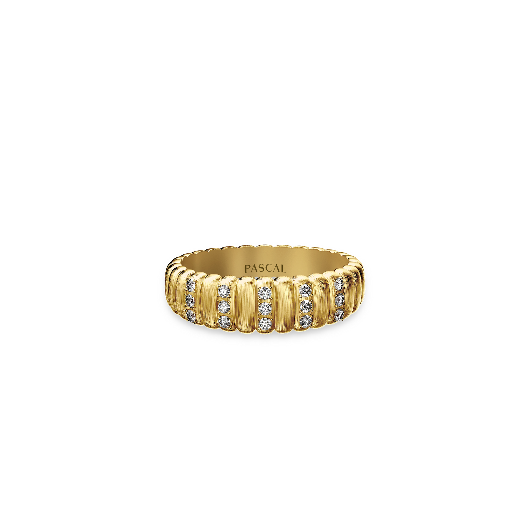 The outer profile of the band appears full and sculptural, while the inner curve remains smooth and balanced for a harmonious proportion. The placement of the diamonds echoes the linear rhythm of the band, reinforcing visual order and dimensionality.