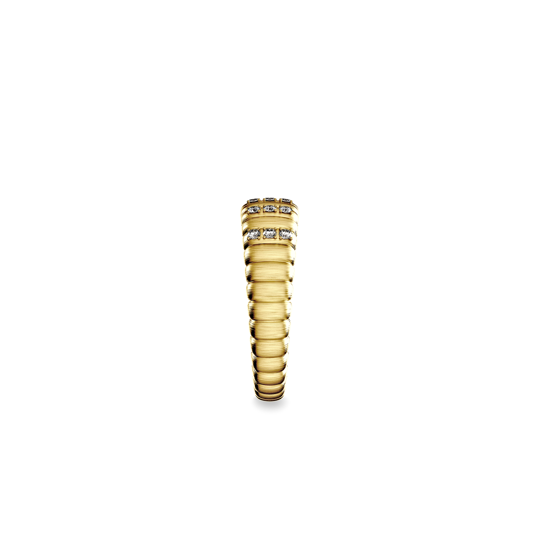 White lab-grown diamonds are set in segmented intervals along the band, interspersed between the vertical grooves. A total of 0.18ct of white lab-grown diamonds is distributed across the ring, adding refined points of sparkle while preserving the cohesive, structured appearance of the design.