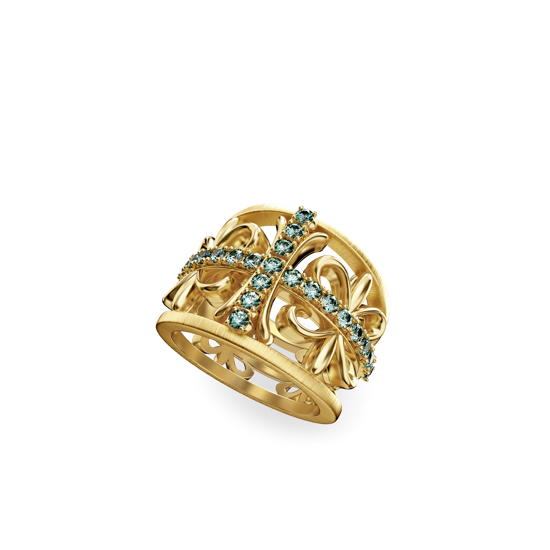 The outer edges of the band and selected details feature a brushed finish, contrasted with polished interior elements. This interplay of textures adds visual depth and enhances the sculptural contours of the ring when viewed from different angles.