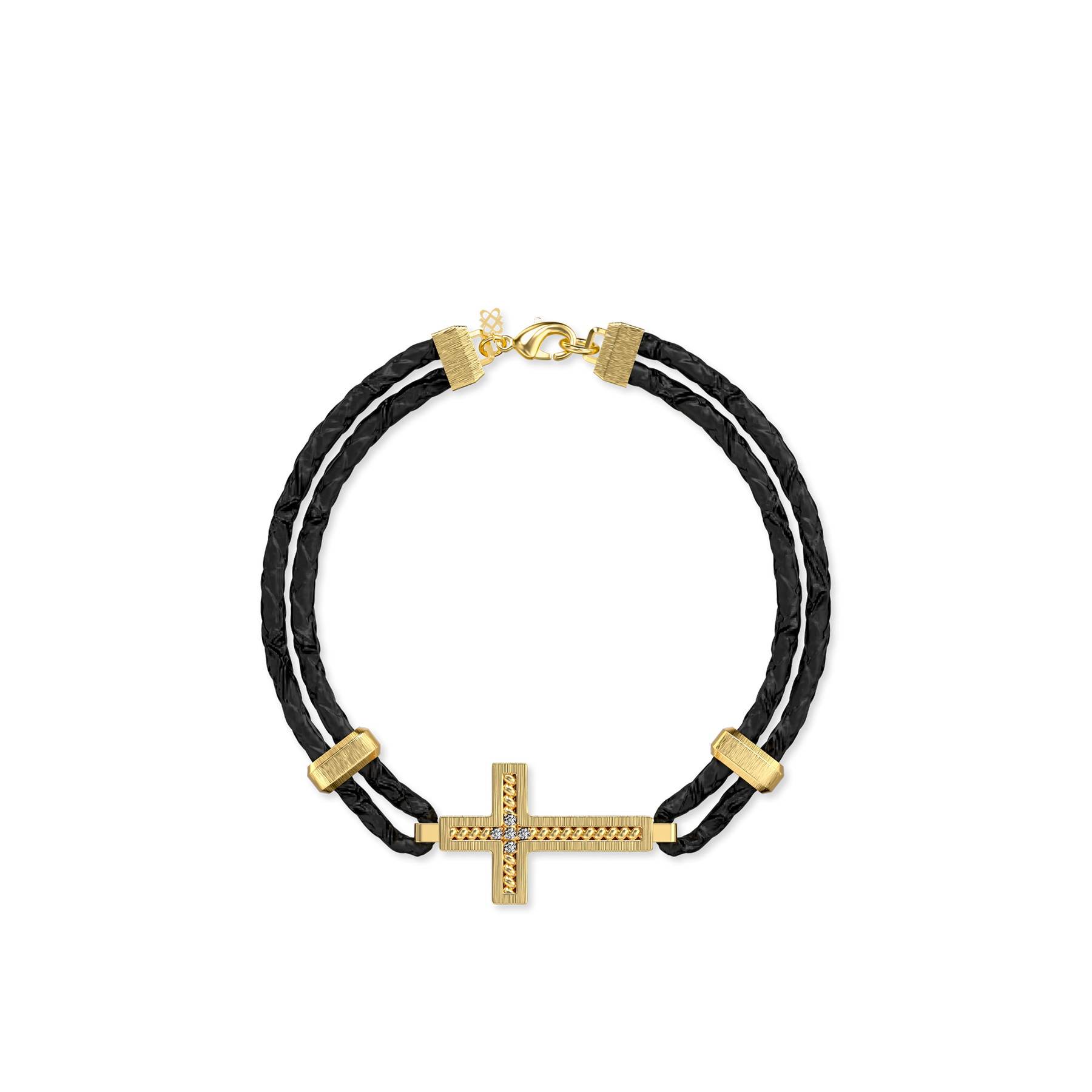 Questo braccialetto fonde perfettamente forza ed eleganza, caratterizzato da un doppio cordoncino in pelle nera che trasmette sia potenza che texture. Al centro, il ciondolo a croce è decorato con un motivo a corda intrecciata, aggiungendo profondità e raffinata maestria artigianale. Cinque brillanti diamanti coltivati in laboratorio accentuano l'incrocio, scintillando come la luce delle stelle e portando una vibrante radiosità al design.