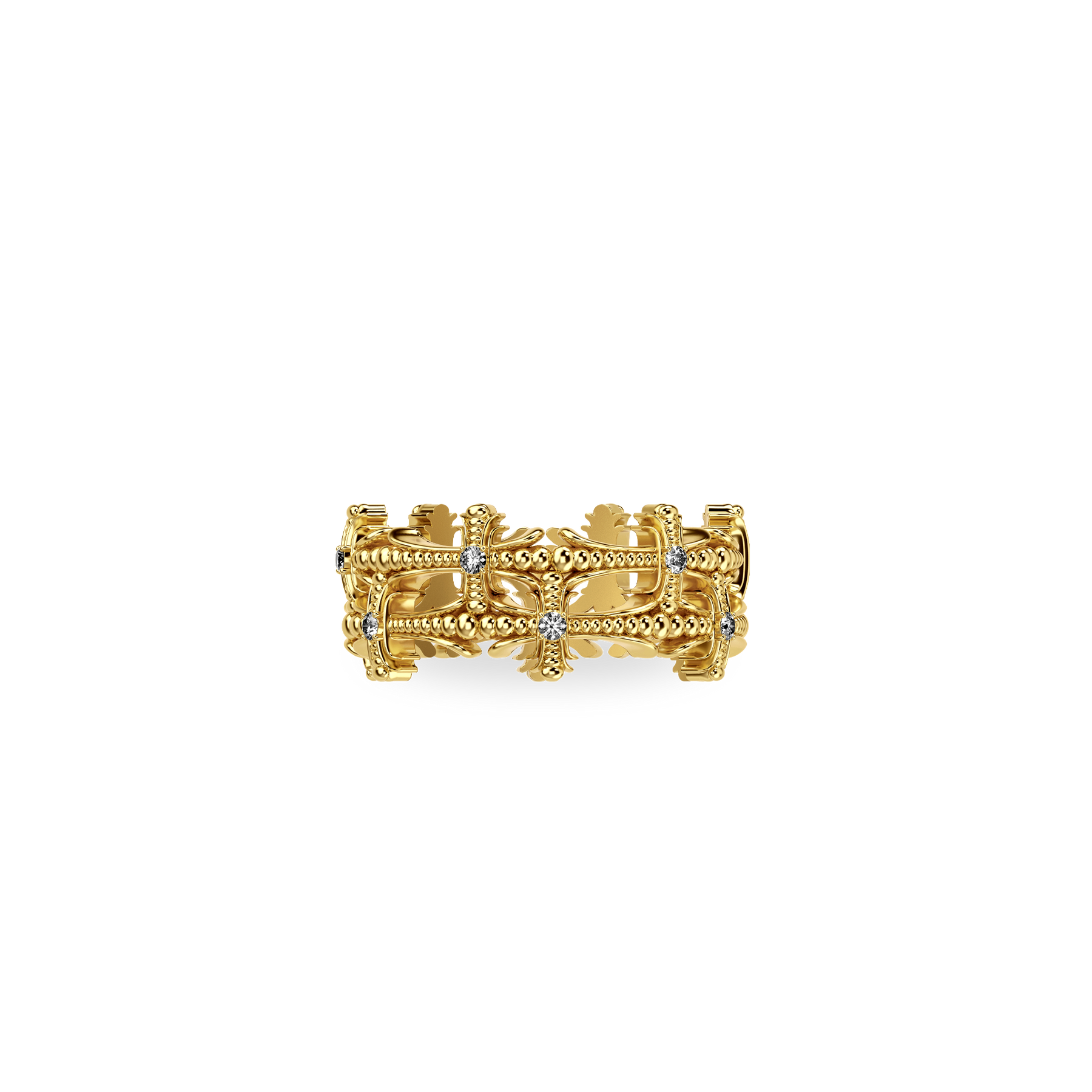 At the center of each cross motif, lab-grown diamonds are set as refined accents within the metal framework. In total, 0.09ct of lab-grown diamonds are distributed across the band, delivering a subtle and controlled sparkle that balances the sculptural metal design.