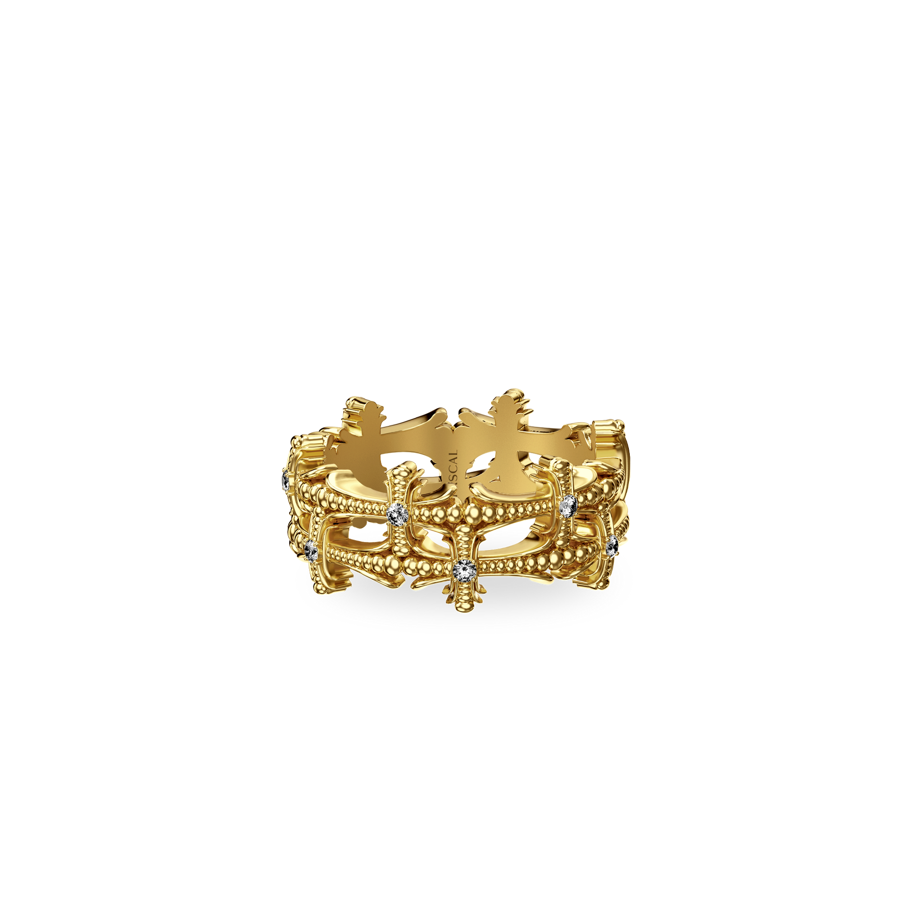 The overall form is defined by smooth, rounded lines and layered detailing. The cross elements are seamlessly connected by curved metal components, maintaining visual continuity and structural order throughout the ring.