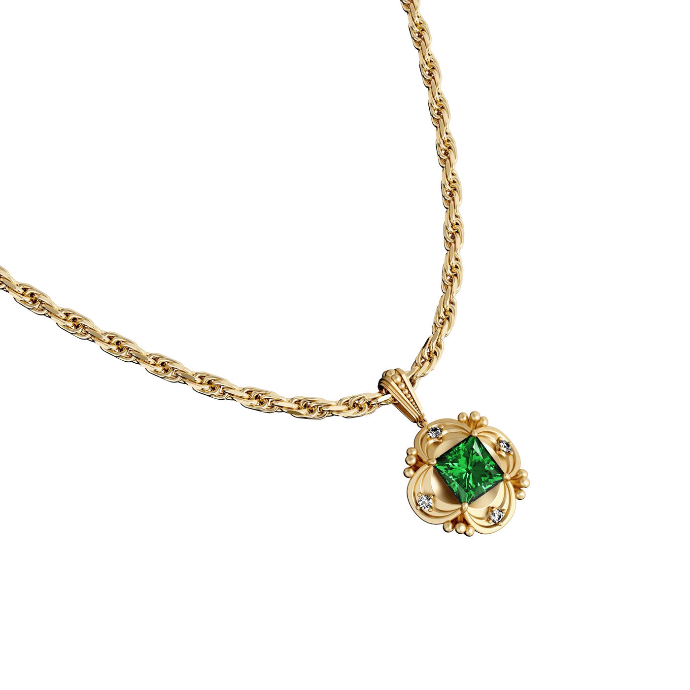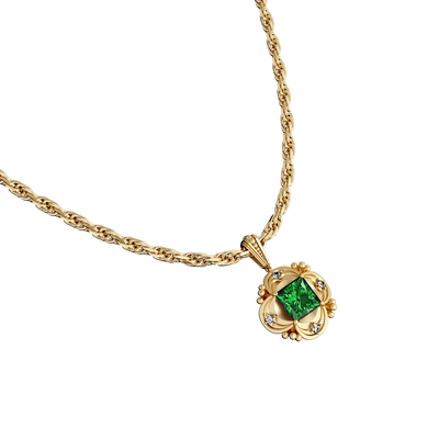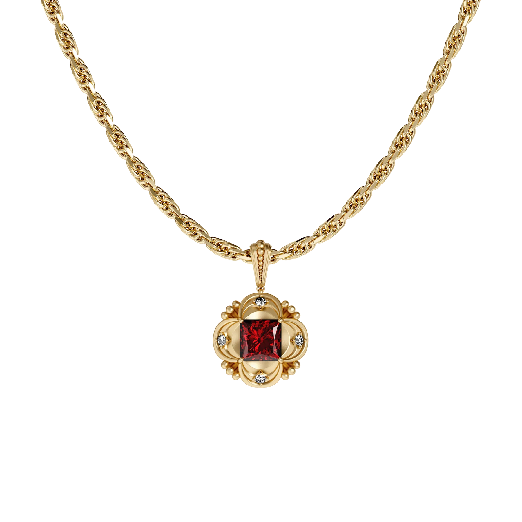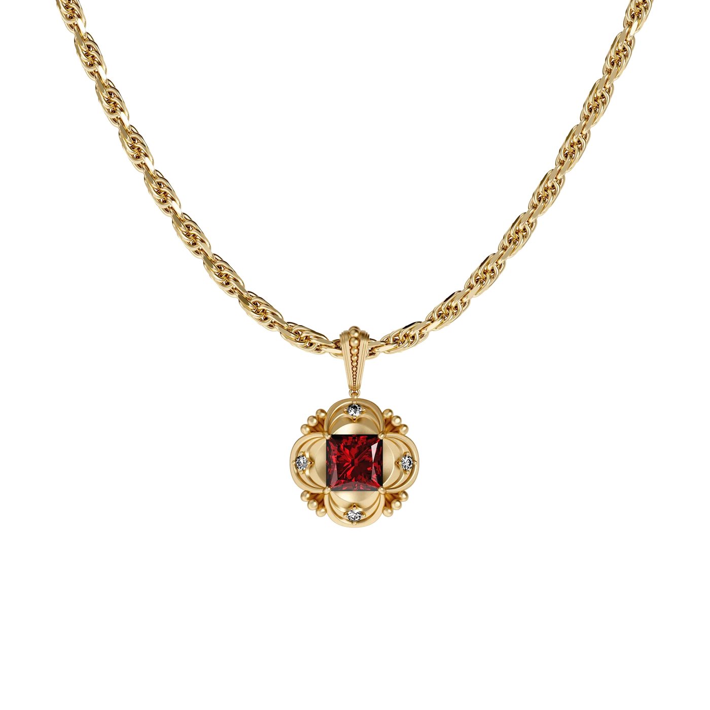 Questo pendente evoca la grazia e l'autorità di uno scettro reale, adornato con gemme taglio principessa coltivate in laboratorio in tonalità regali di rosso, nero e verde. Circondato da diamanti scintillanti e modellato in una silhouette ispirata ai ritratti elisabettiani, questo pezzo dall'aspetto di un cimelio riflette il potere e la compostezza di una regina incoronata.