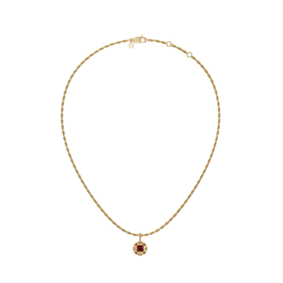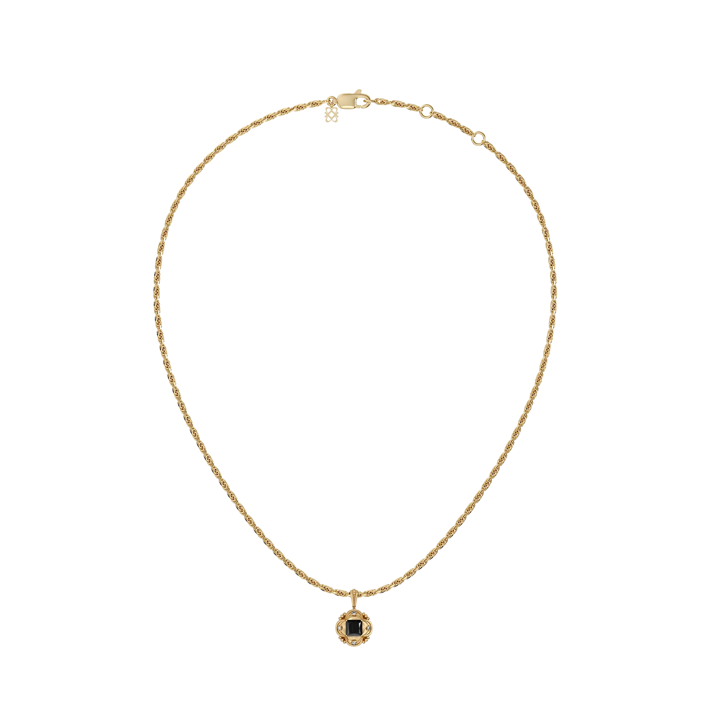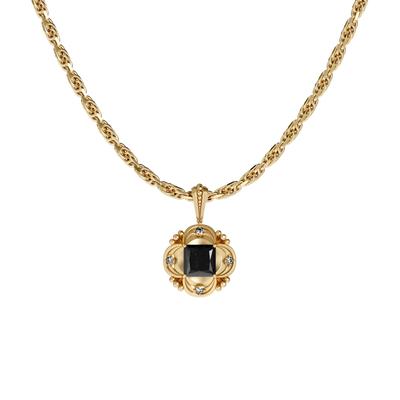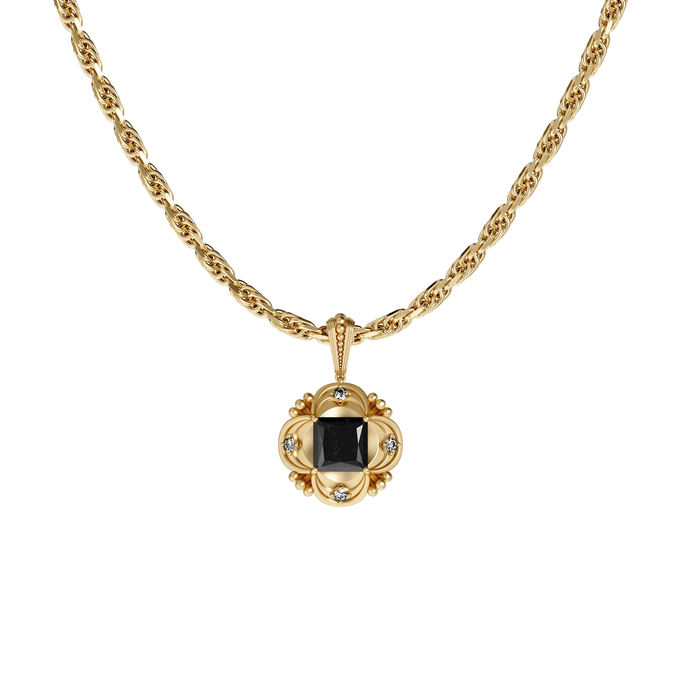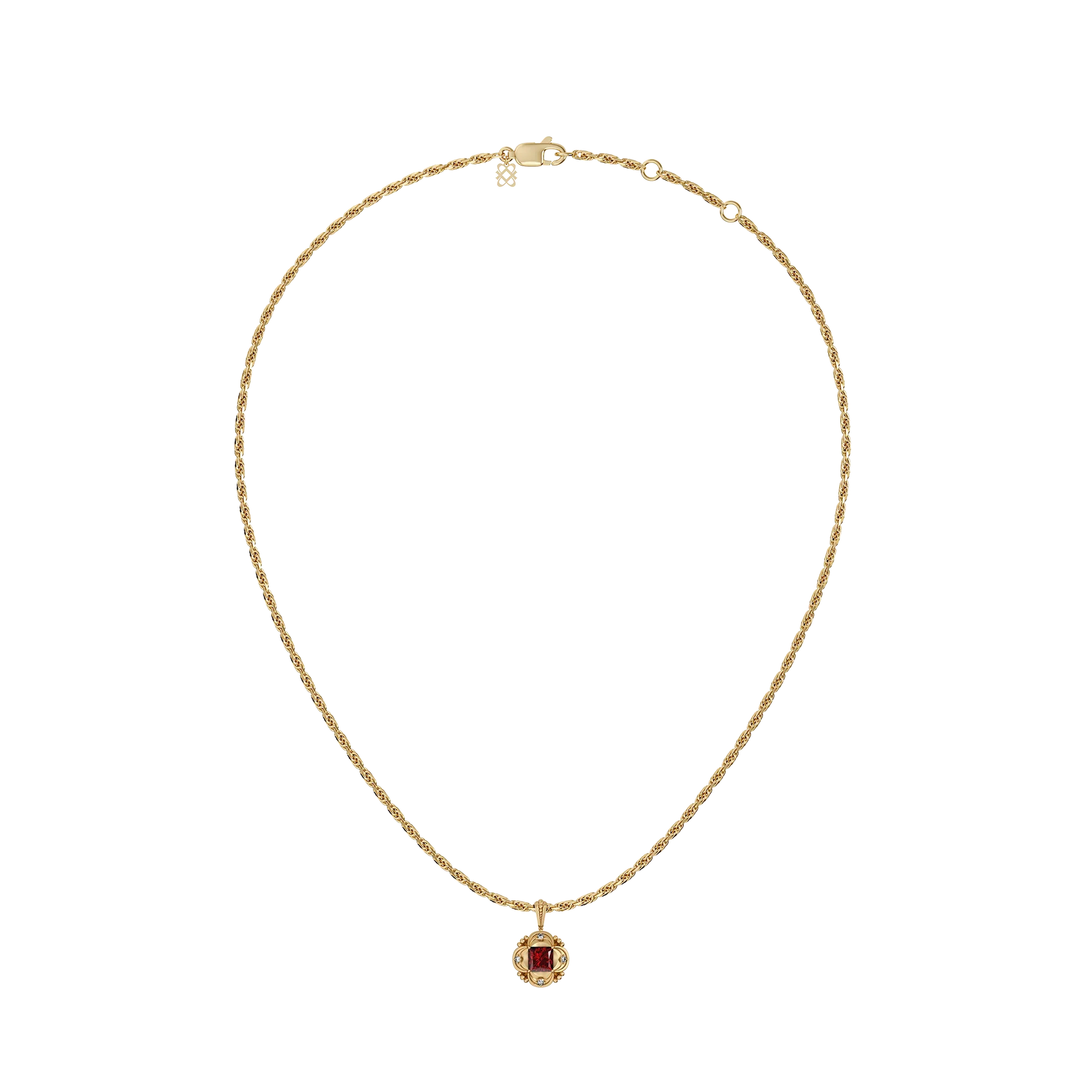 Questo pendente evoca la grazia e l'autorità di uno scettro reale, adornato con gemme taglio principessa coltivate in laboratorio in tonalità regali di rosso, nero e verde. Circondato da diamanti scintillanti e modellato in una silhouette ispirata ai ritratti elisabettiani, questo pezzo dall'aspetto di un cimelio riflette il potere e la compostezza di una regina incoronata.