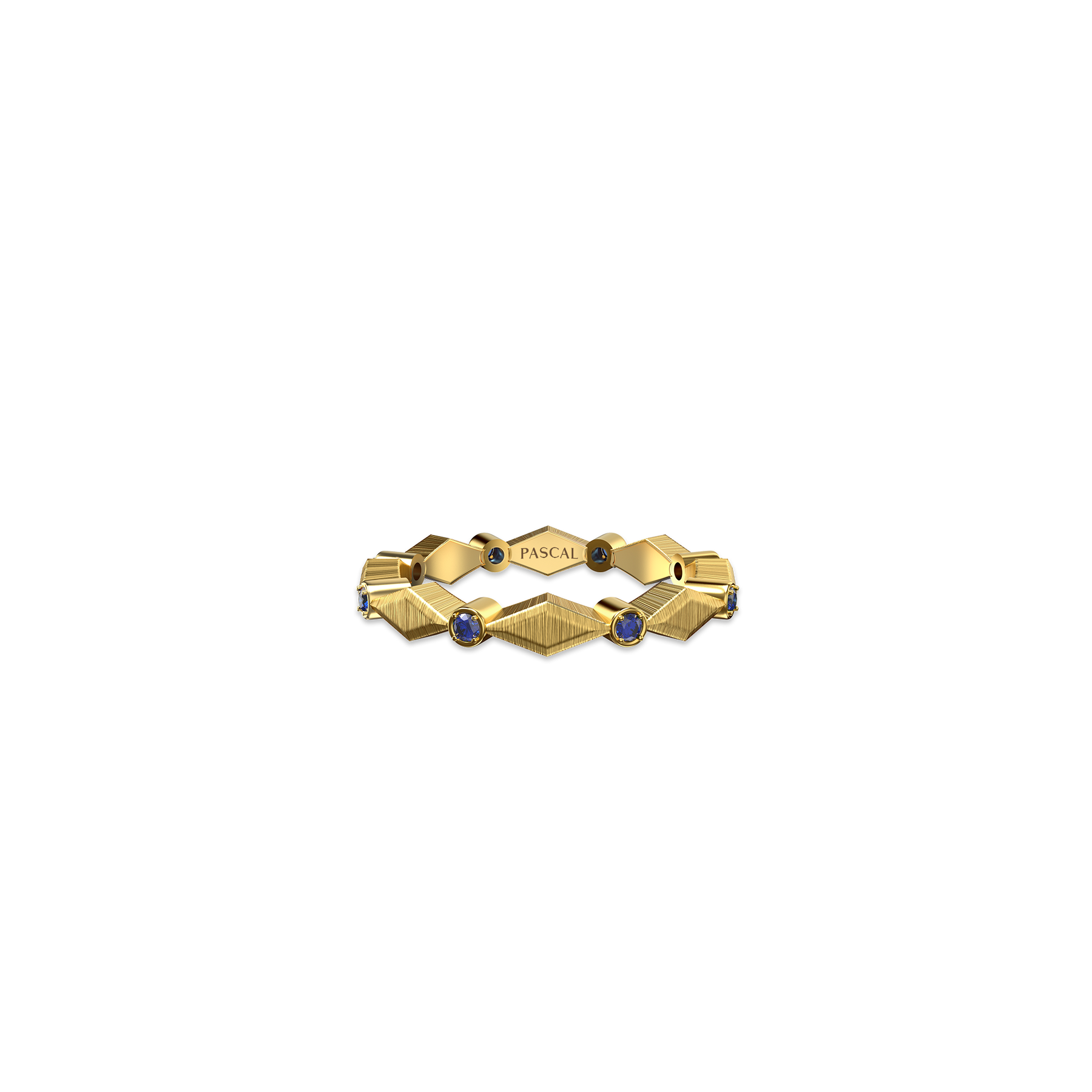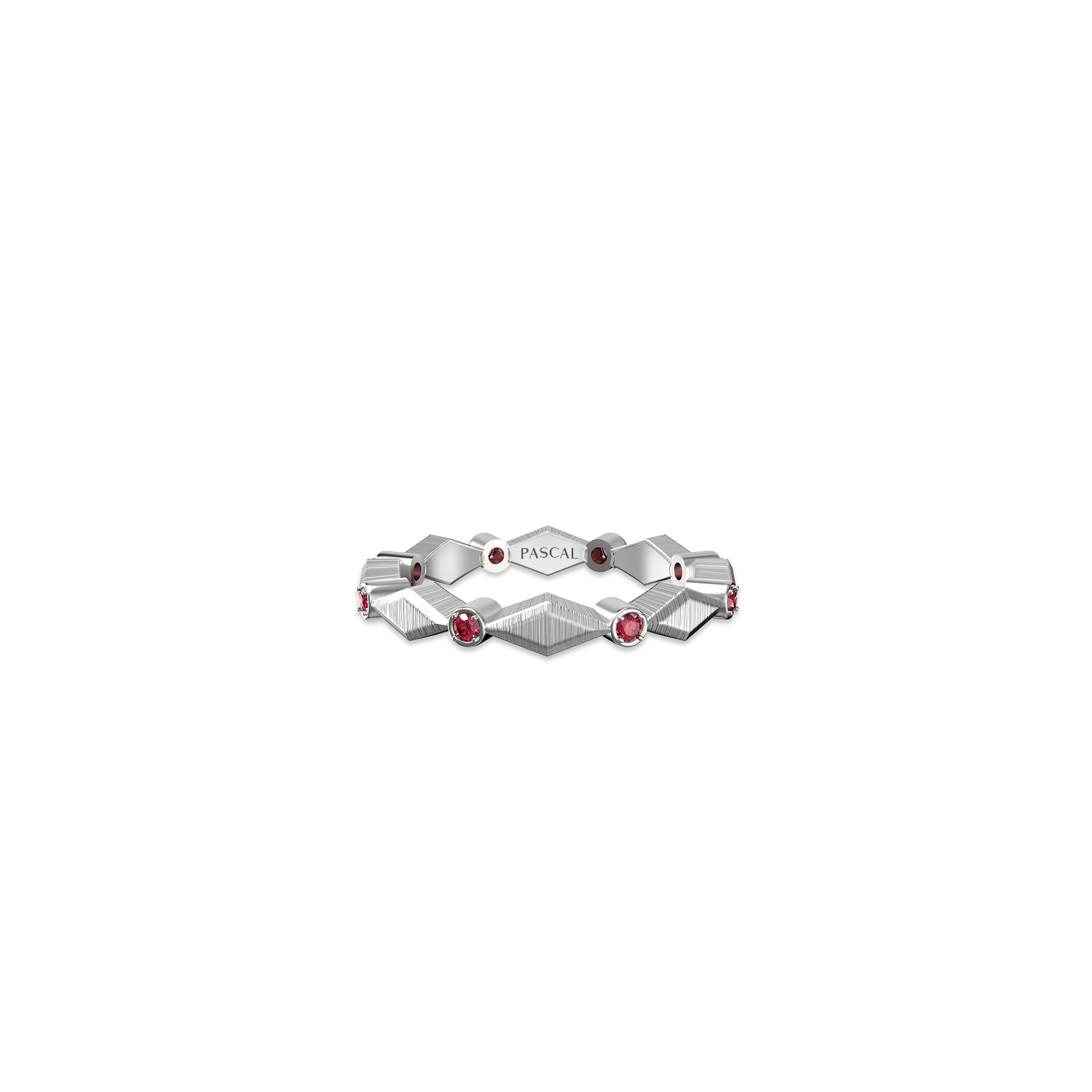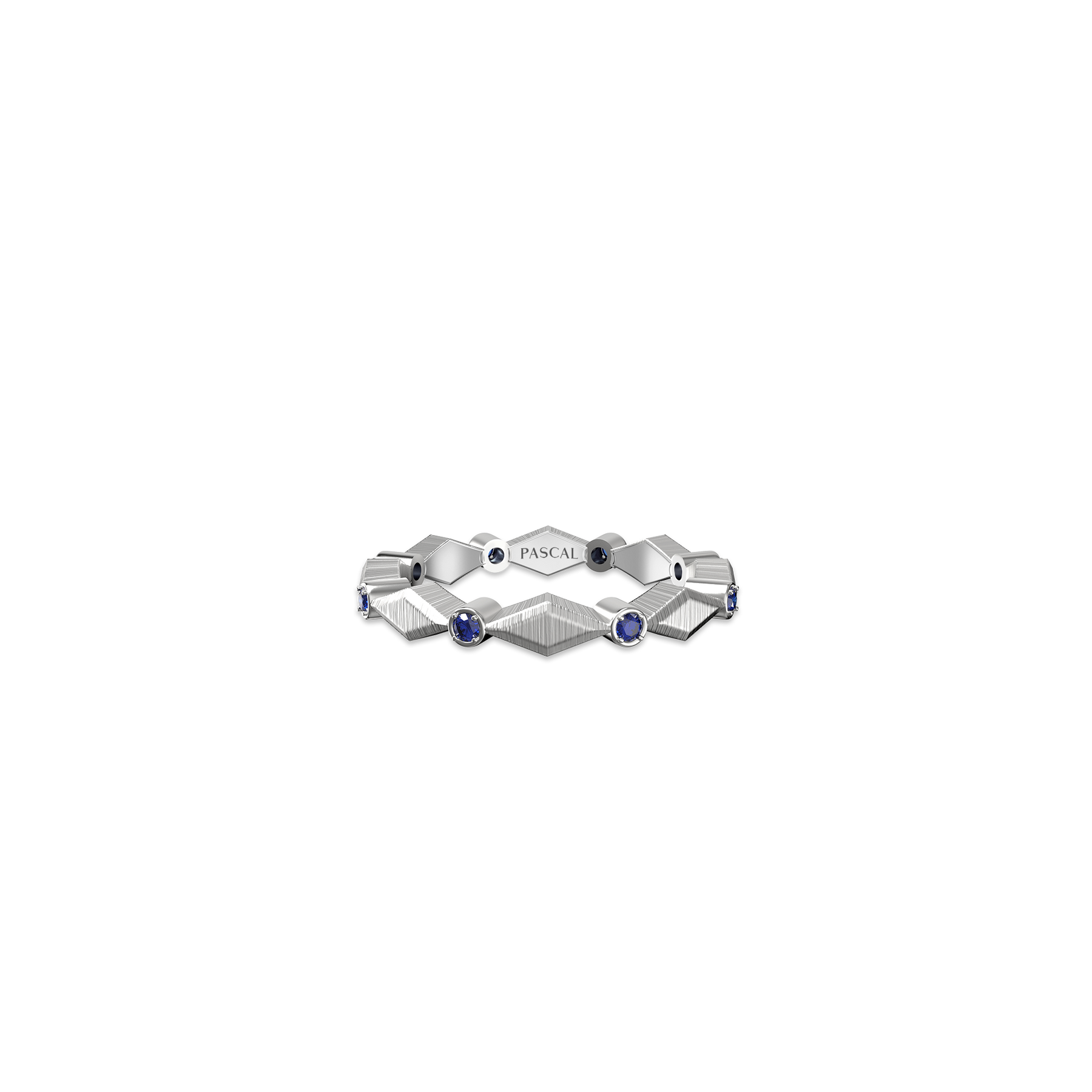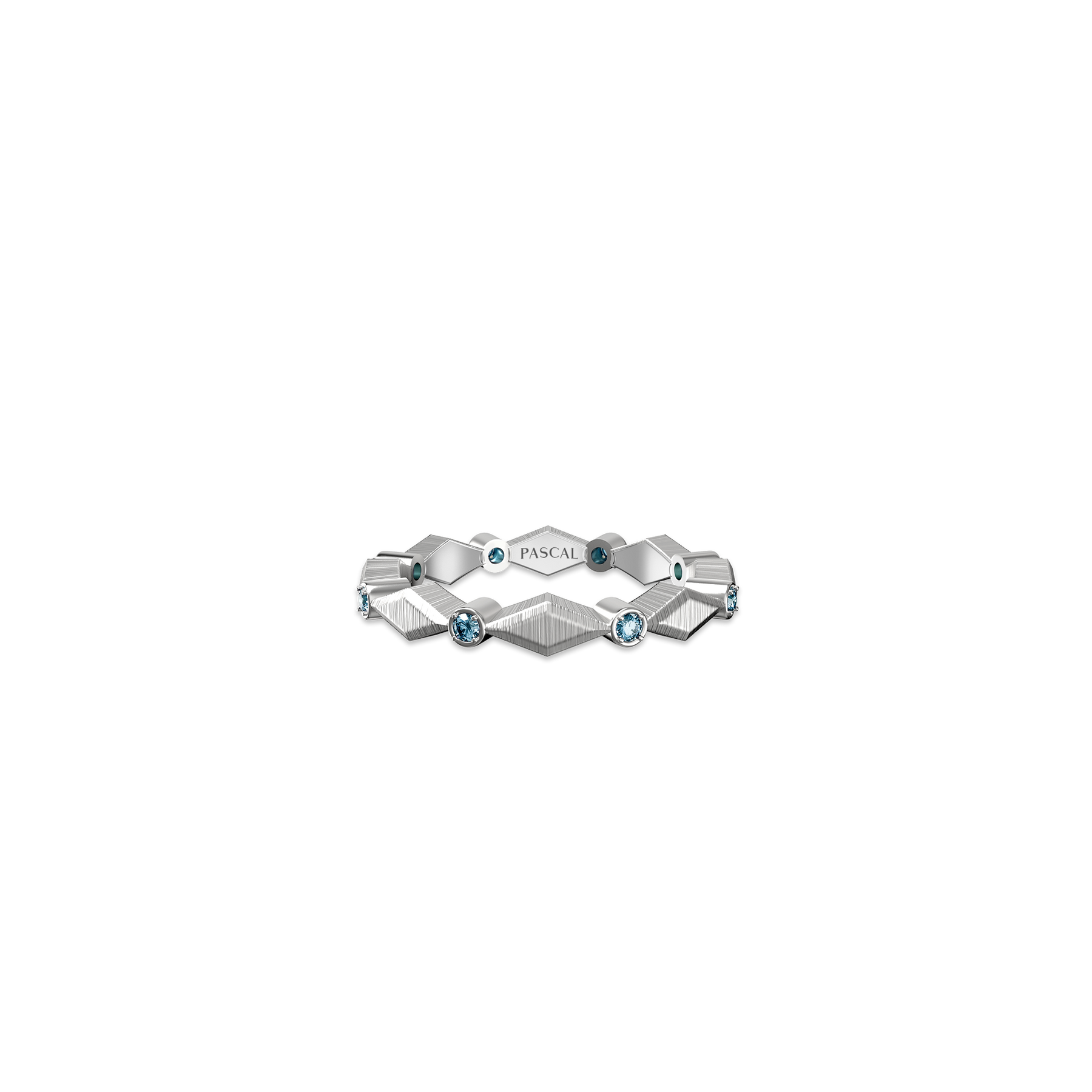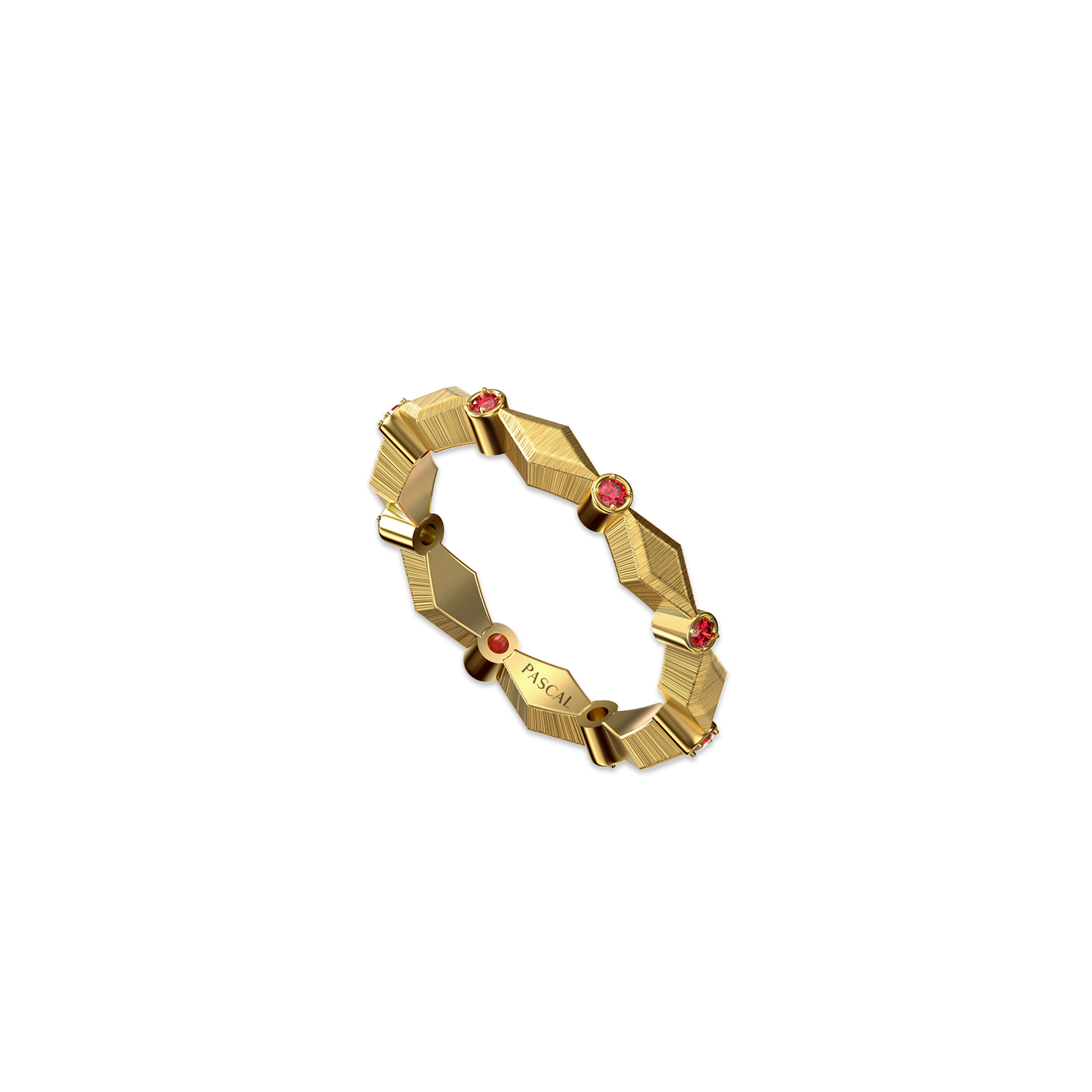 Pietre preziose colorate intervallate scintillano come stelle sparse, aggiungendo calore e vitalità alla geometria strutturata— un dialogo tra ordine ed emozione. Bilanciando struttura e ornamento, può essere indossato da solo per un'eleganza dimensionale sobria, o impilato con altre fasce per creare una composizione di tensione e armonia.