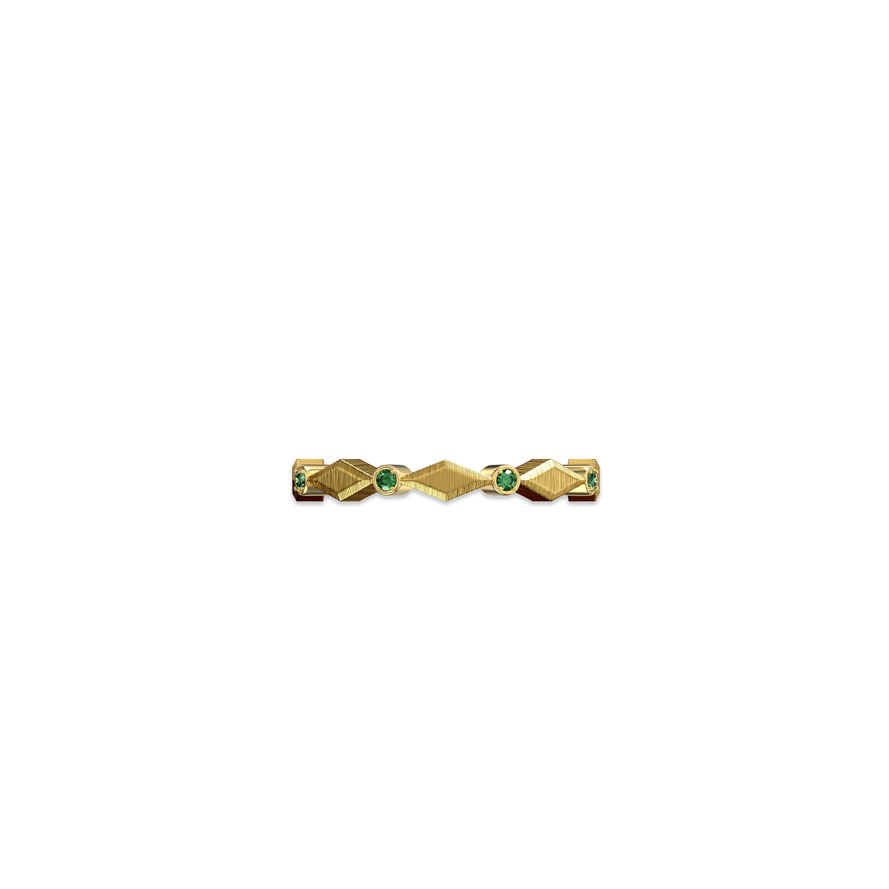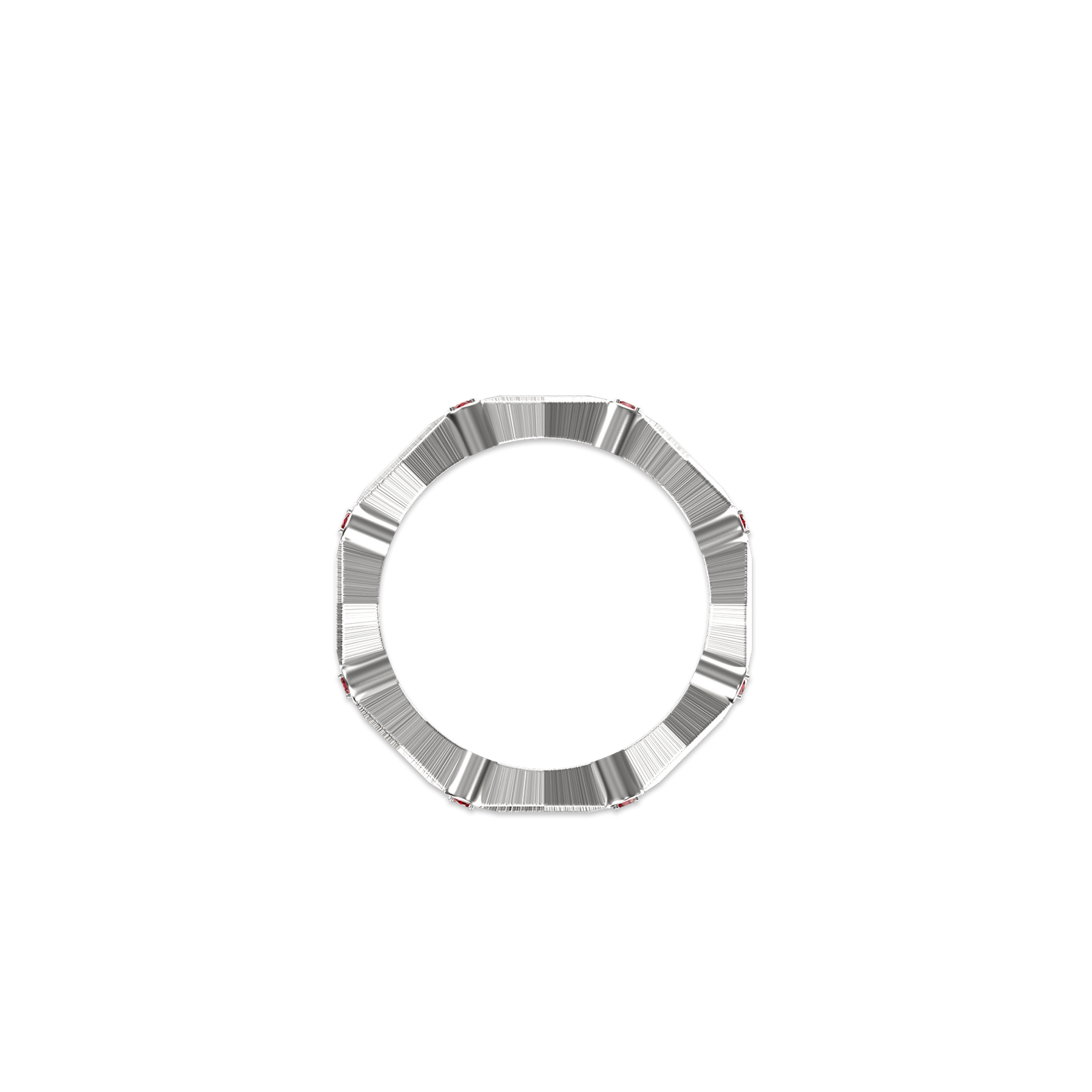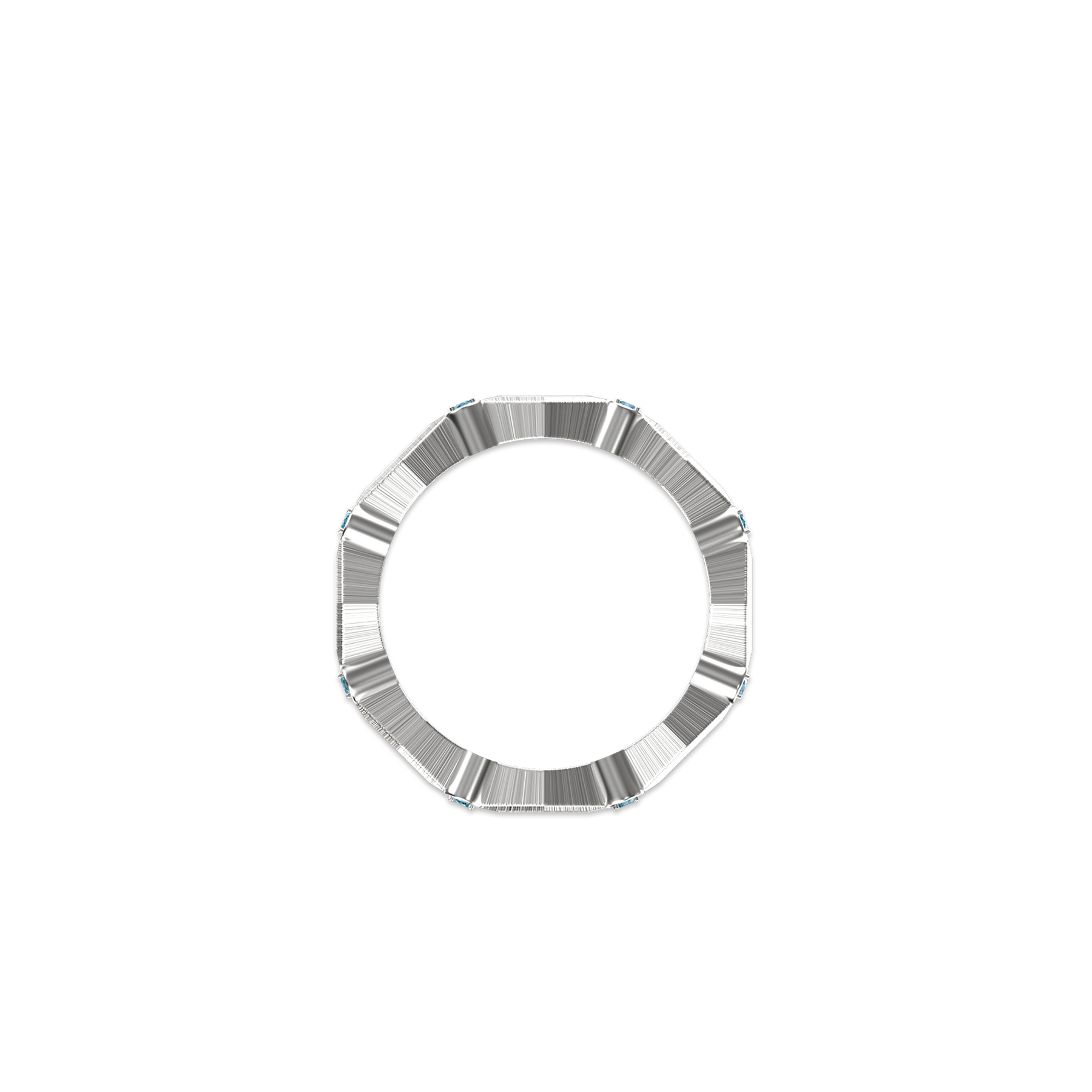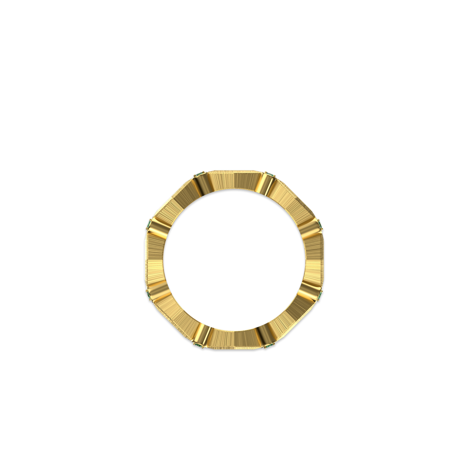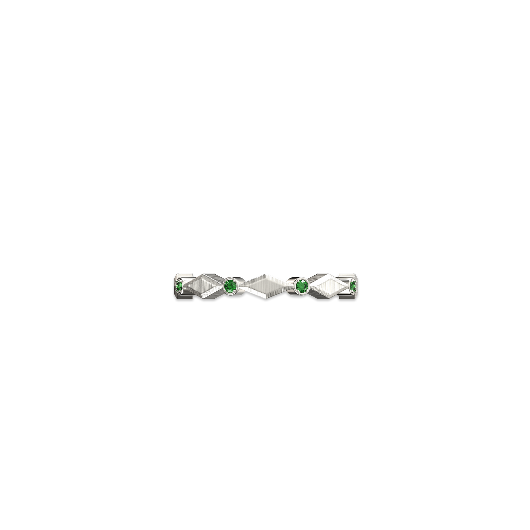 Pietre preziose colorate intervallate scintillano come stelle sparse, aggiungendo calore e vitalità alla geometria strutturata— un dialogo tra ordine ed emozione. Bilanciando struttura e ornamento, può essere indossato da solo per un'eleganza dimensionale sobria, o impilato con altre fasce per creare una composizione di tensione e armonia.