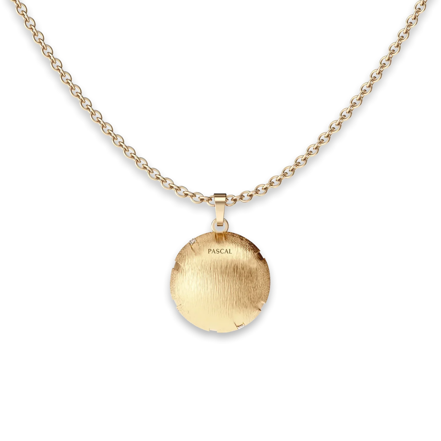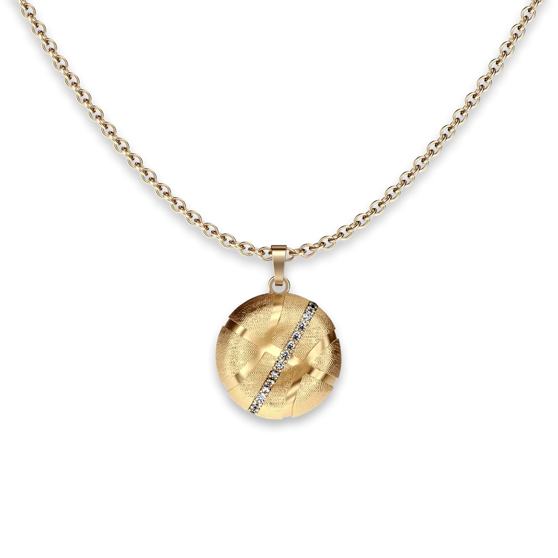 Meticolosamente dettagliato, il ciondolo ricrea la texture e le linee di cucitura caratteristiche di un pallone da basket, evocando la potenza grezza dello sport. Al centro della forma distorta, 0,204 carati di diamanti coltivati in laboratorio scintillanti sono delicatamente incastonati lungo la cucitura centrale—luccicanti come gocce di sudore, illuminando lo spirito indistruttibile all'interno.