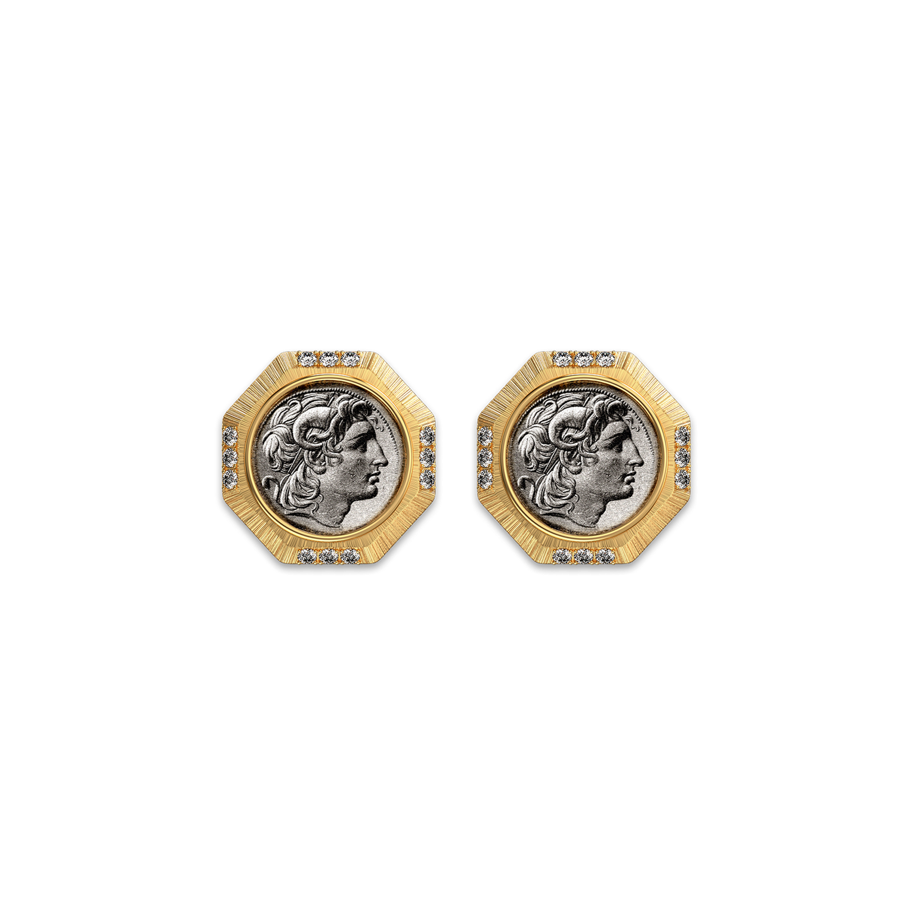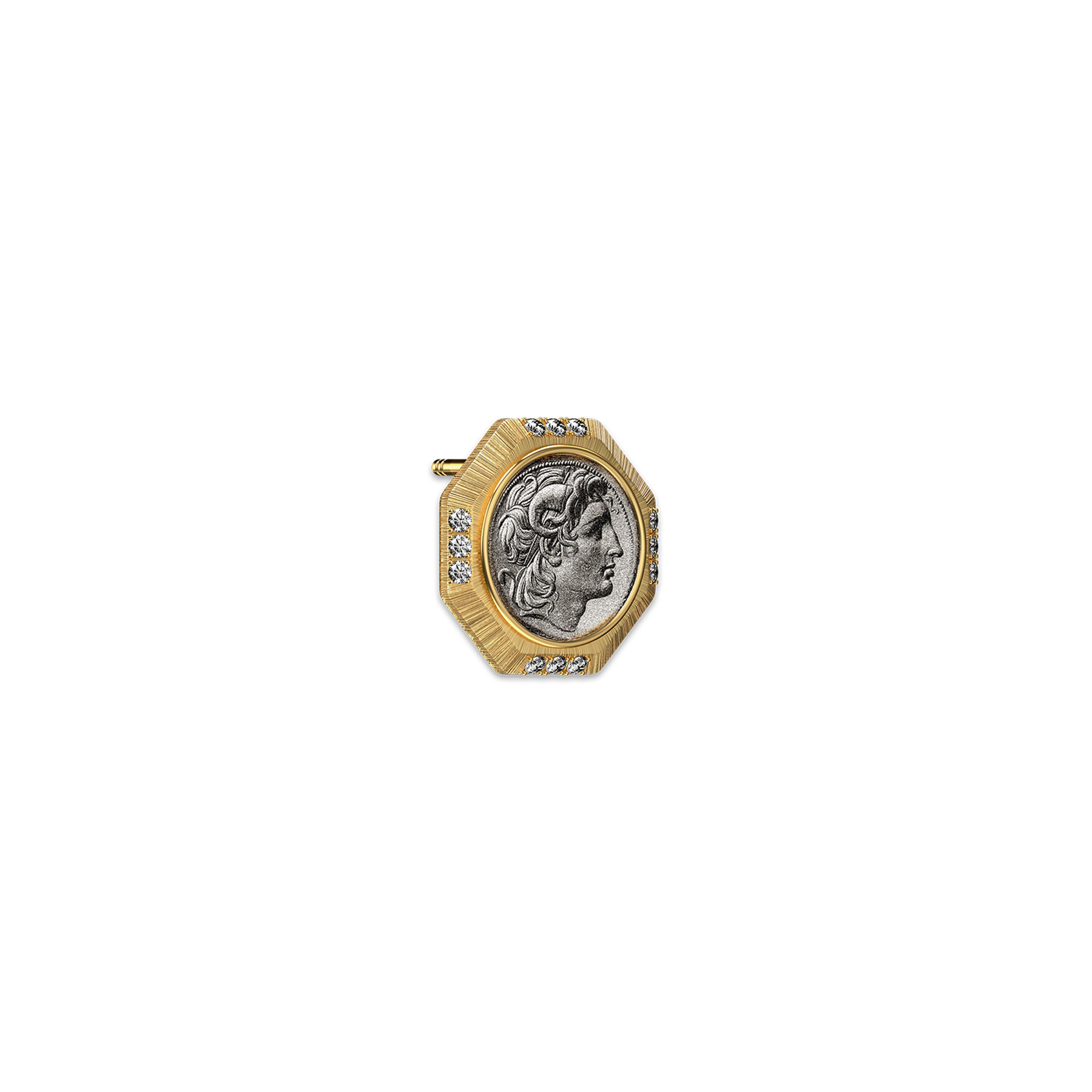 Gli orecchini presentano una cornice ottagonale spazzolata con linee pulite e precise che evocano una presenza geometrica scultorea. Diamanti coltivati in laboratorio sono incastonati lungo i bordi, scintillando alla luce e contrastando con la texture invecchiata della moneta, intrecciando eredità classica ed eleganza moderna.