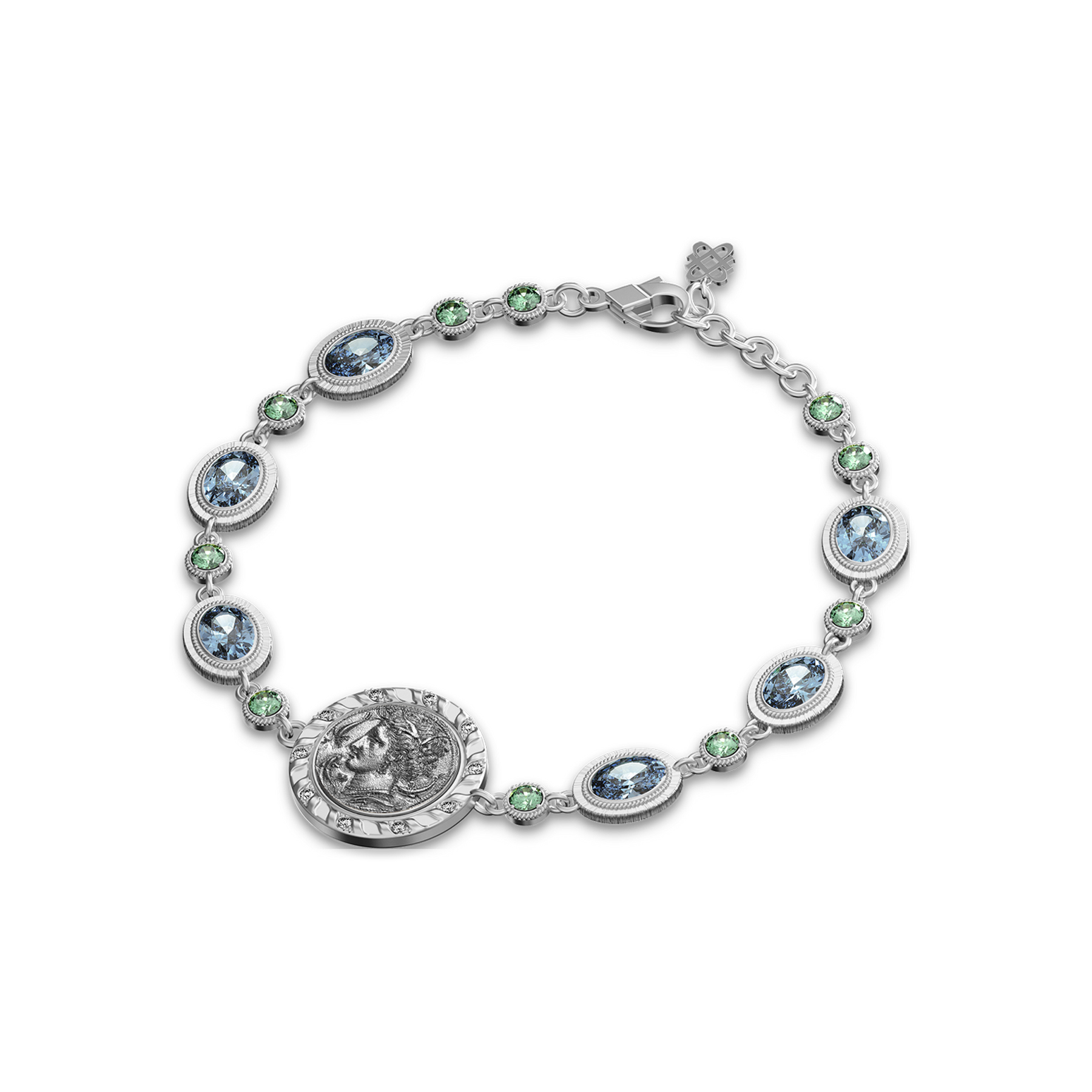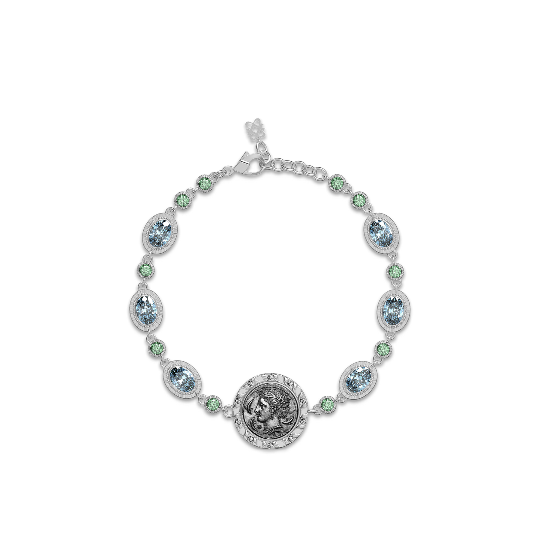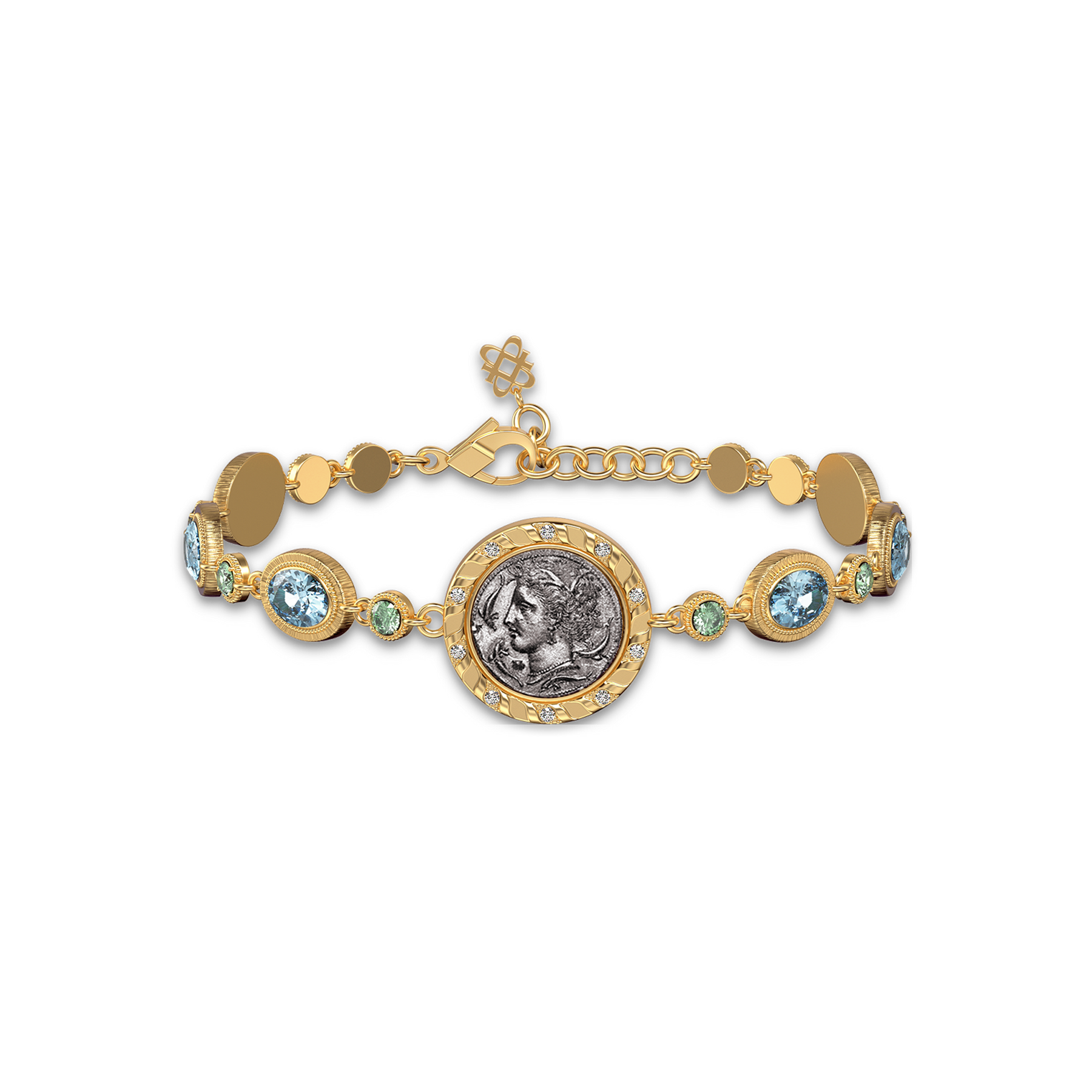 Il braccialetto presenta un design con più pietre preziose, con pietre blu e verdi coltivate in laboratorio alternate che scintillano come l'interazione di onde e sorgenti. Le pietre blu sono limpide e profonde, ricordando il Mar Mediterraneo, mentre le pietre verdi sono vivide e vivaci, evocando la vitalità dell'acqua corrente. La moneta centrale è incorniciata da una ghiera a forma di onda e accentuata da diamanti coltivati in laboratorio, dove il peso della storia incontra la brillantezza moderna.