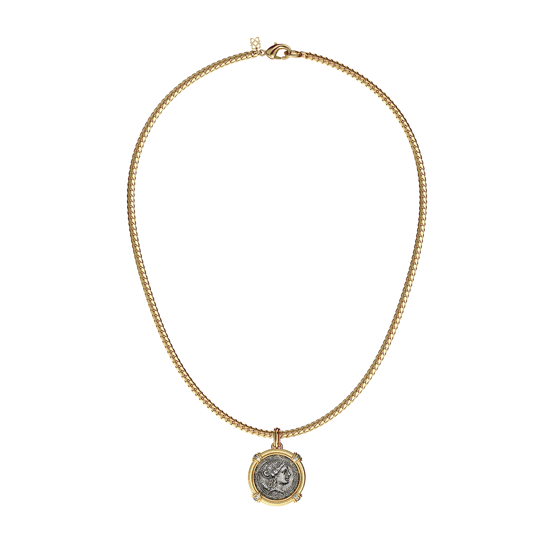 Il pendente è incorniciato in un design rotondo spazzolato, accentuato da diamanti coltivati in laboratorio in quattro punti simmetrici. Il loro splendore radiante contrasta con la texture invecchiata della moneta, mentre la catena intrecciata audace crea un equilibrio tra la grandiosità classica e la raffinatezza contemporanea.
