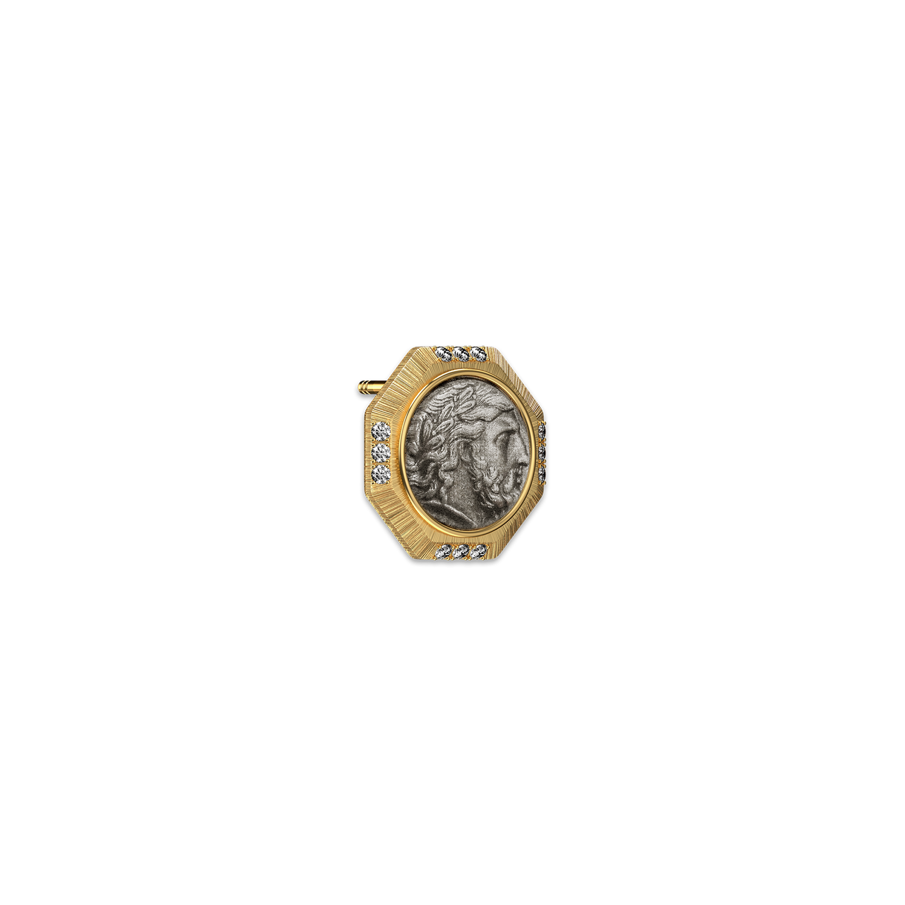 Gli orecchini sono incorniciati in un design ottagonale spazzolato, con linee pulite e precise che evocano una presenza scultorea. Diamanti coltivati in laboratorio sono incastonati lungo i bordi, scintillando alla luce e mettendo in risalto la texture invecchiata della moneta, creando un dialogo unico tra grandiosità classica e raffinatezza moderna.