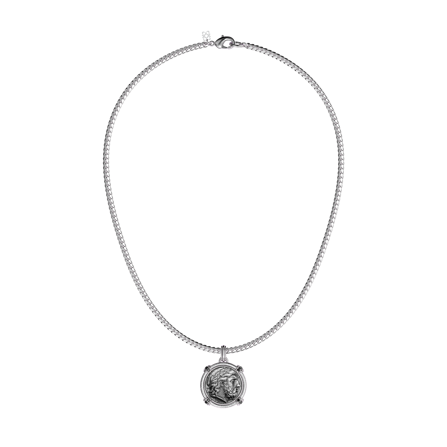 Questo pendente è ispirato a Zeus, il re degli dei nella mitologia greca antica. Al centro si trova una moneta d'argento con il profilo dignitoso di Zeus, simbolo di suprema autorità, ordine e potere divino. Come capo dei dodici dèi olimpici, Zeus non era solo il sovrano del cielo e del tuono, ma anche l'incarnazione della regalità e della protezione.