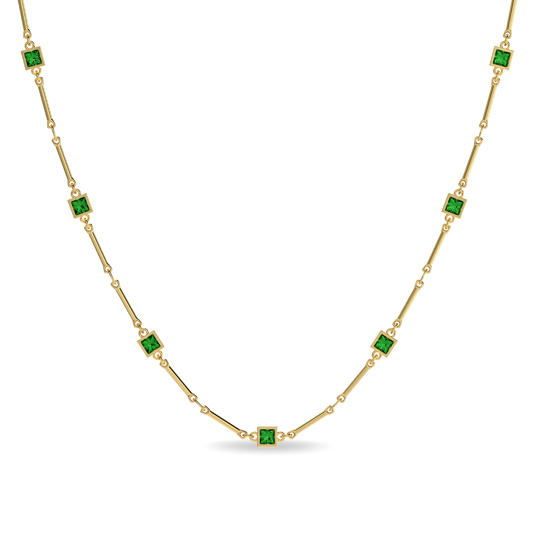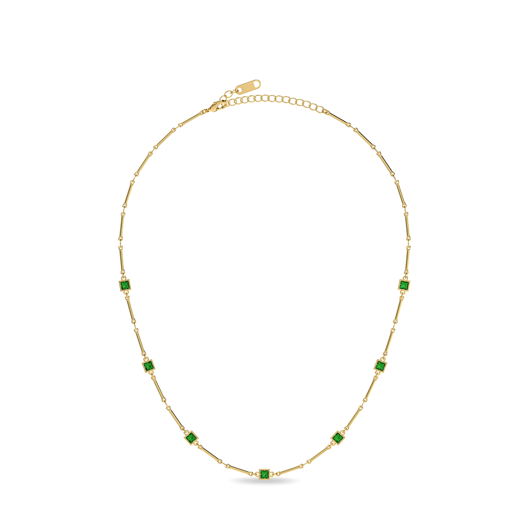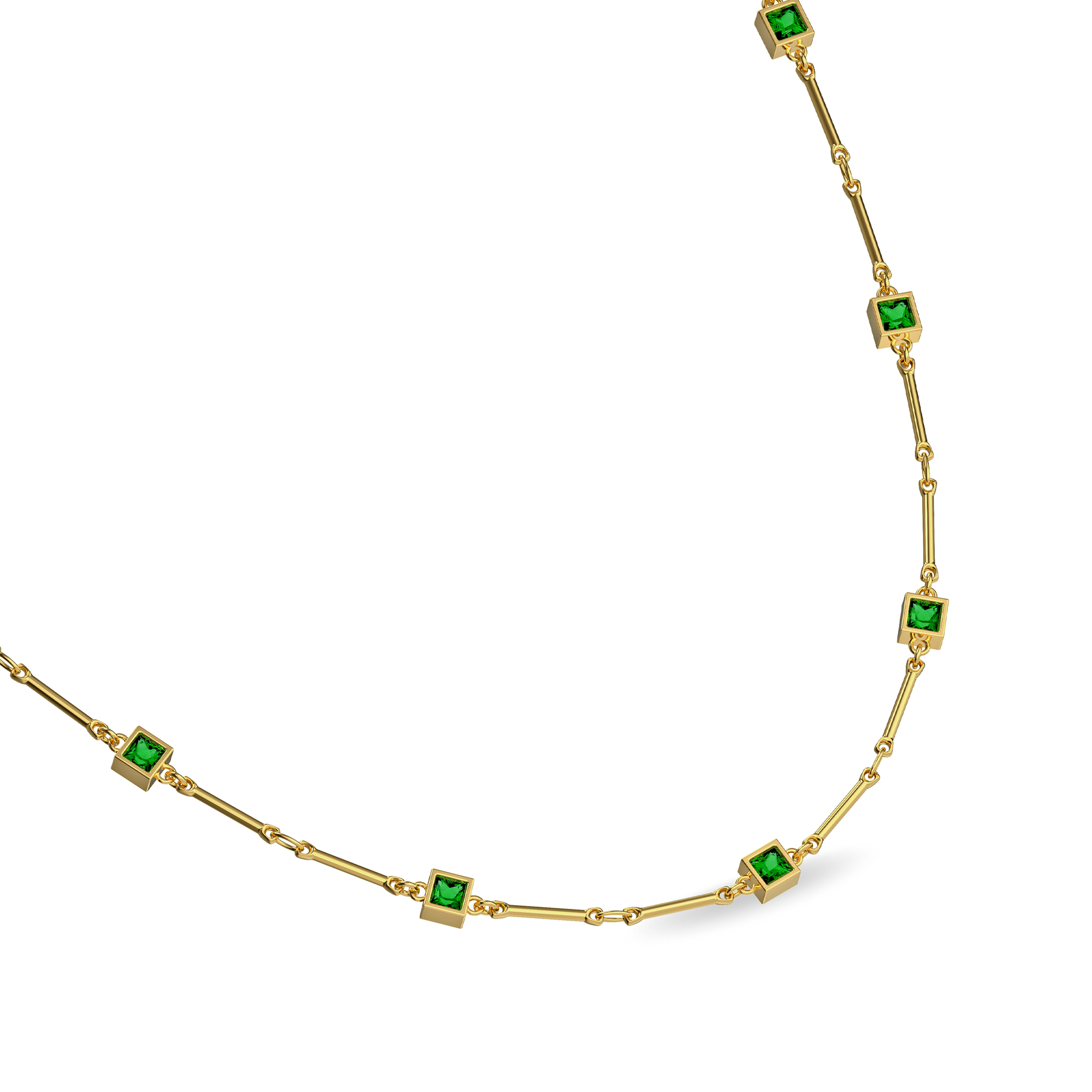 This necklace is defined by a slender chain punctuated with evenly spaced geometric gemstones, creating a refined rhythm along the neckline. The measured placement introduces structure while preserving a sense of lightness and flow.