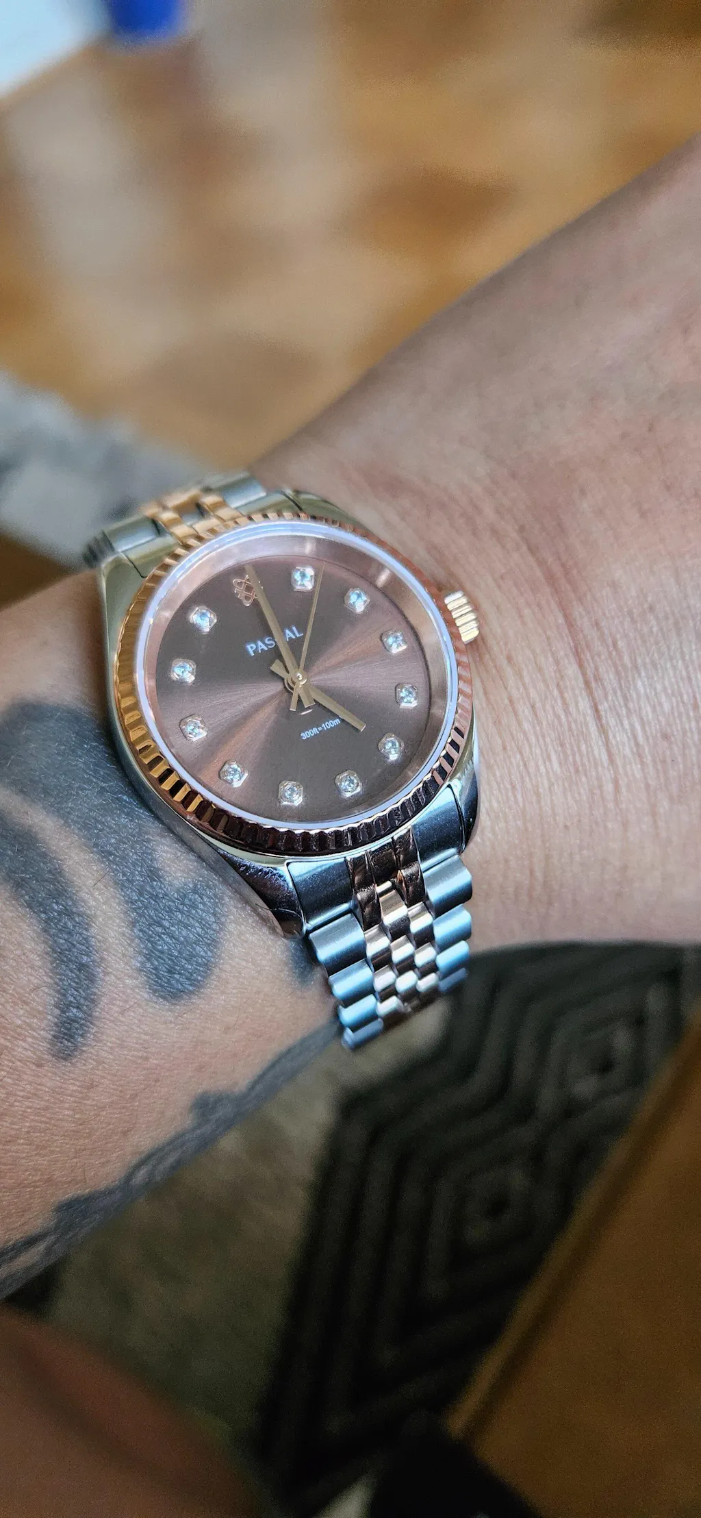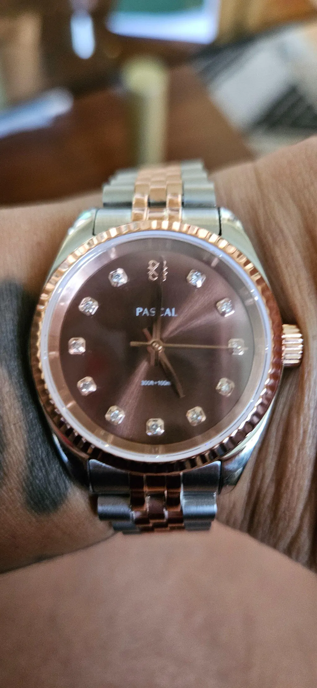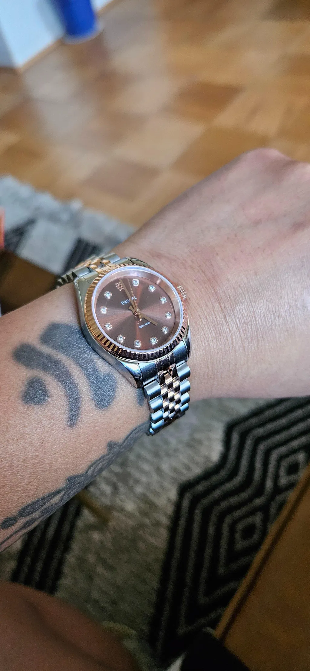 Embraces the richness of chocolate-toned metal, making a bold statement of refinement and indulgence. But what truly elevates this timepiece is the exquisite sunburst pattern meticulously carved around the dial's periphery. Each stroke embodies the essence of the sun, infusing the watch with timeless allure.