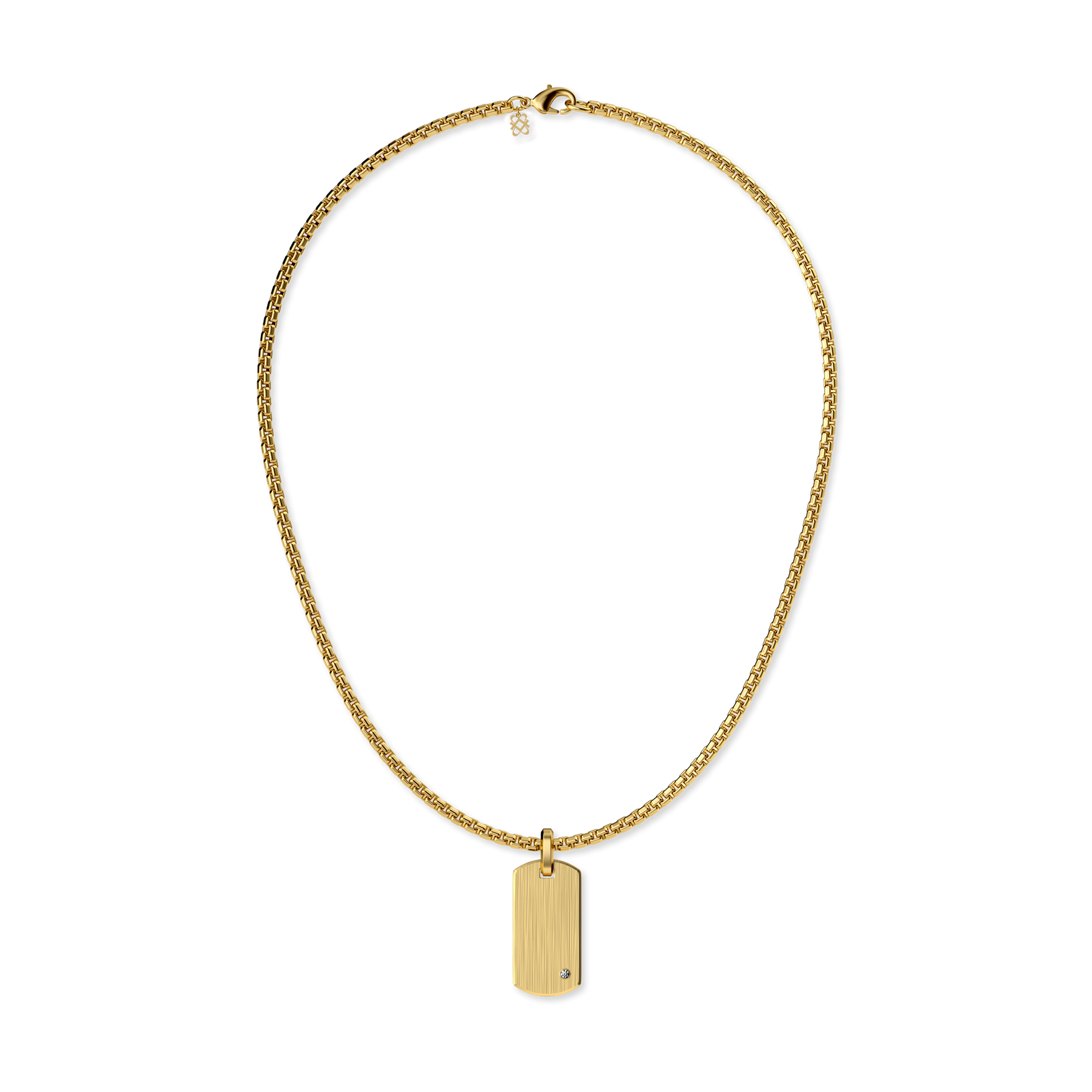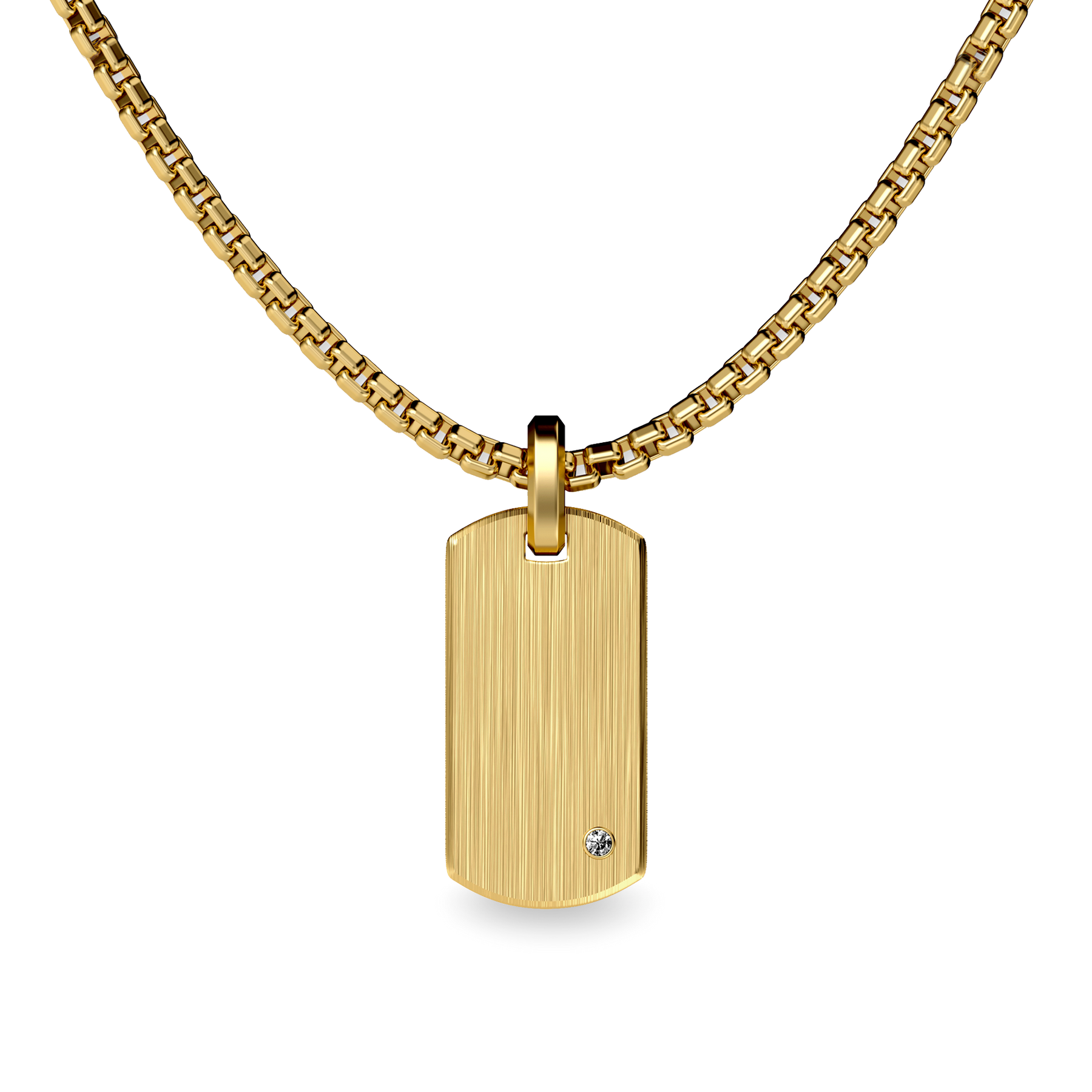 This dog tag pendant features a sleek rectangular silhouette with a refined brushed texture, giving it a subtle yet bold character. A brilliant lab-grown diamond is set on the front, adding a touch of radiance to its understated design. The back is left with a dedicated area for personalization—perfect for engraving a name, date, or meaningful message to create a piece that is truly your own.