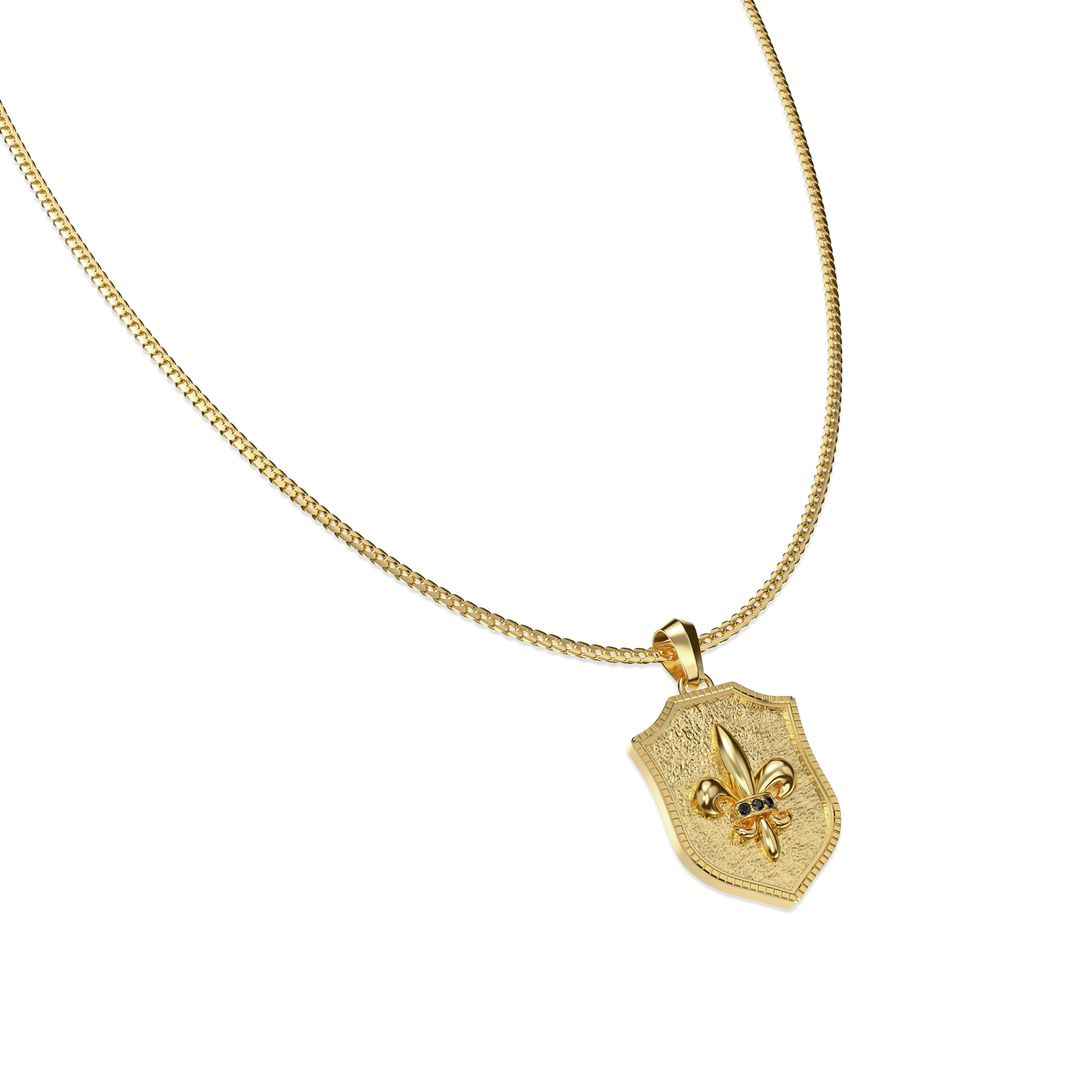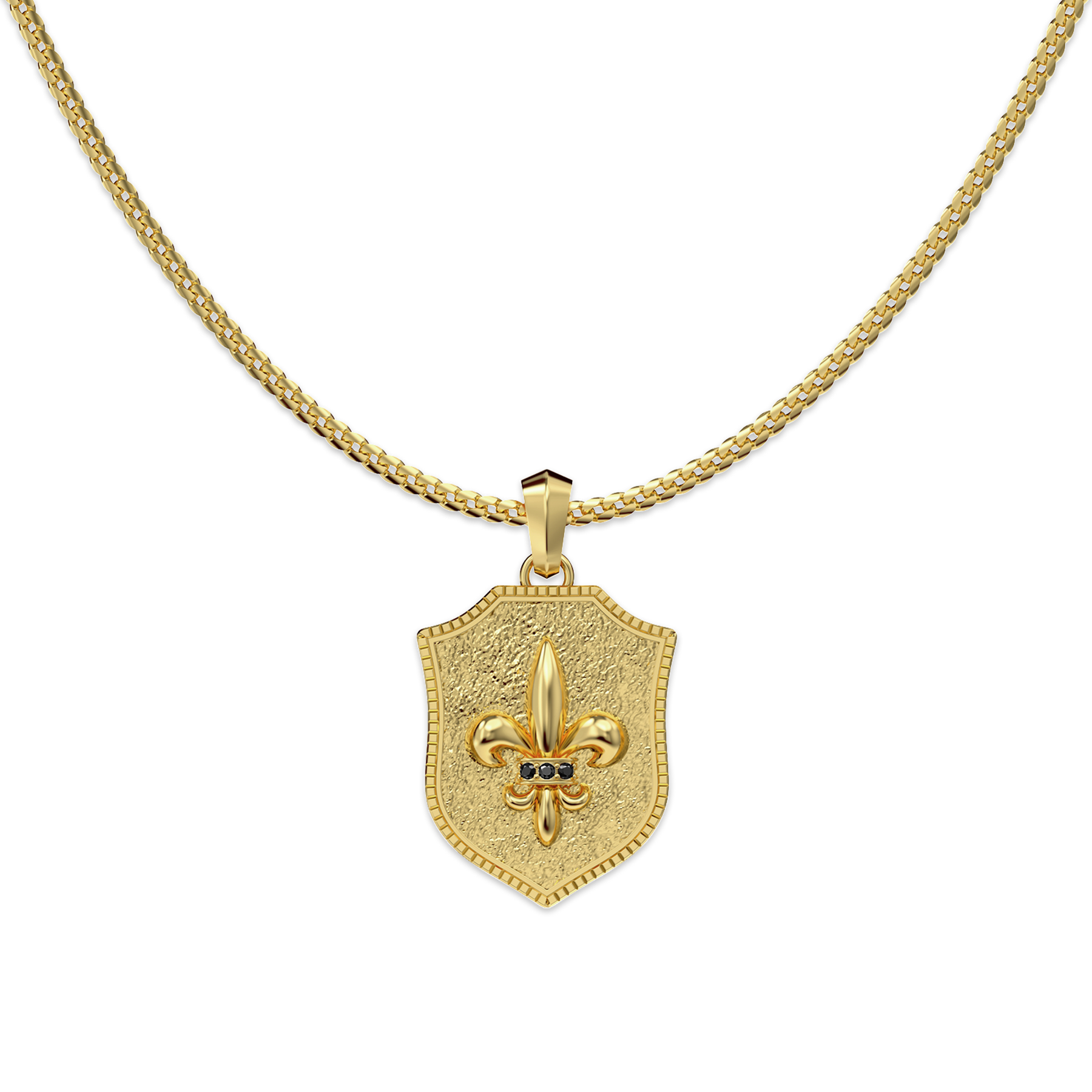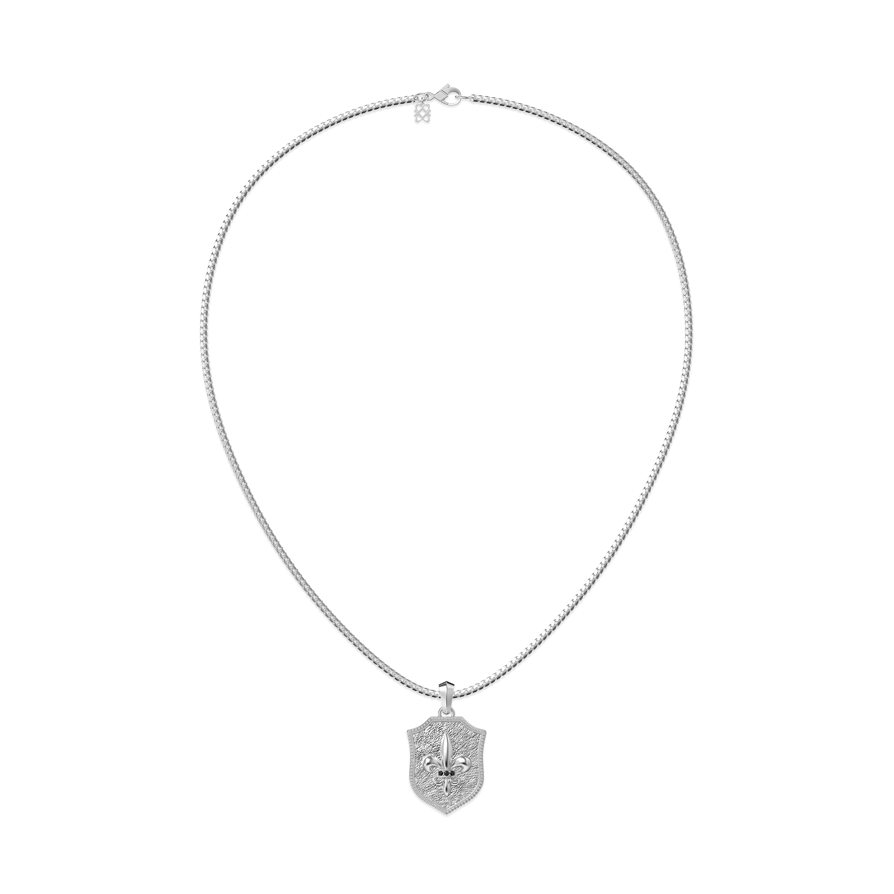 Inspired by medieval heraldry, this necklace distills strength, protection, and conviction into a refined shield-shaped pendant. The clean, structured silhouette is framed by layered edges, while the raised fleur-de-lis motif at the center symbolizes purity, honor, and unwavering inner belief.