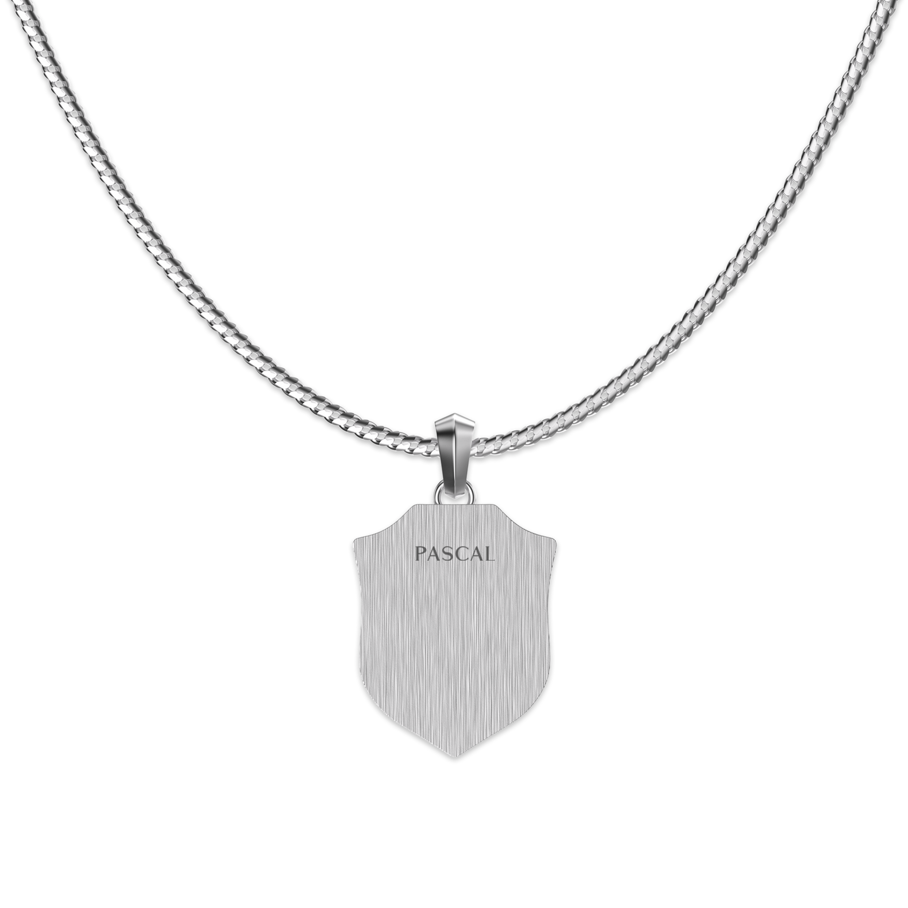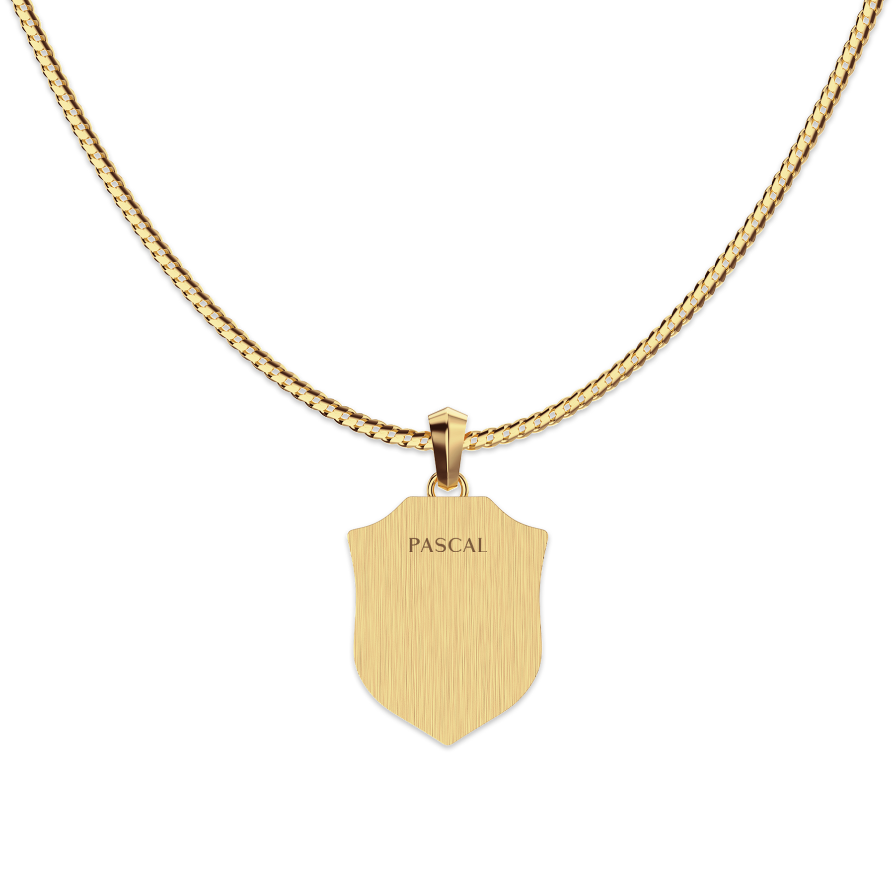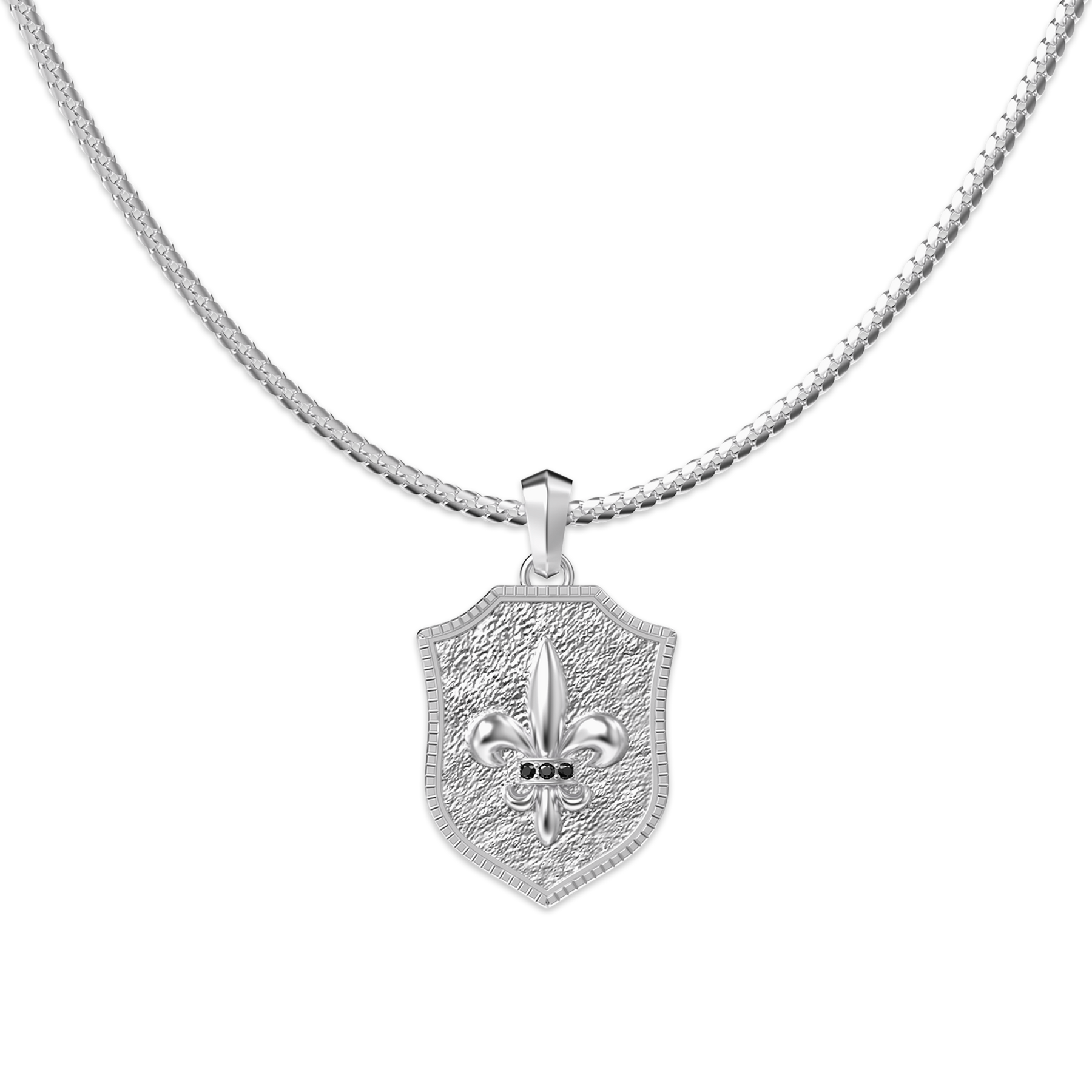 Inspired by medieval heraldry, this necklace distills strength, protection, and conviction into a refined shield-shaped pendant. The clean, structured silhouette is framed by layered edges, while the raised fleur-de-lis motif at the center symbolizes purity, honor, and unwavering inner belief.