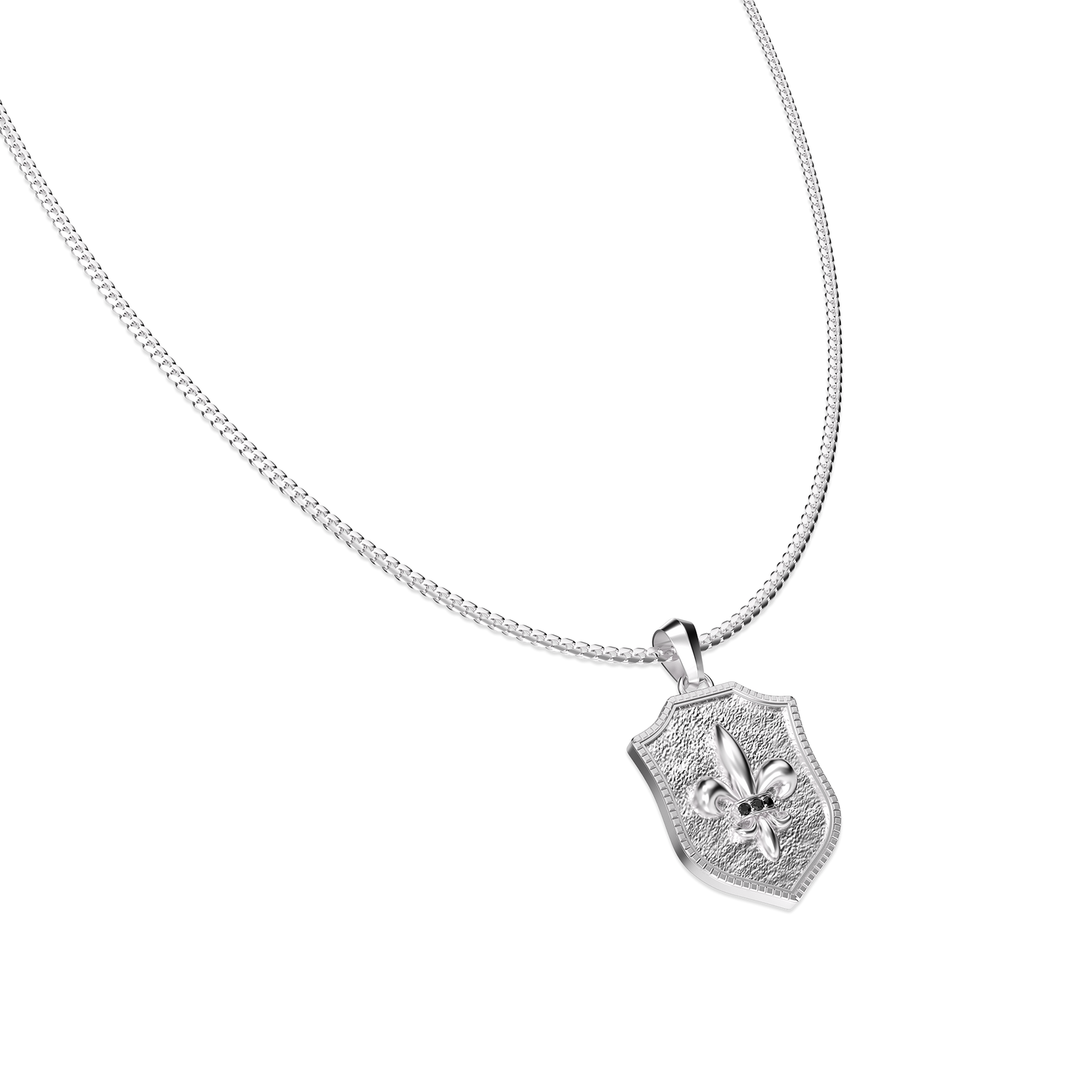 The pendant features a delicately textured, sand-finished surface that creates subtle depth as light moves across it. At the heart of the fleur-de-lis, a 0.018 ct lab-grown black diamond is set, its deep tone forming a restrained yet powerful contrast against the polished metal.