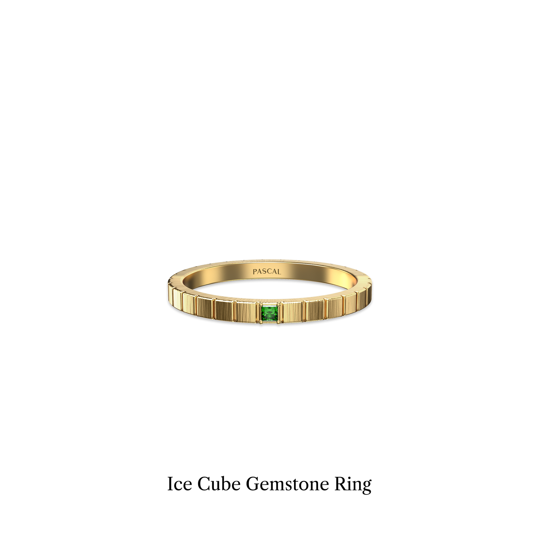 The primary band features a clean, polished surface accented by a 0.26ct lab-grown gemstone, set vertically to emphasize balance and confidence. Its vivid hue adds a refined focal point while maintaining a modern, minimal aesthetic. Paired with a slimmer, textured companion band featuring a subtle gemstone detail, the set creates a thoughtful contrast between strength and delicacy.