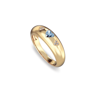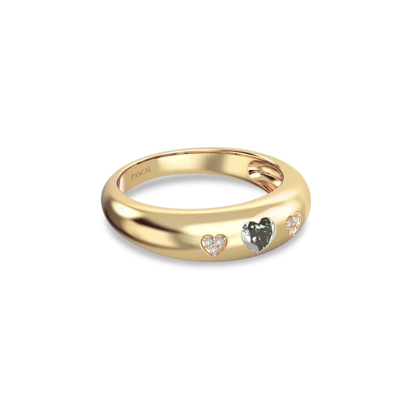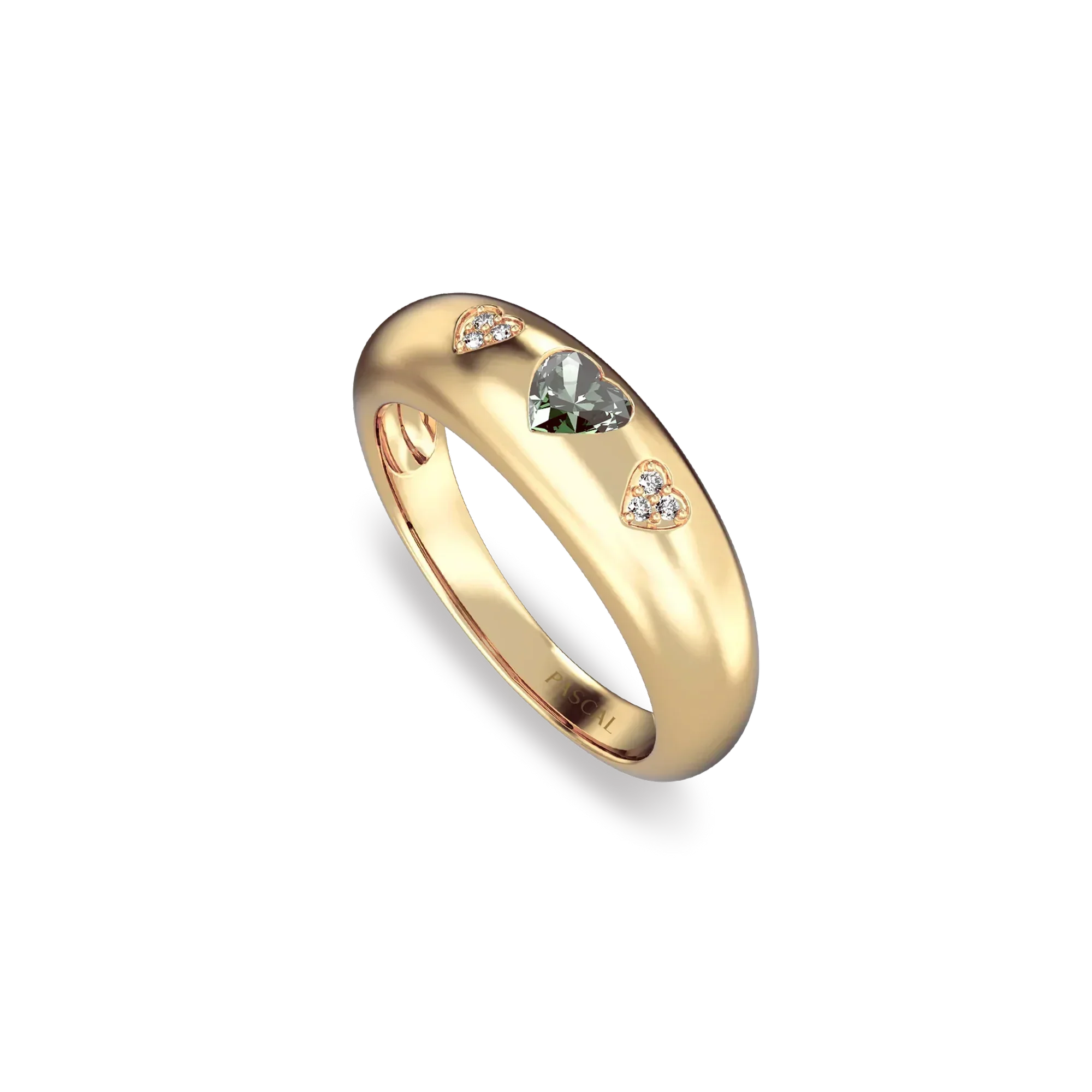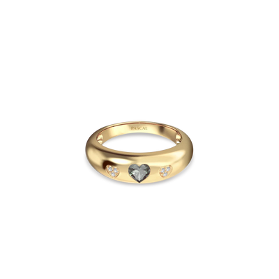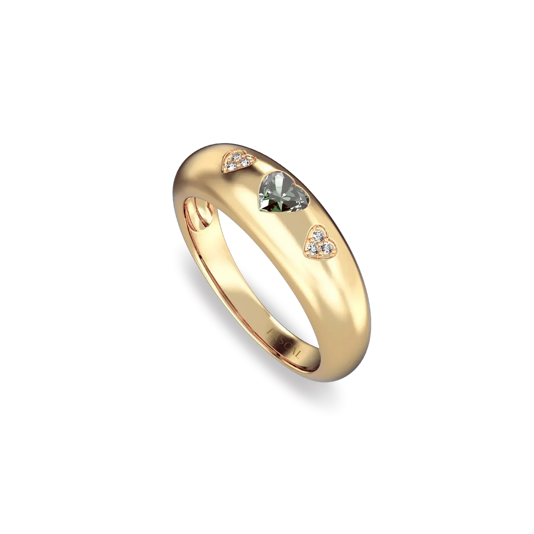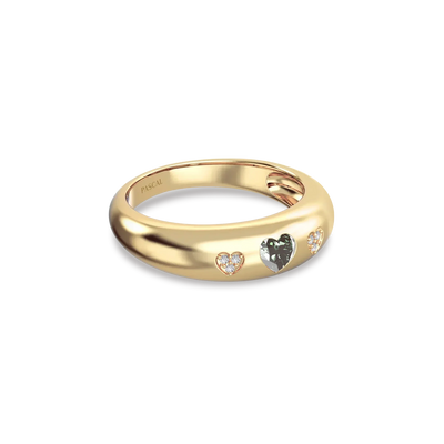 This dome ring features a heart-shaped element, with two small hearts set with charming diamonds on either side of the central heart-shaped gemstone, representing protection and symbolizing a happy relationship.The full-textured gradient ring shape and the embellishment of sparkling diamonds show the unique charm and personality of the fingers.